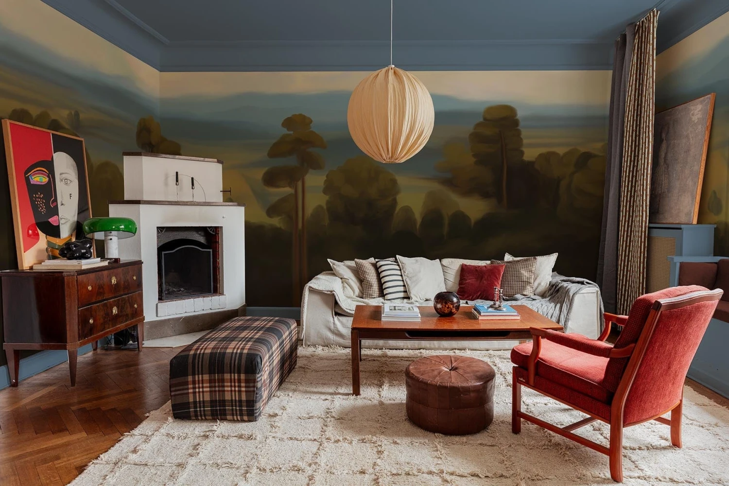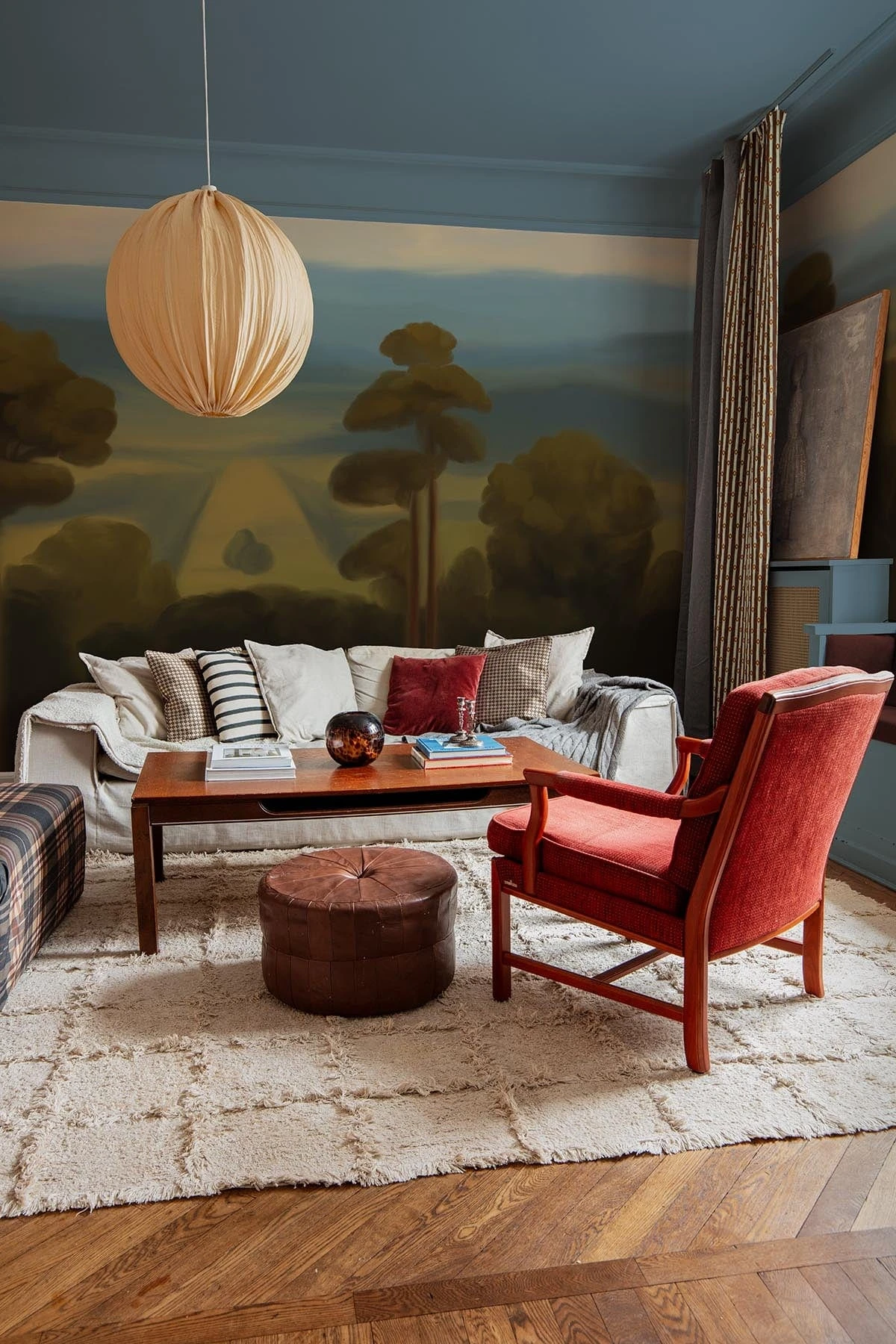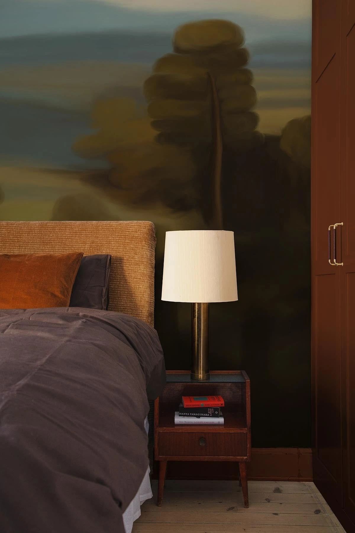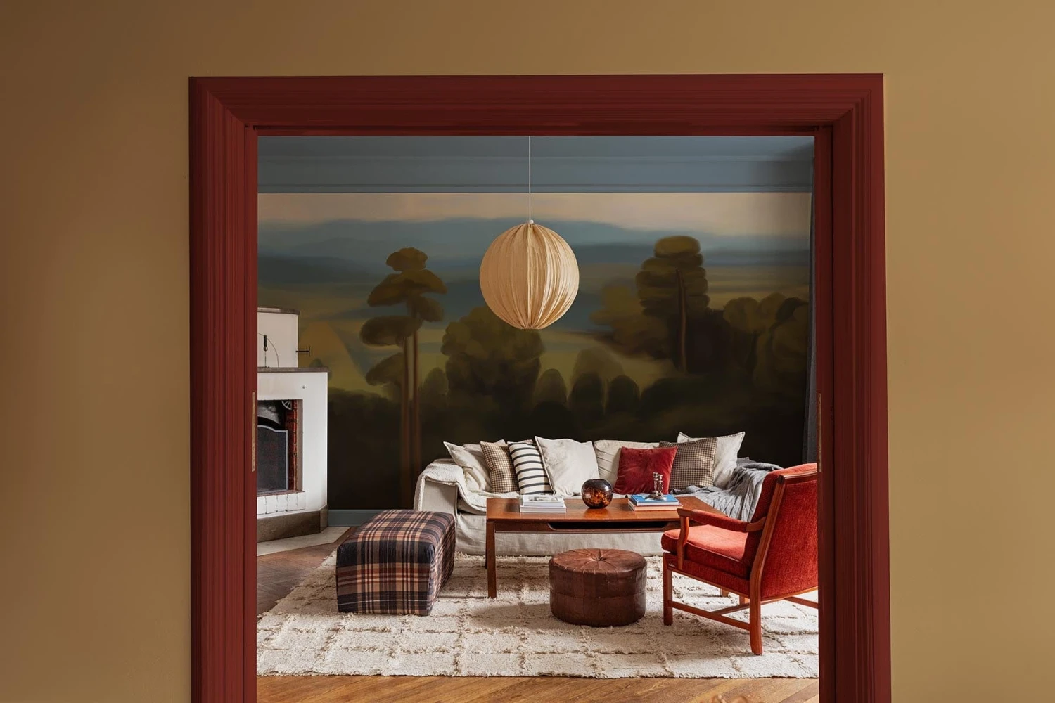 Green Serenade wall mural in olive green is a hand painted, tranquil forest setting. The muted green colors bring serenity to any room. Here, artist Estelle Graf has drawn inspiration from country roads and landscapes that fleetingly appear as you travel through nature—a place that feels both familiar yet never seen before. The wall mural creates a feeling of serenity and reflection, with a timeless beauty that complements both modern and classic interiors