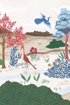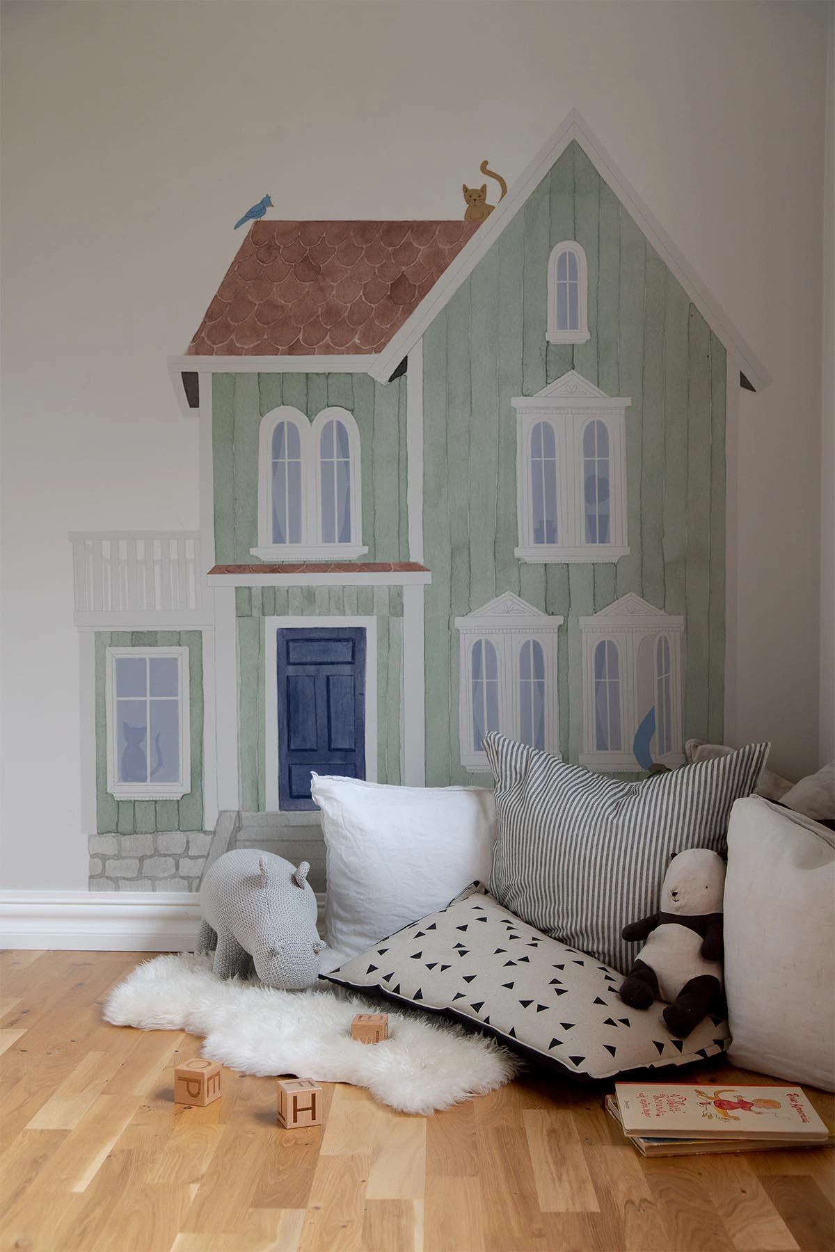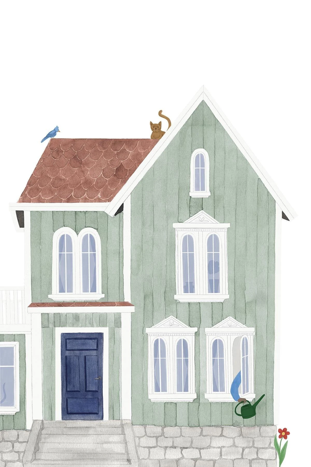 A large traditional Scandinavian tree house, hand painted as an art piece in aquarelle. At first glance it might seem empty but can you find the creatures living in the house and what objects can you find in the windows?