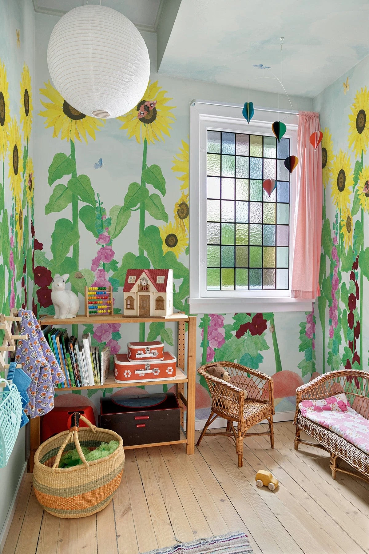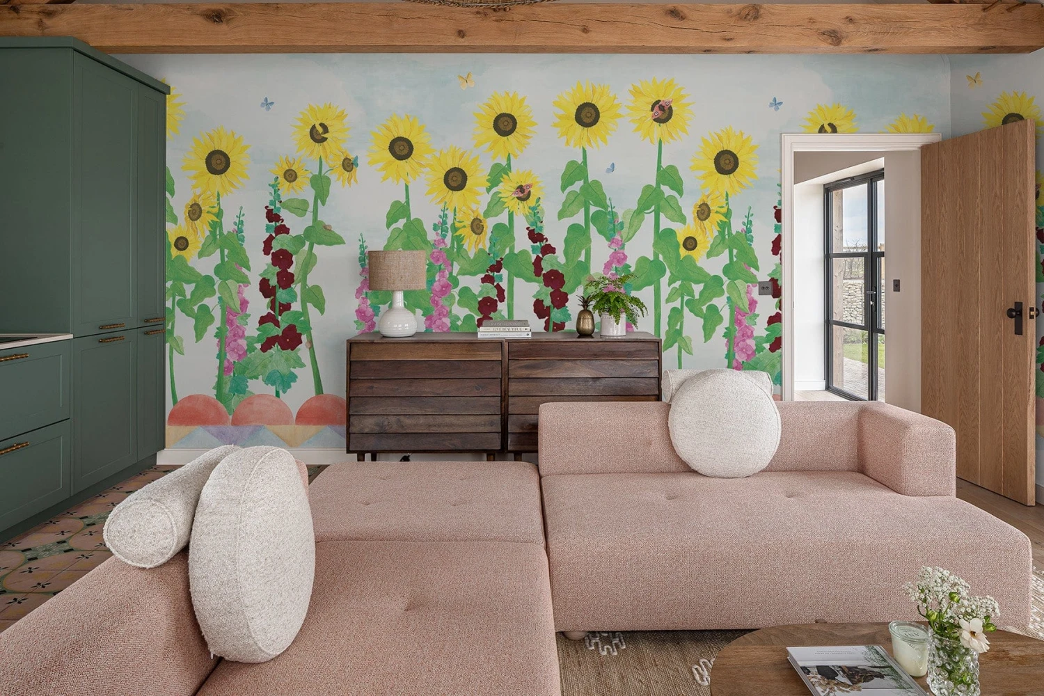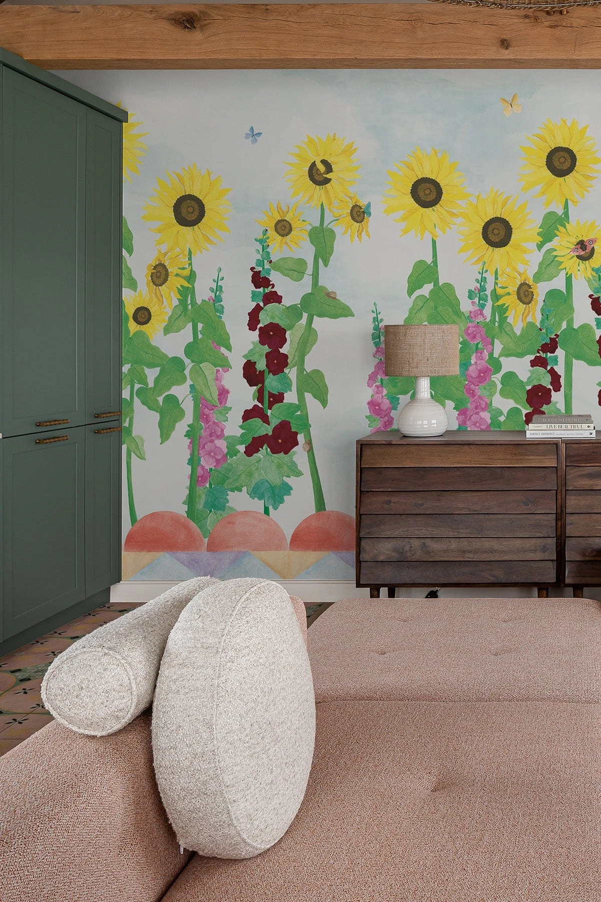 A quiet harmony lives in In Our Garden perfect day. With its serene sky base and flourishing greenery, it captures the atmosphere of a secret garden at dawn, gentle, layered, and full of hidden life. Inspired by the way the Bloomsbury artists made beauty part of everyday life, this mural invites peaceful reflection and playful storytelling