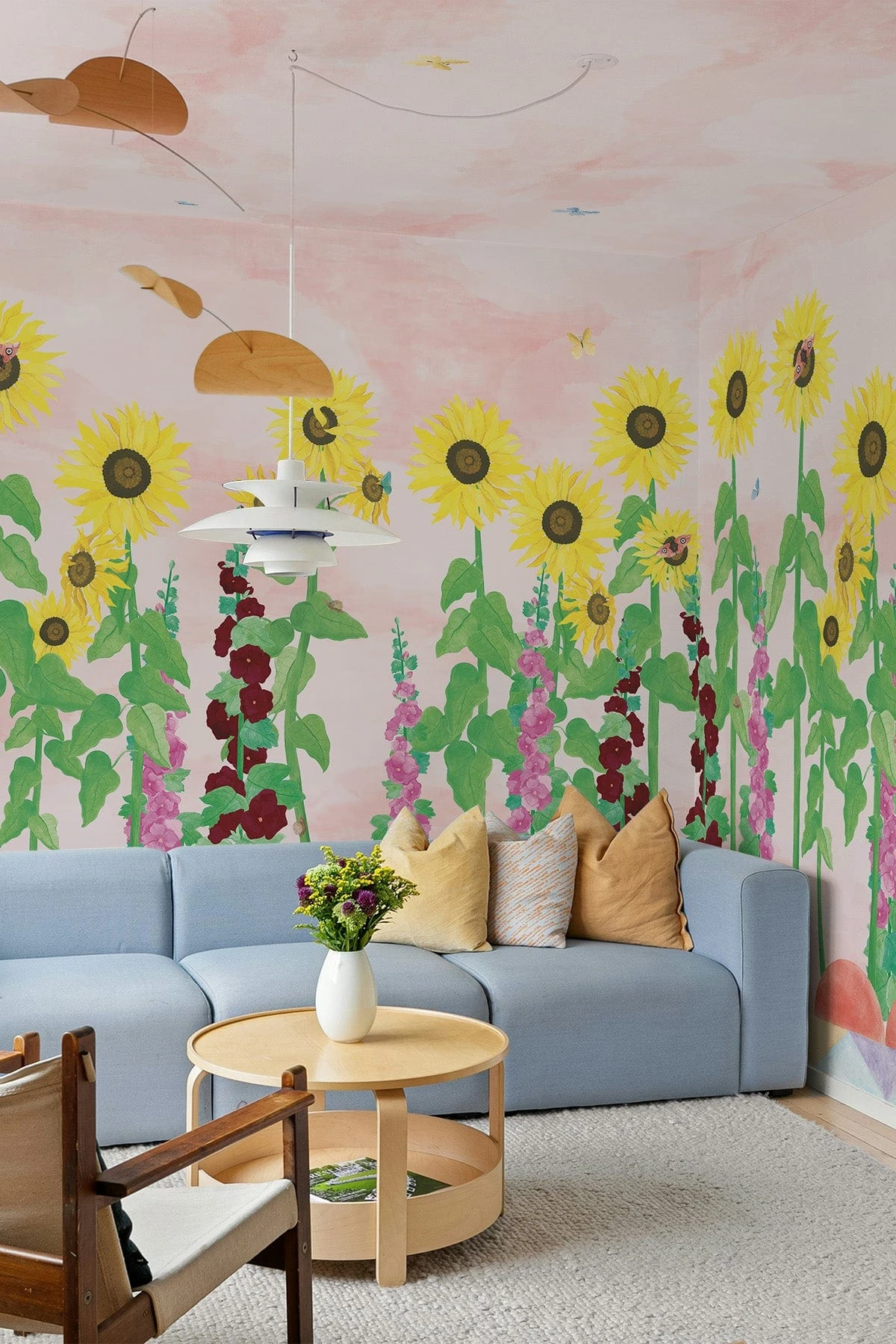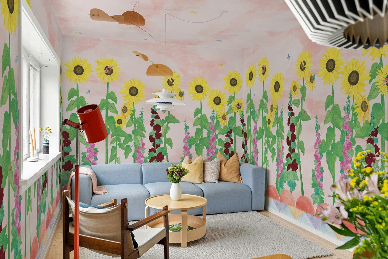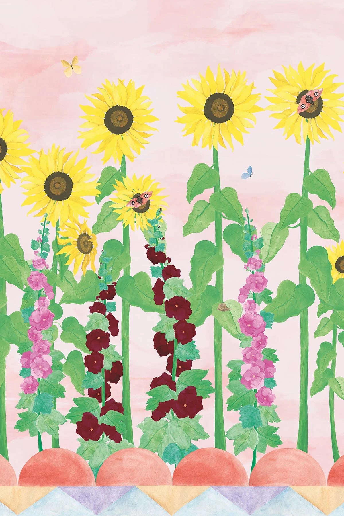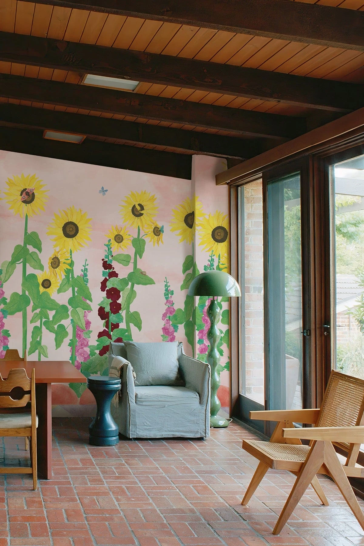 Step into a world where nature grows wild and beauty feels personal. This is a garden left to its own rhythm, where color leads the way. The wall mural echoes Charleston’s fearless spirit, where blooms, brushstrokes and daily life merged into one. Sunflowers rise through foliage like lines from a painted poem, butterflies drift by, and a soft blush hue envelops the space in quiet wonder. A tribute to free expression, bold combinations, and the beauty of an artful mess