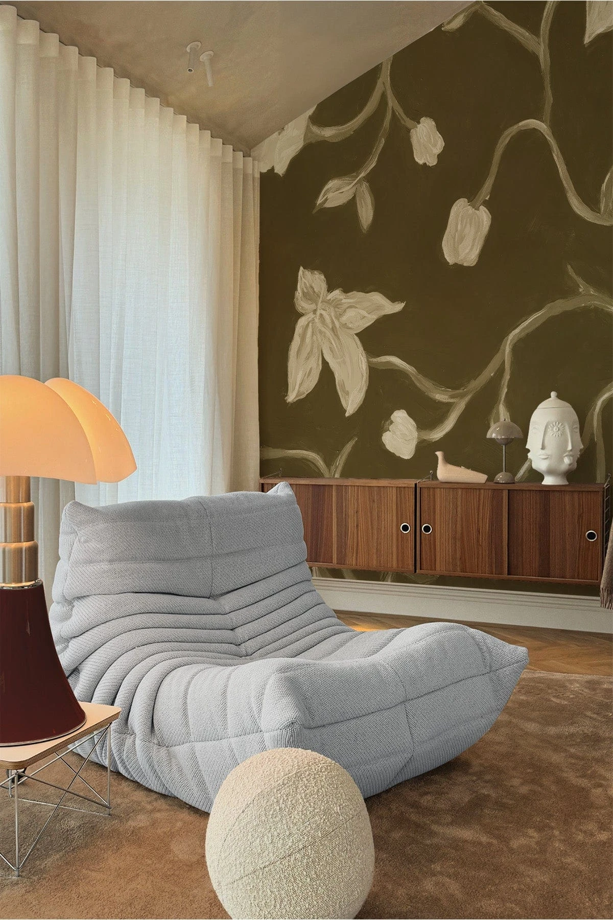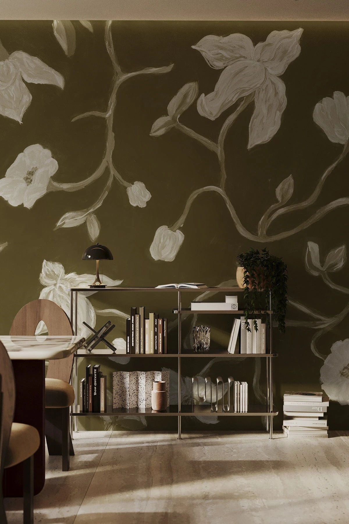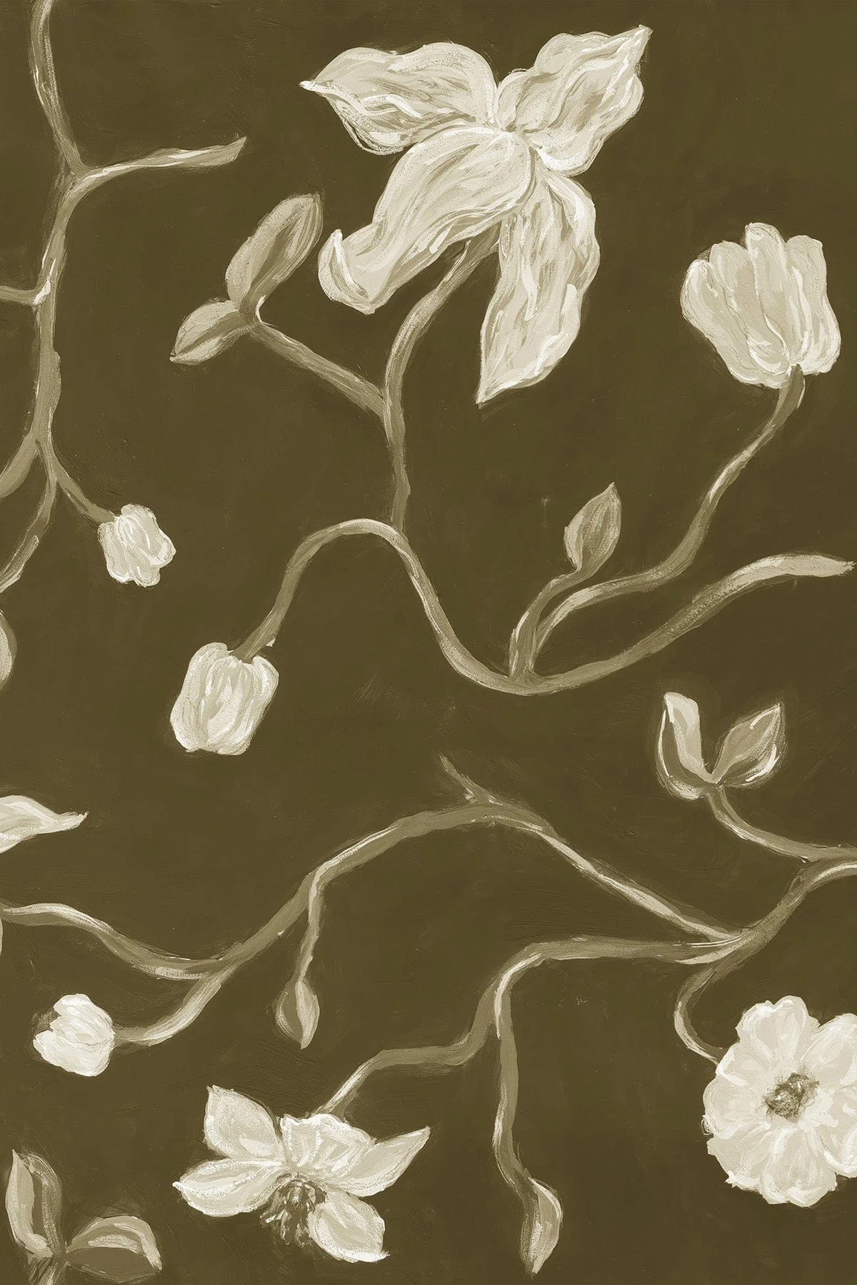 Bring nature indoors with the Iris Garden wall mural in olive. Delicate yet bold, oversized hand-drawn floral branches stretch across the wall with a natural flow, creating a soothing atmosphere with luxurious elegance. The soft olive palette adds a fresh, earthy tone that complements both contemporary and traditional spaces.