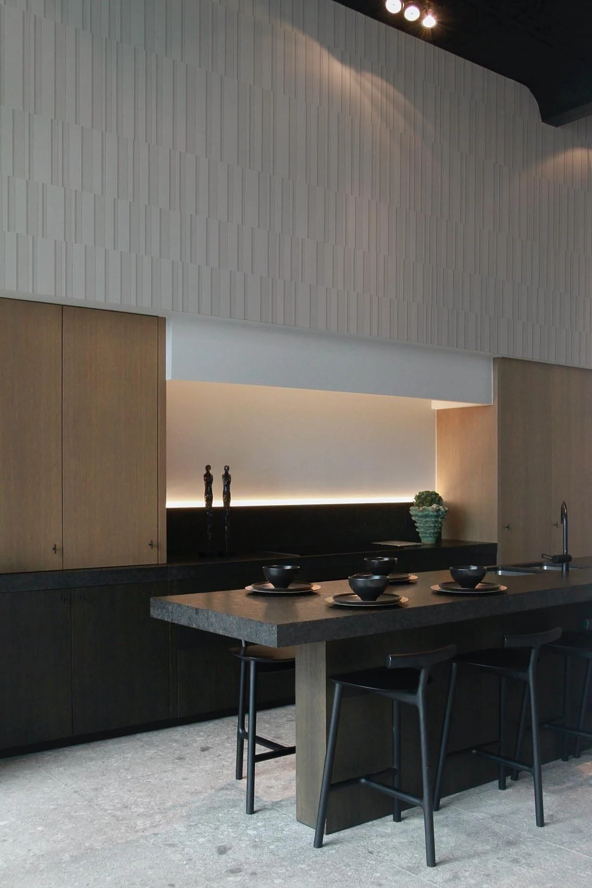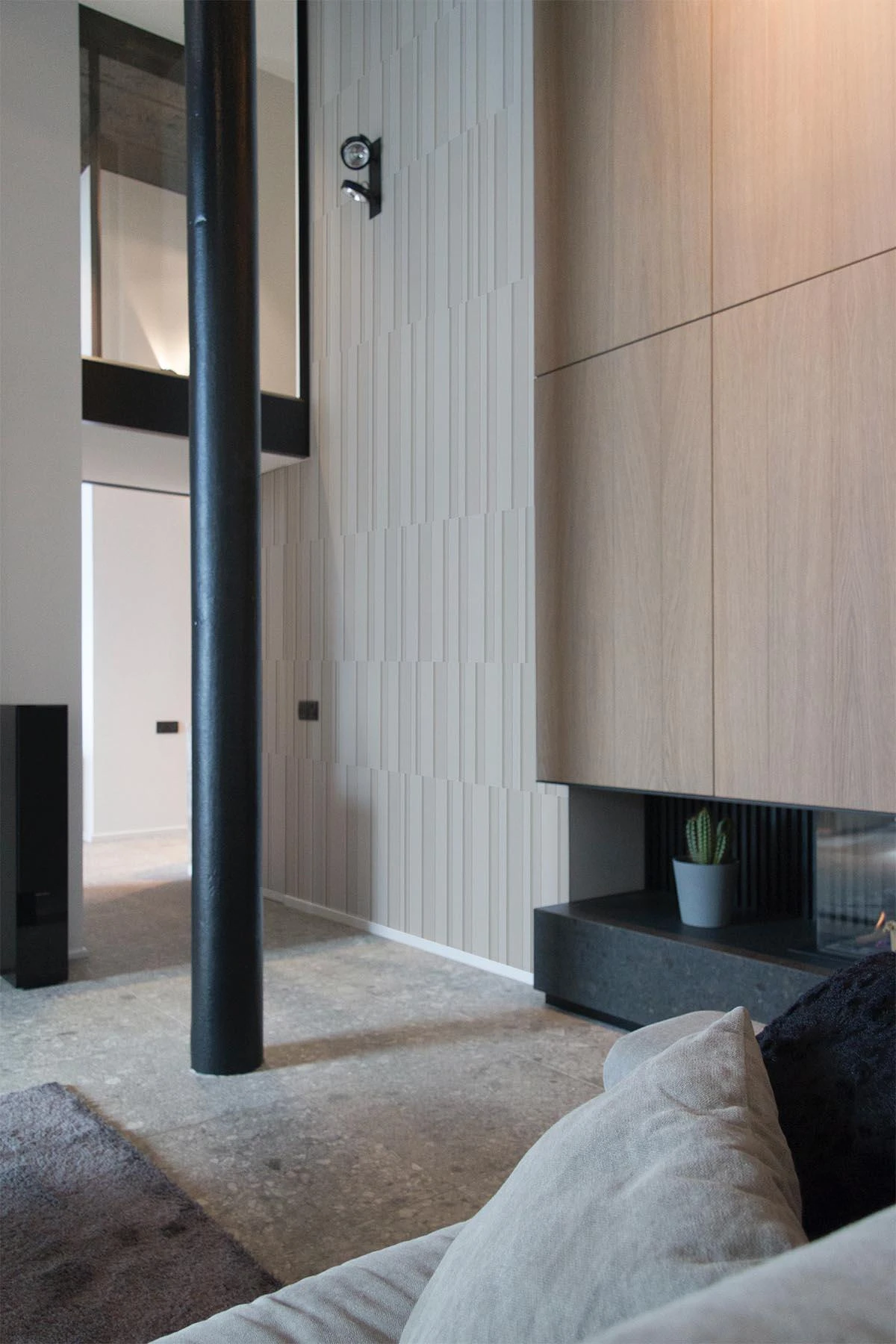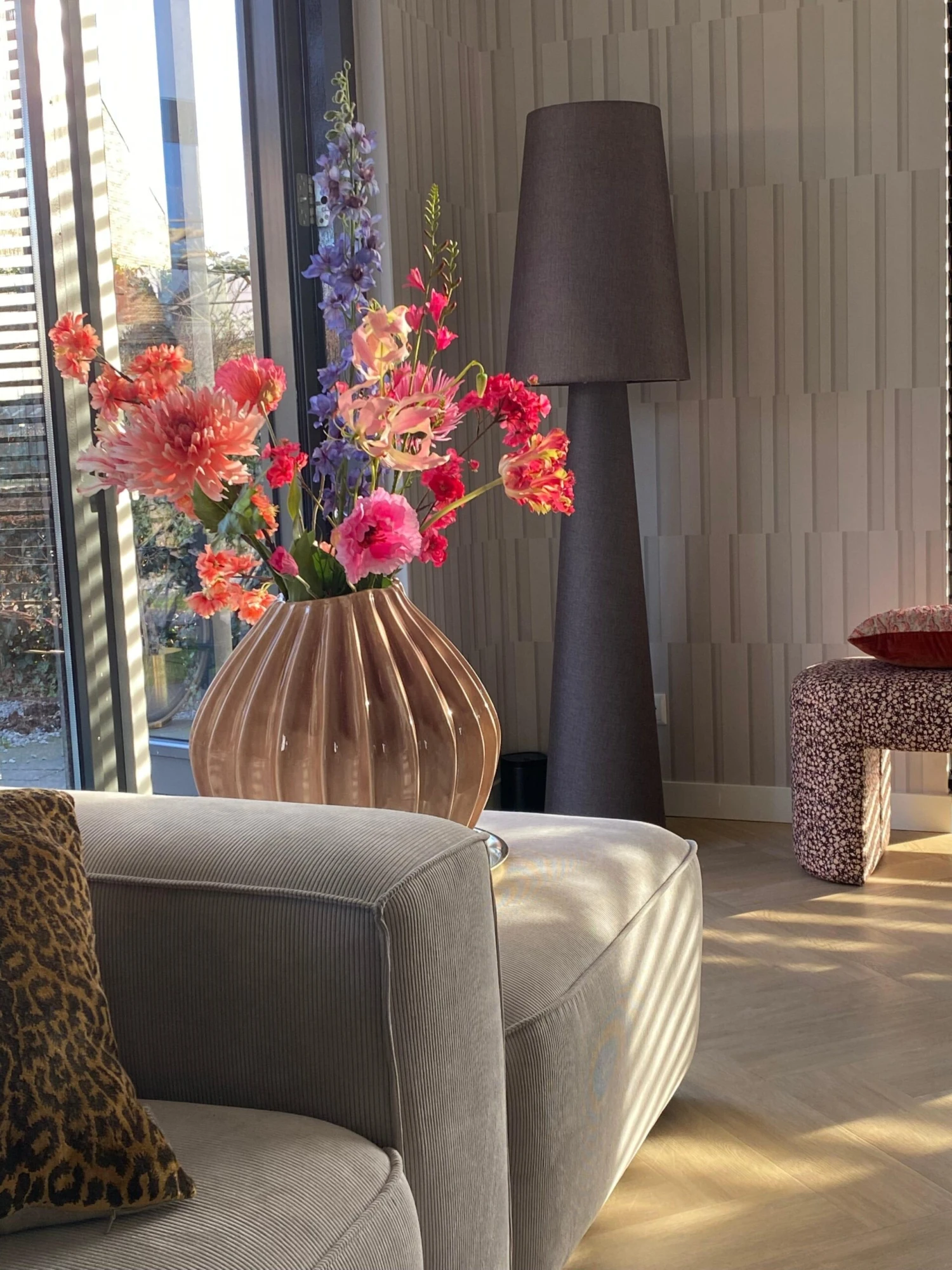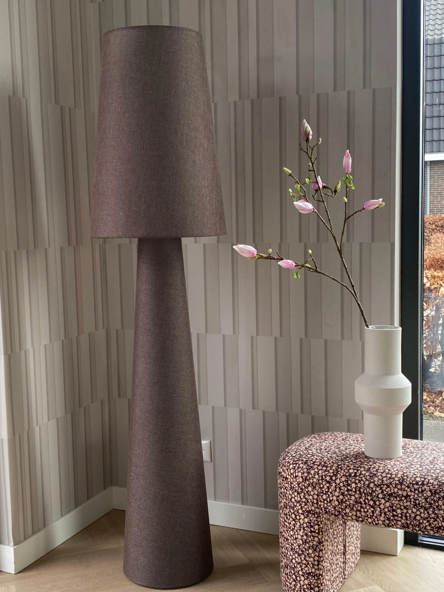 Stripes in various sizes and depths have been mixed. Together they almost create a checked pattern. The design has a three dimensional look with a paper structure to give it depth and texture.