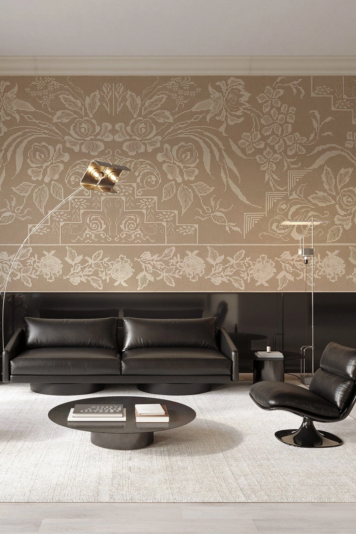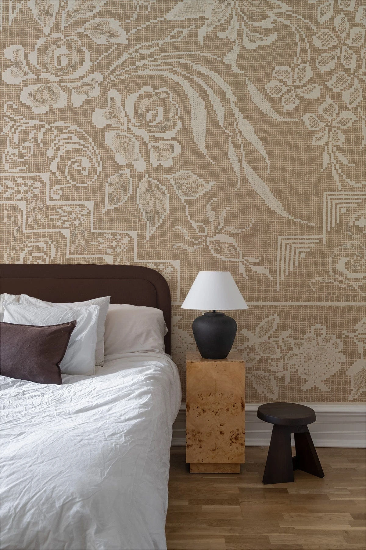 Soft, romantic, and full of quiet detail, Lace Art – Sand brings the timeless elegance of lacework into a modern interior. With a warm sand-toned background and delicate white lace pattern, this wall mural evokes handcrafted textiles and Scandinavian folklore. It’s a design that feels both airy and grounded. Traditional in spirit, yet fresh in execution. Perfect for bedrooms, reading corners, or serene living spaces, it adds a gentle layer of texture and craftsmanship to the walls. A soft nod to Nordic heritage, woven into a contemporary palette.
