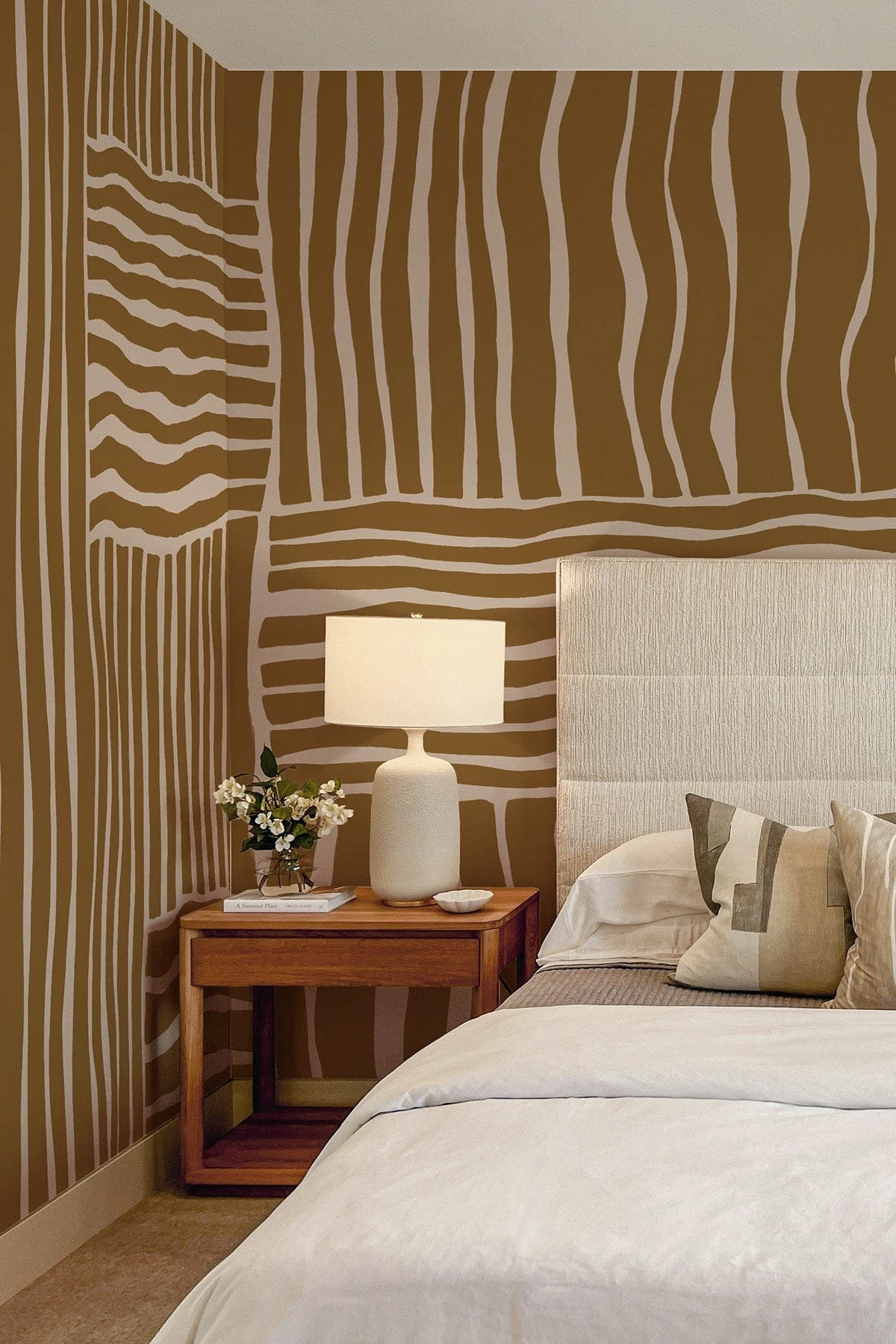 This wall mural with natural flowing lines in contrary directions is a contemporary statement piece of art. A dynamic pattern of textured brush strokes and hand drawn lines evokes a sense of elegance. The shade of ochre brings warmth to every space and goes perfect with any interior design.