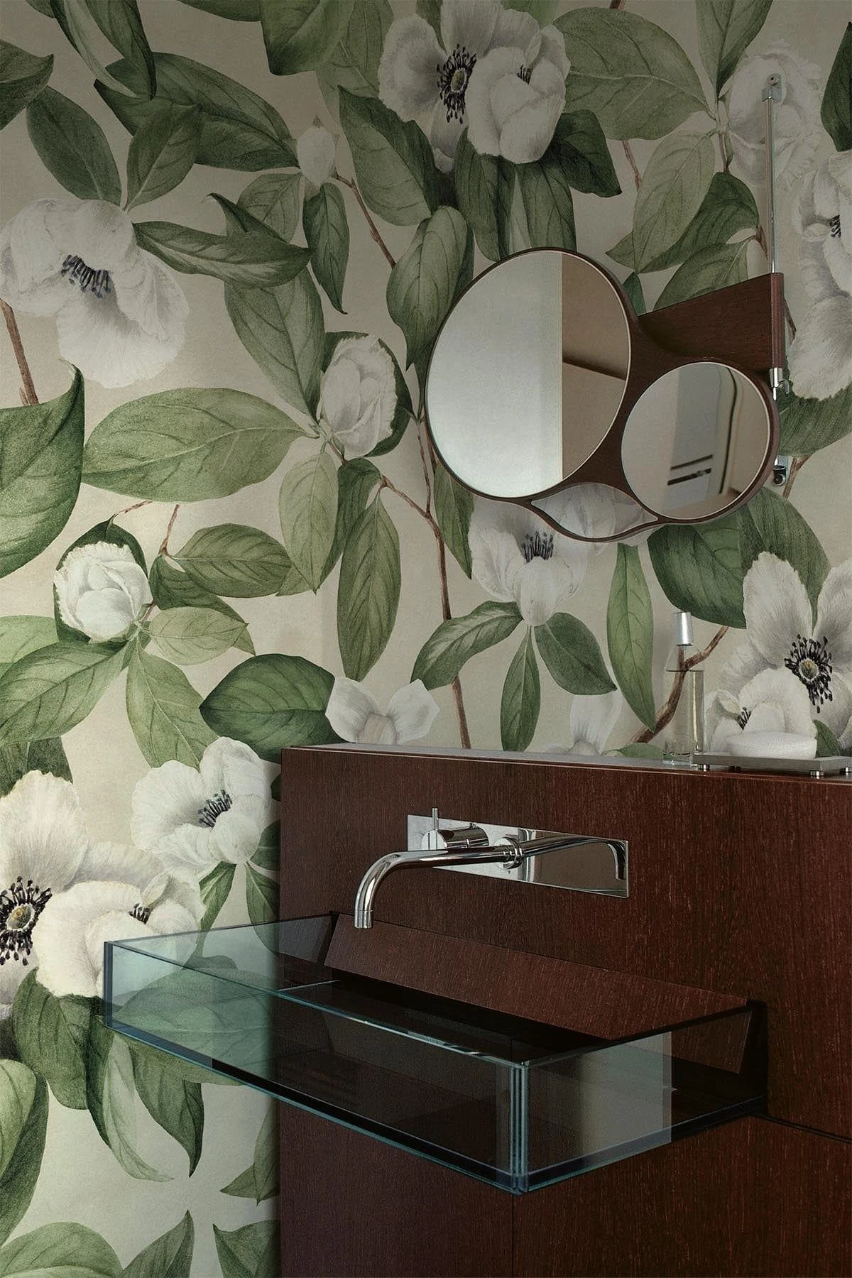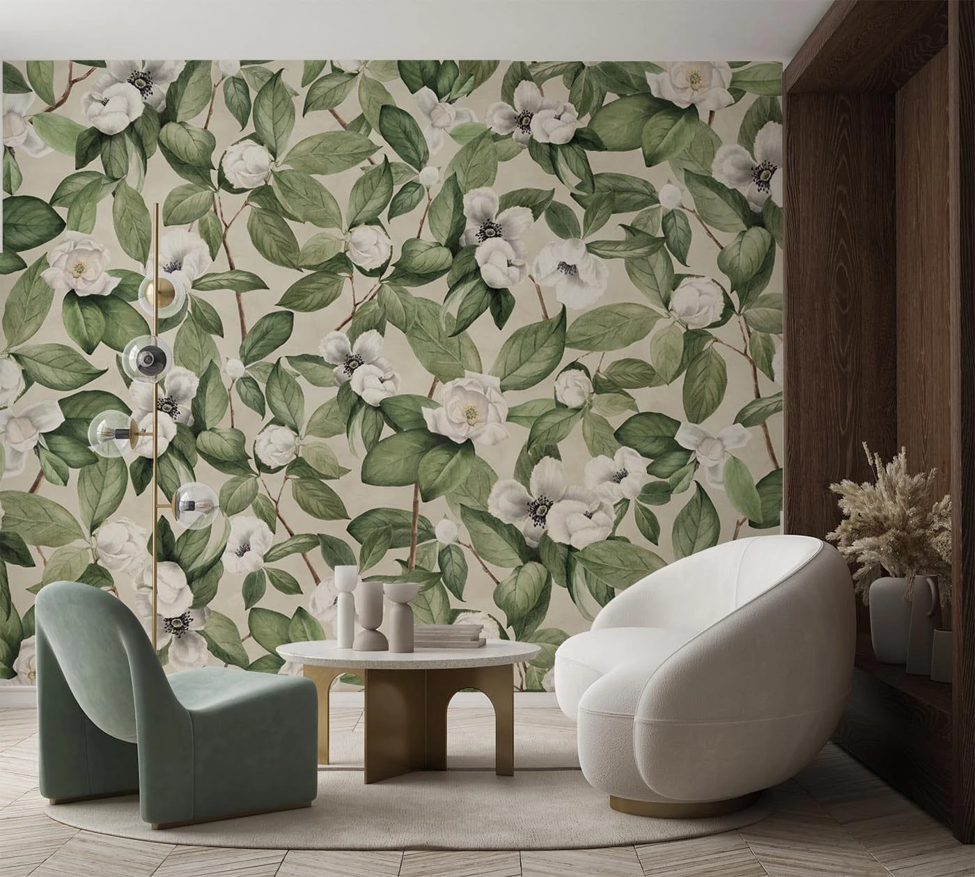 Celebrating the historic parks of old gardens of the early 17th century in Montpellier, France this floral wall mural came to life featuring magnolias in full bloom. Hand painted magnolia trees filled with flowers and green branches are truly capturing the beauty in nature. This floral wallpaper is ideal for creating a bright but harmonious interior design and adds a feel of inviting your botanical garden into your home