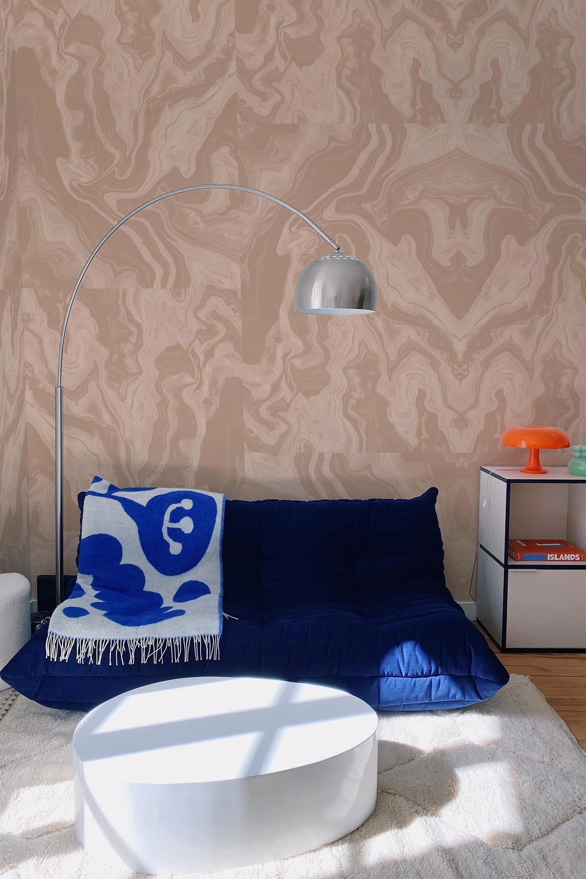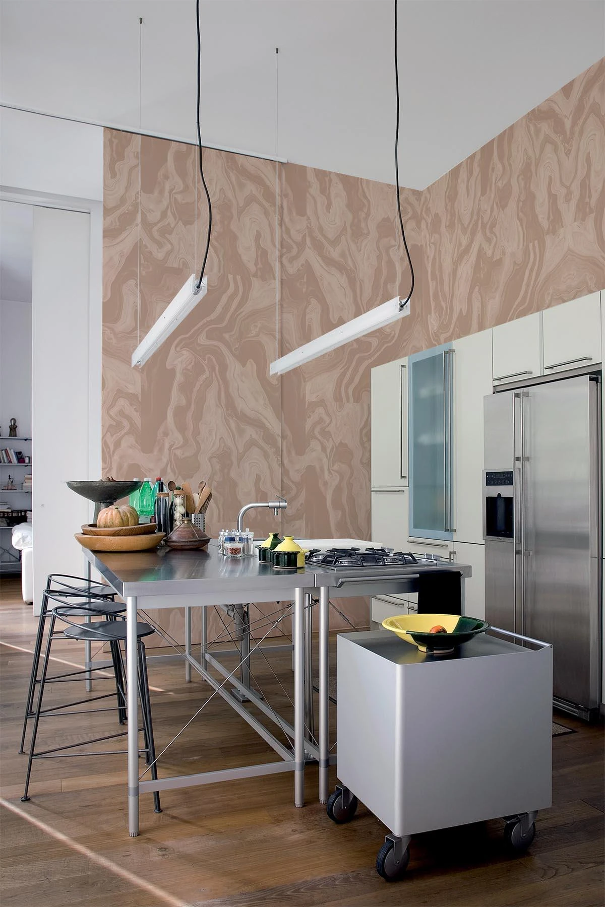 This bookmatched design in pink takes is inspiration from the italian marble rich of life. The large scale marbling design has a soft an organic feel to it. Create a contemporary home by adding this stunning wall mural to your home. It comes in two colors.