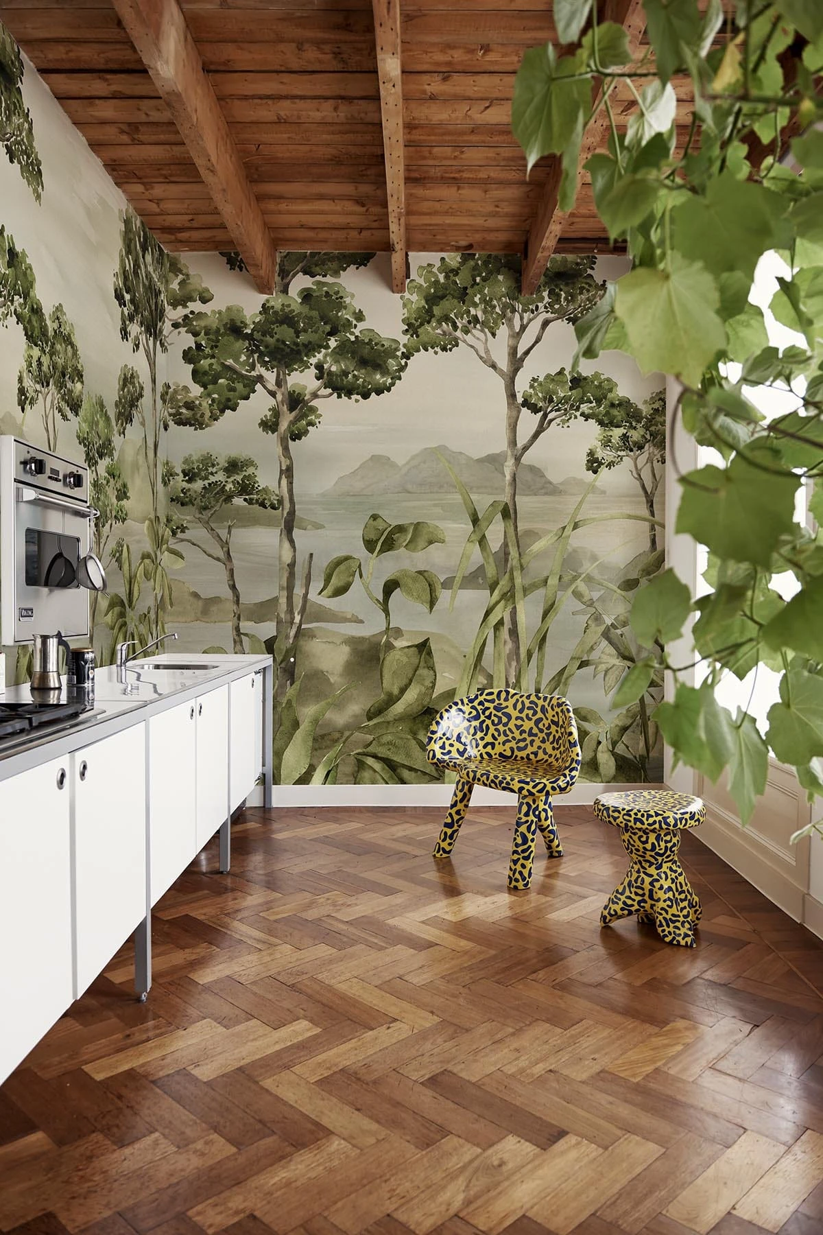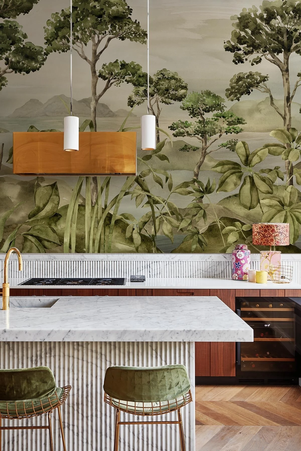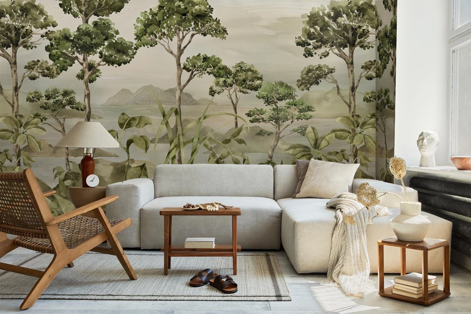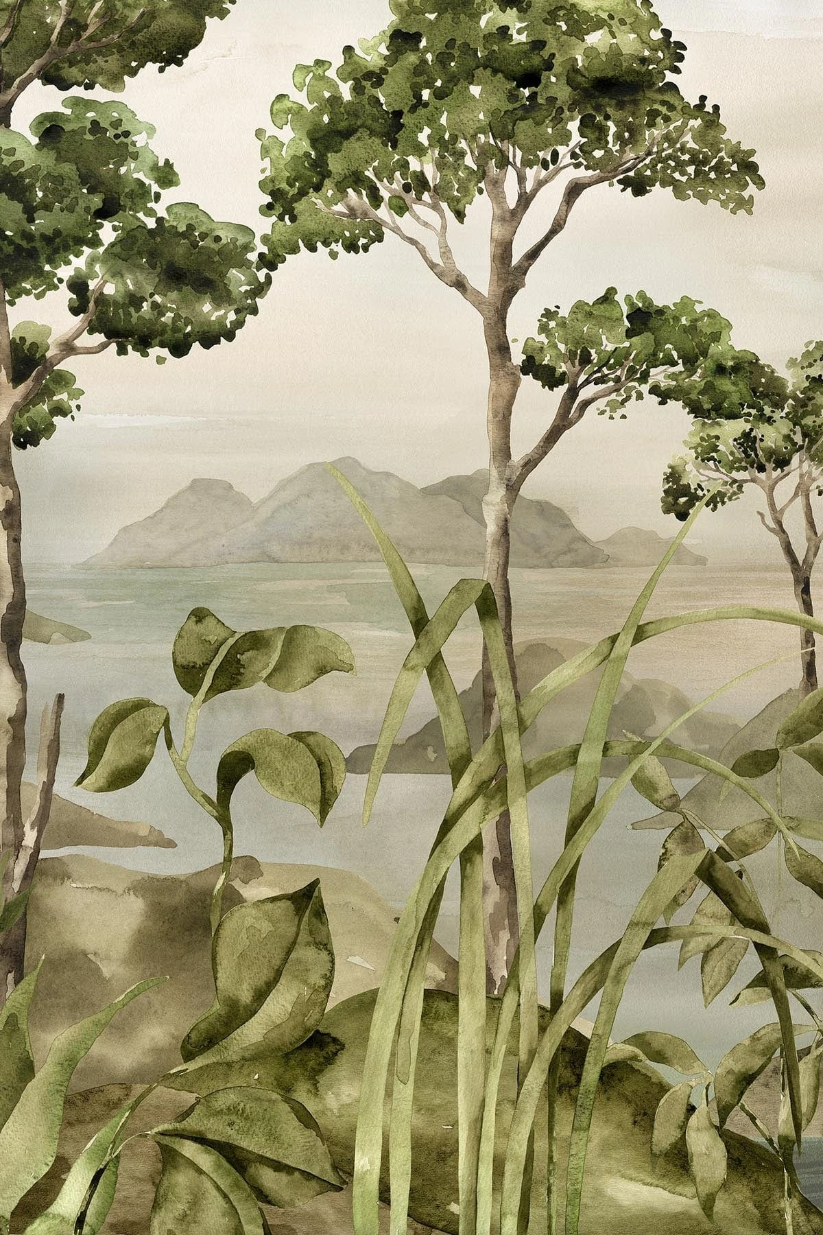 Get carried away into a serene, nature-filled view with the Misty Landscape wall mural in soft lush Green. With enveloping life size trees and foliage, this hand-painted design has detailed plants and a landscape that brings nature indoors. Misty Landscape creates that blurred edge between interior design and outdoor scenery. A true wall mural-artwork that is muted by calming mist and creates a dreamy atmosphere.