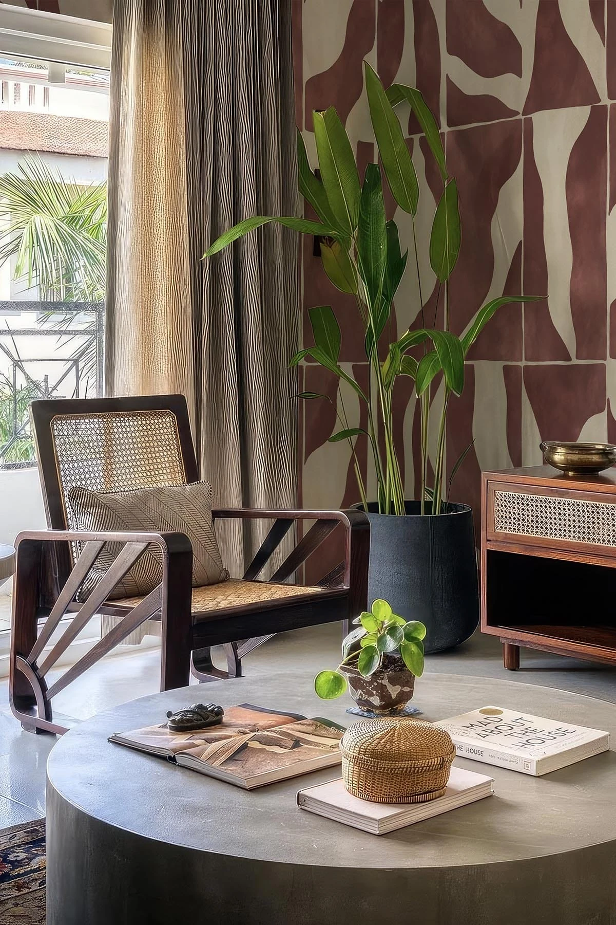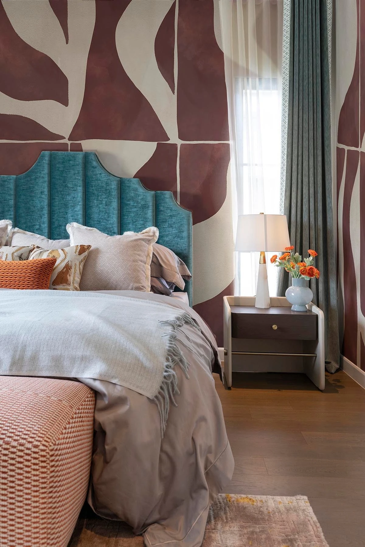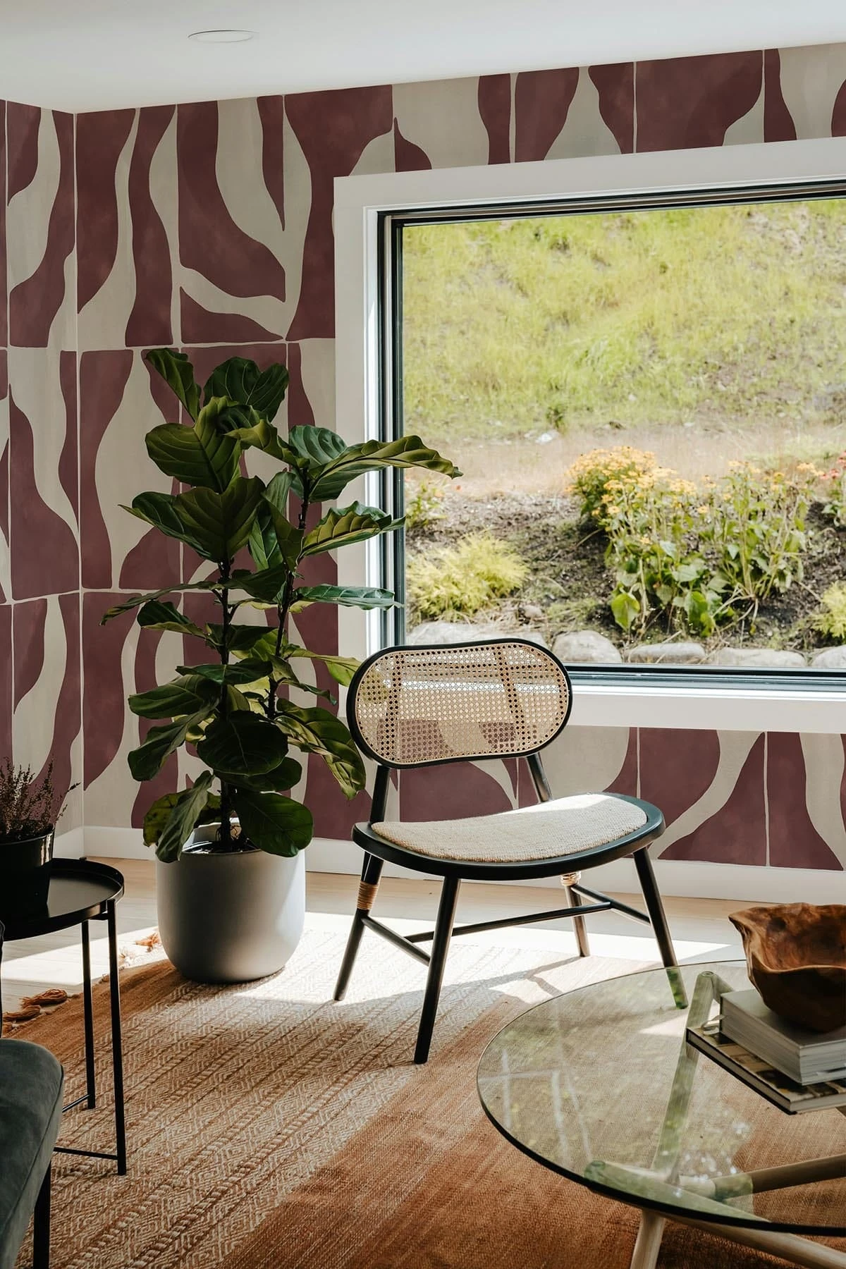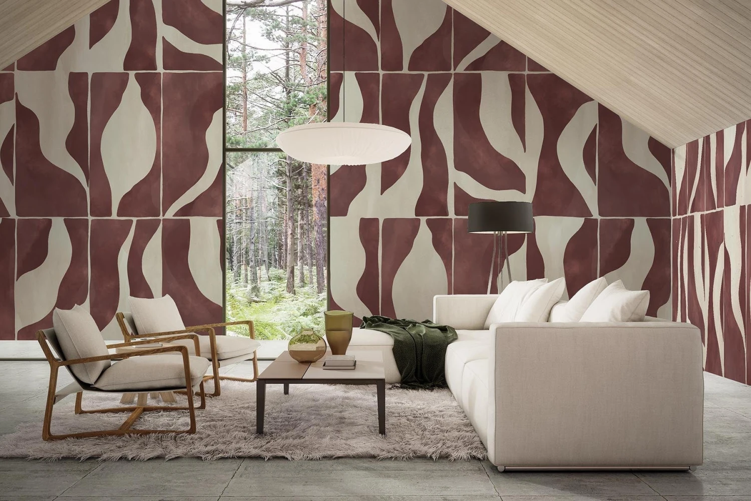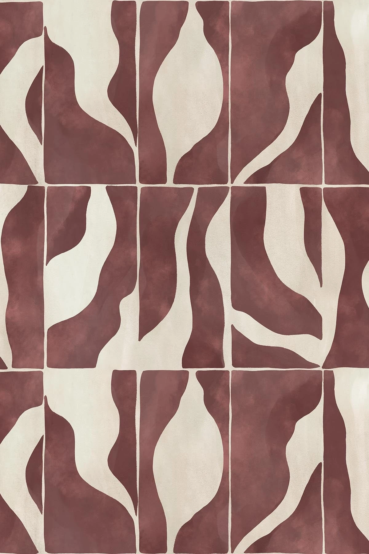 Natural Shapes in Burgundy showcases a geometric yet abstract design, with graceful, flowing curves that bring a sense of harmony and connection to nature. The rich burgundy and off white tones highlight the hand drawn elements of leaves and waves, adding depth through a delicate texture. This nature inspired wall mural seamlessly blends indoor and outdoor aesthetics, creating a warm and inviting atmosphere that enhances any space with elegance and character.