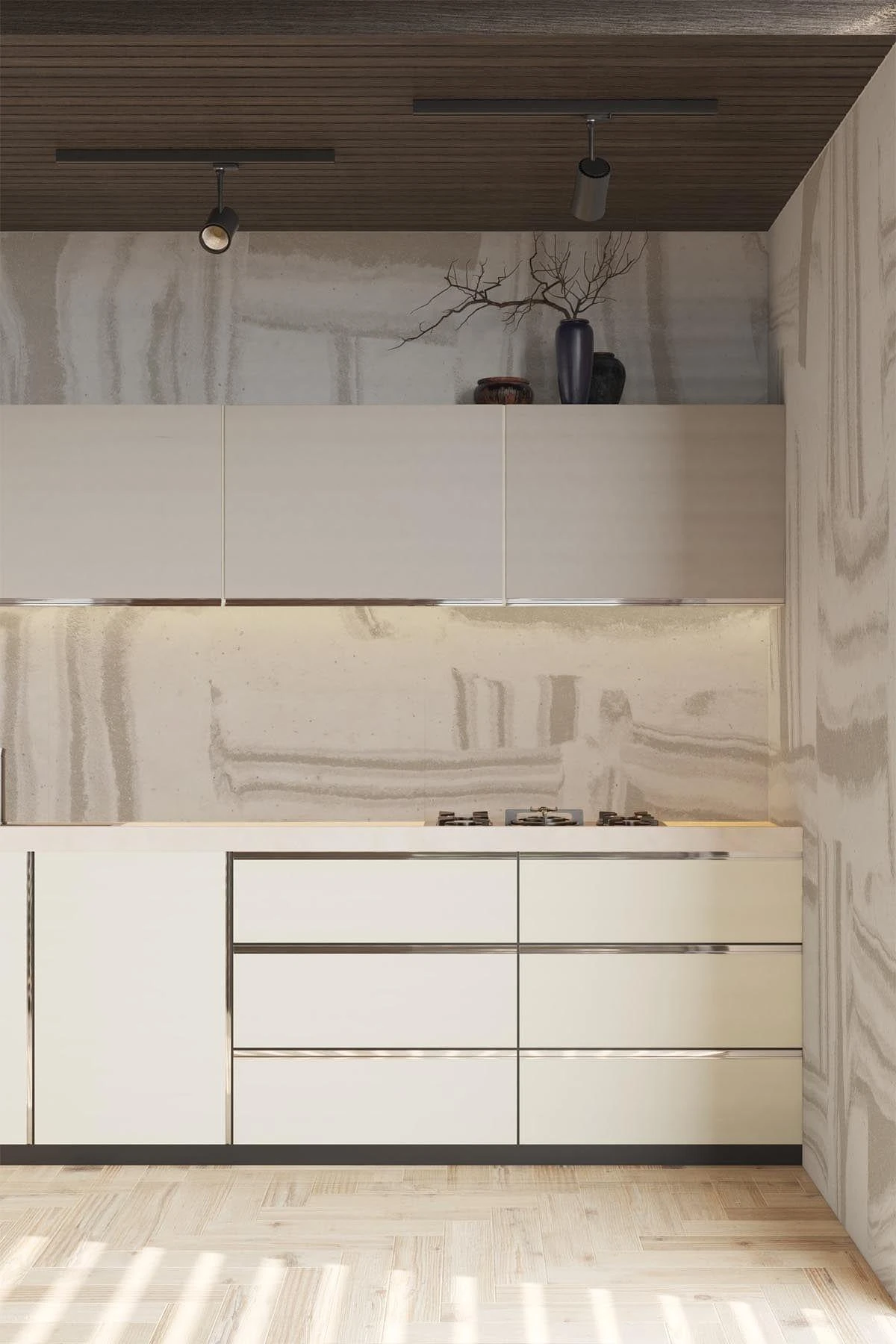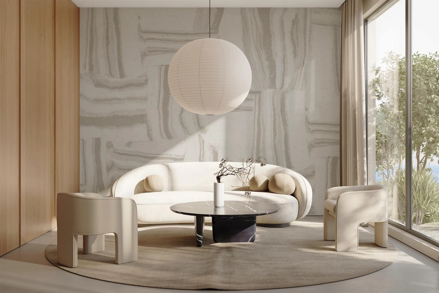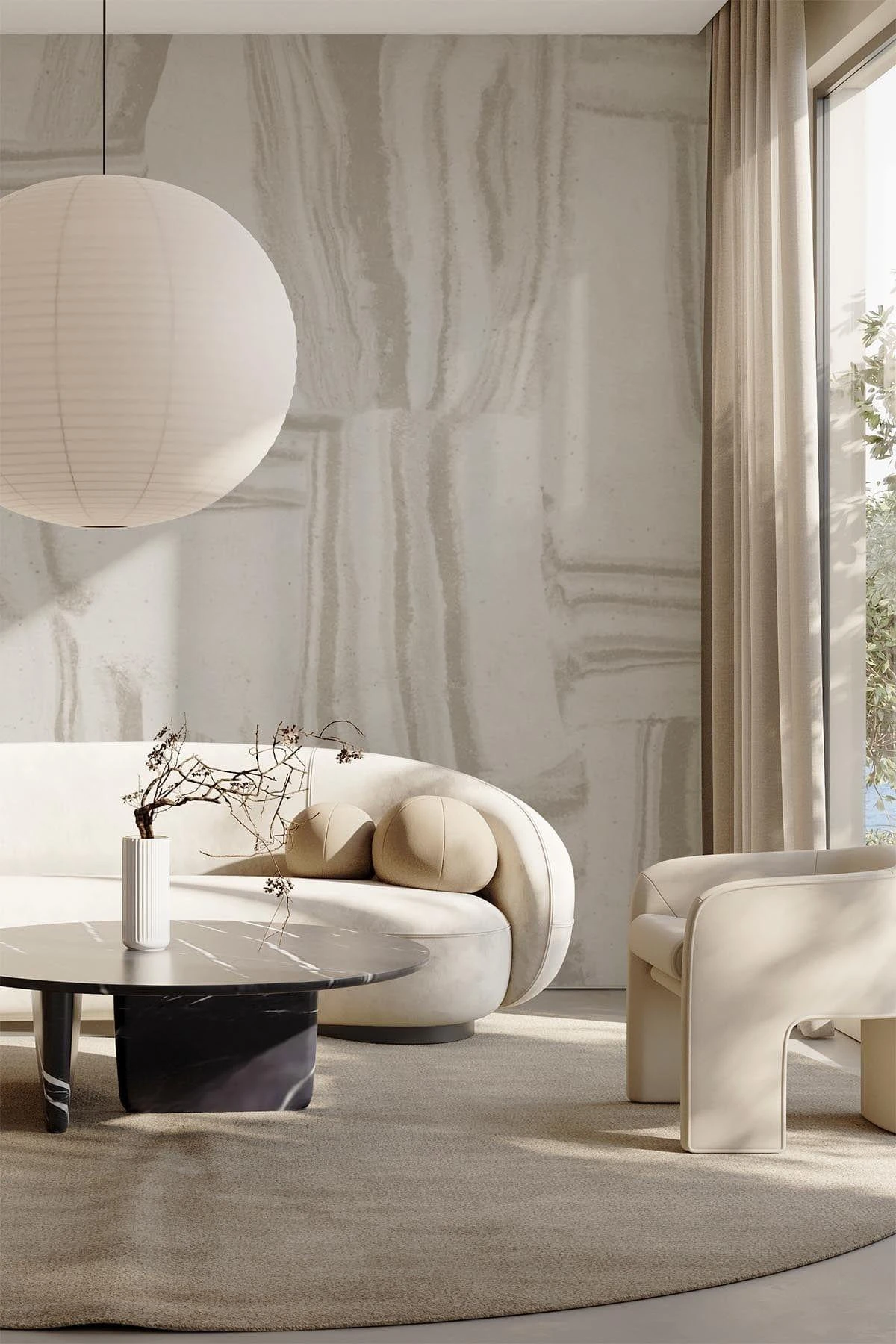 Different colors of stoneware clay together creates this organic pattern with interesting color shifts. The pattern is rolled out in various directions to create this organic and natural pattern. The handcraft technique used when merging different shades of clay creates a unique pattern and makes this wall mural one of its kind. Even though the wallpaper is flat the design has the illusion of rawness and texture like the stoneware clay itself.