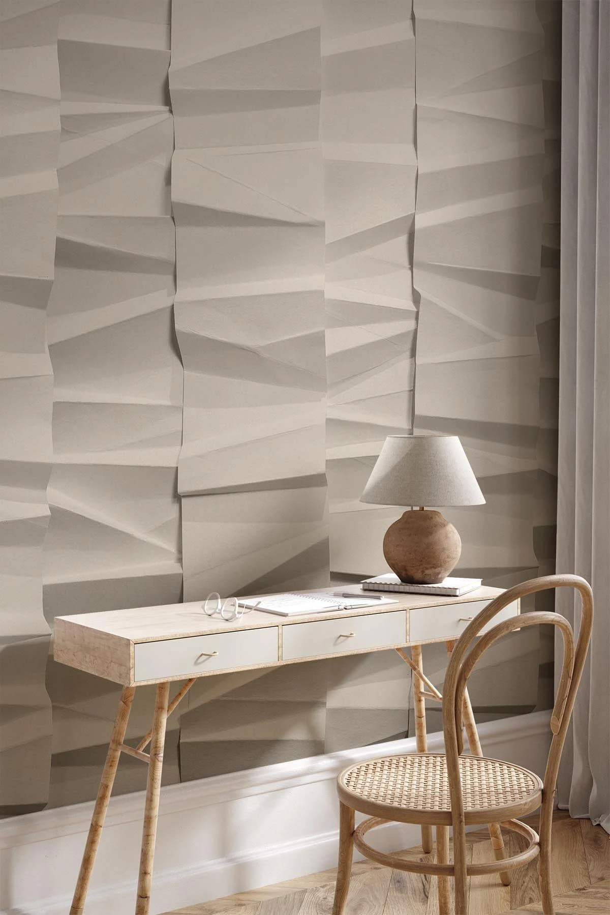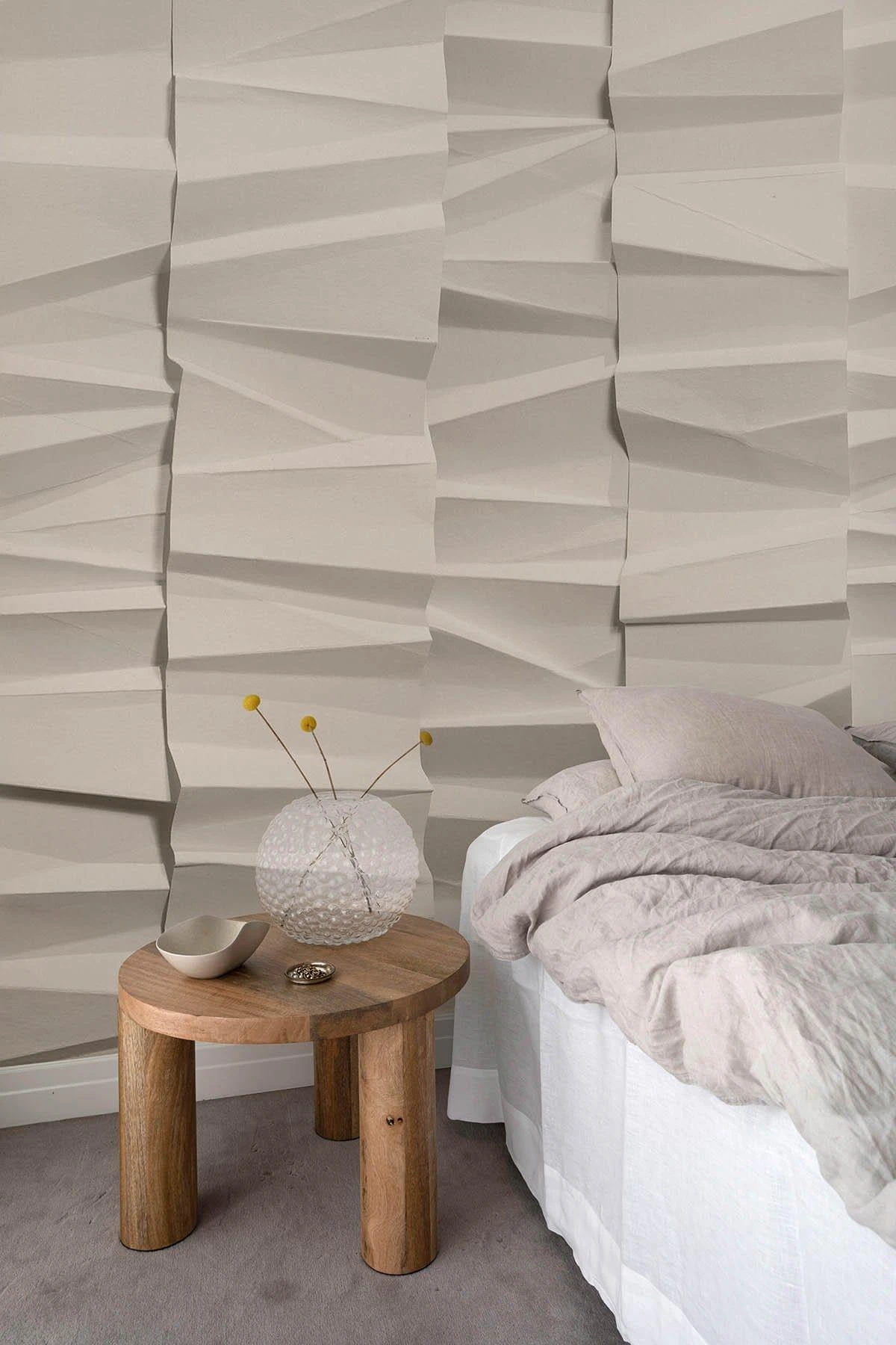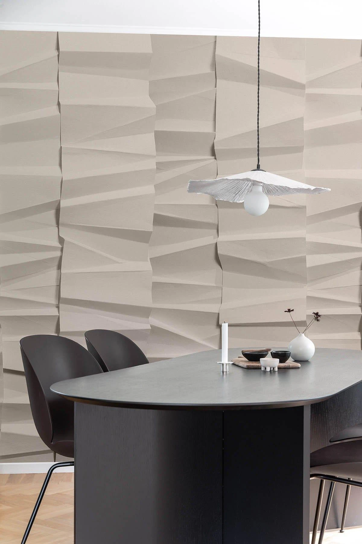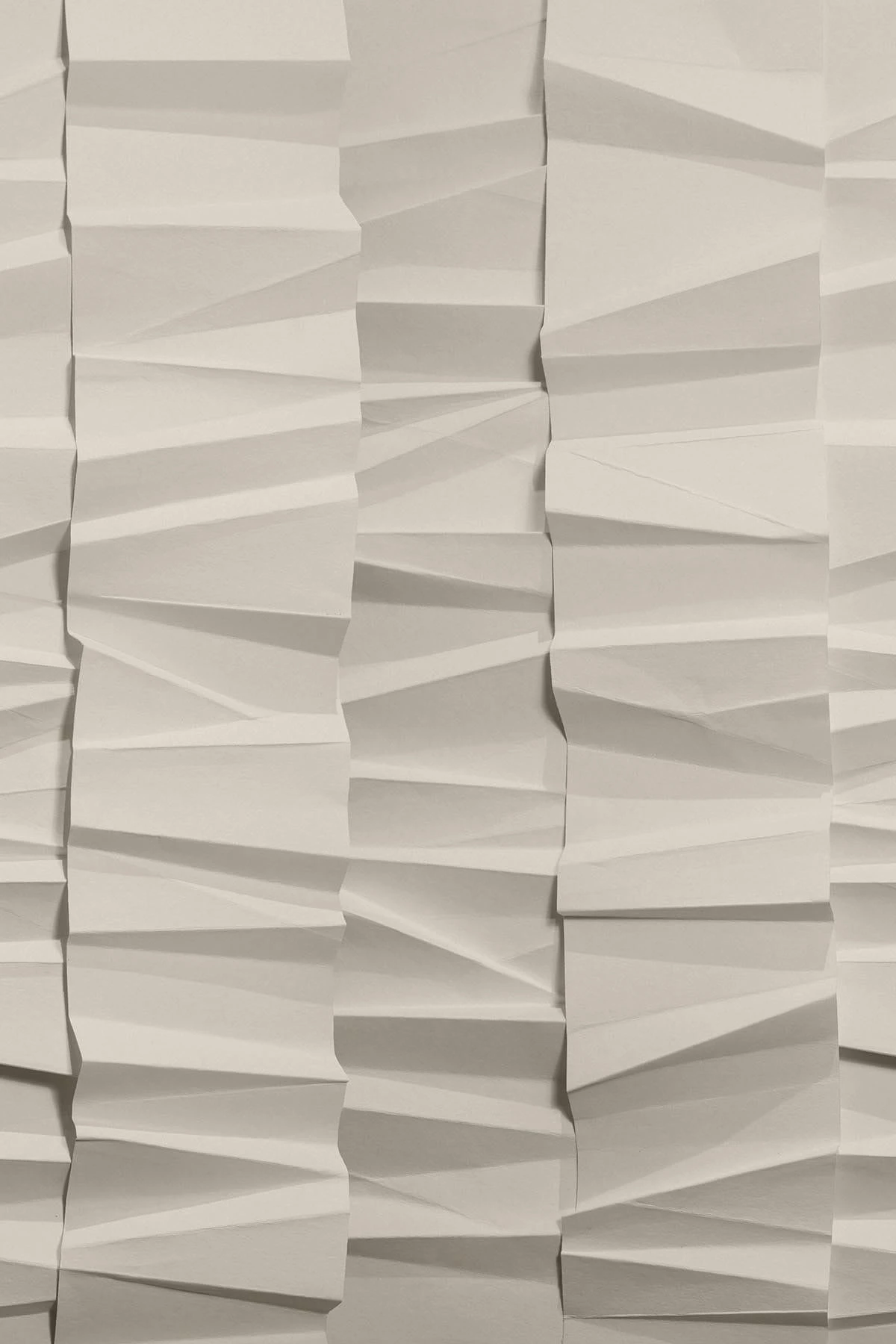 Handcrafted embracing the thousand year old tradition of origami. Paper folds in various directions and sizes. Creating depth and almost an illusion of slight movement makes this wall mural unique.