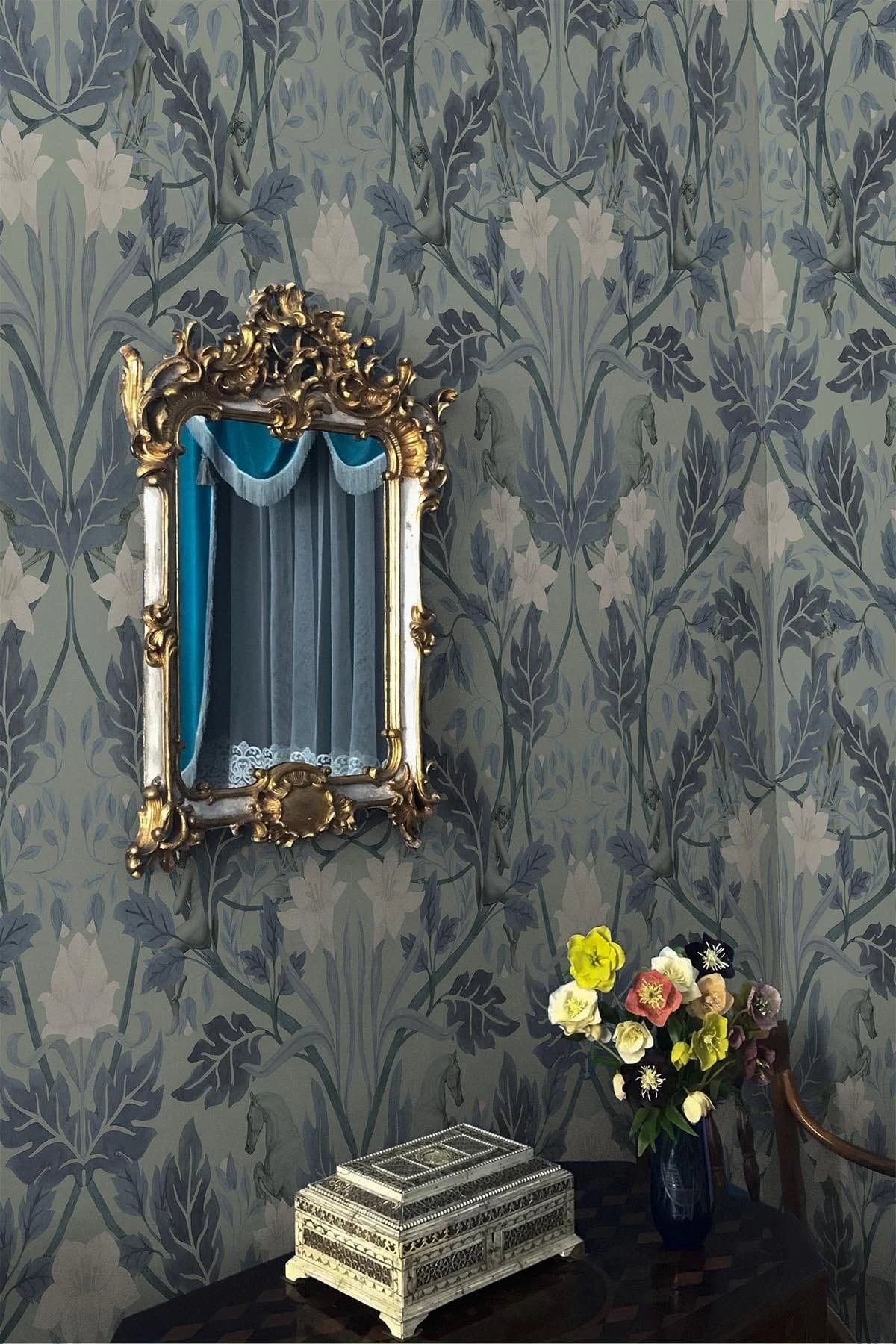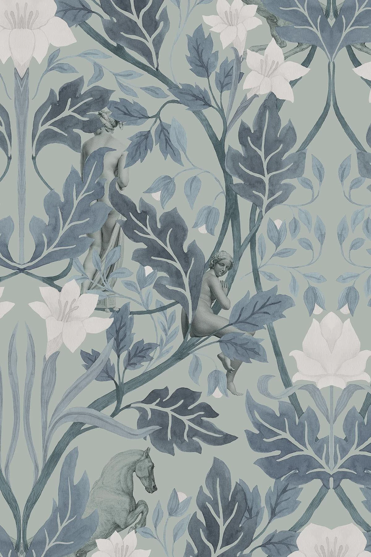 A stunning design of climbing leaves and lilies in a soft blue color mix. We have added the greek sculptures to give it a contemporary feel, a perfect modern clash. This wall mural design is made in aquarelle and comes in many different colors and makes a great impression and suits both in a personal home as well as for a stunning hotel bedroom or restaurants dining room. The designs give the space that self confidence we all love to be surrounded by.