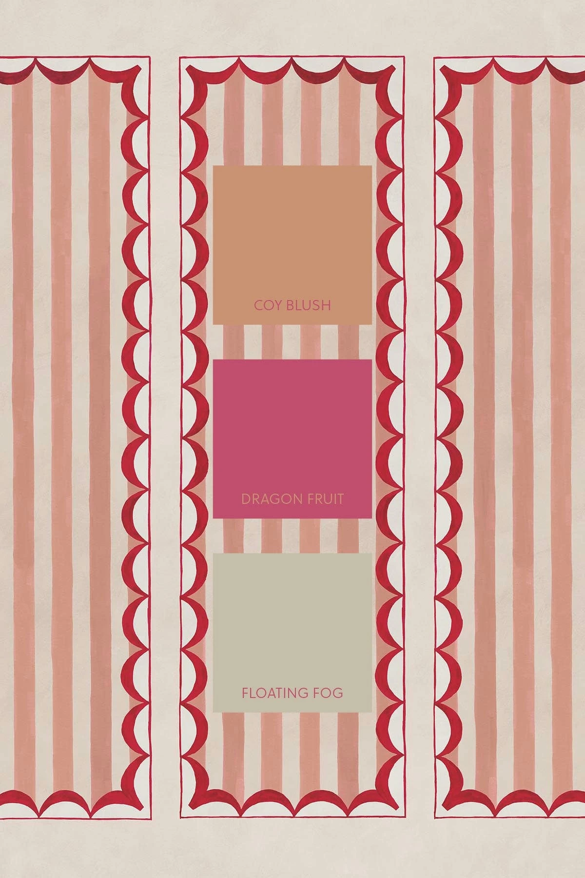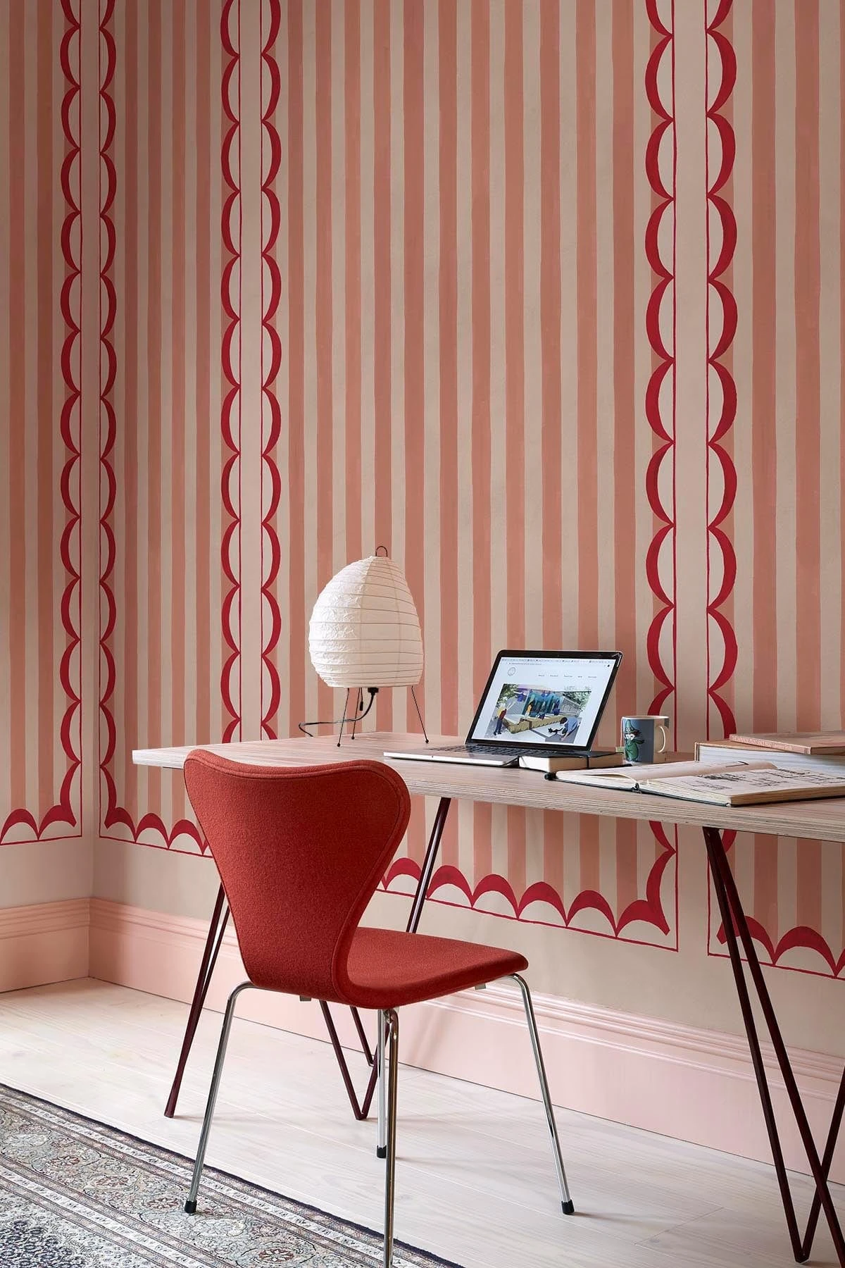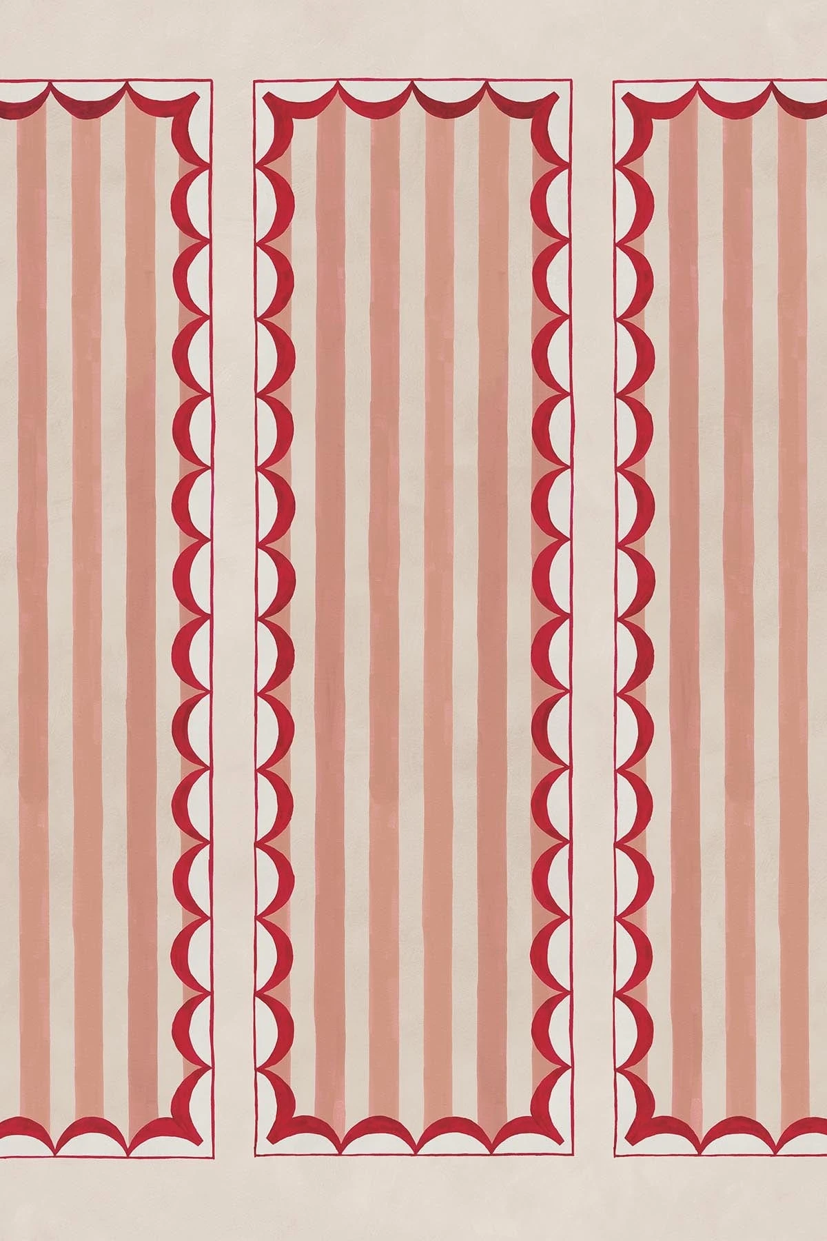 This wall mural features stripes within decorative frames, surrounded by scallops, presenting a timeless design. The classic stripe pattern in soft pink with red details makes a delicate statement on your walls. With vibrant colors, this design achieves an elegant yet contemporary look.