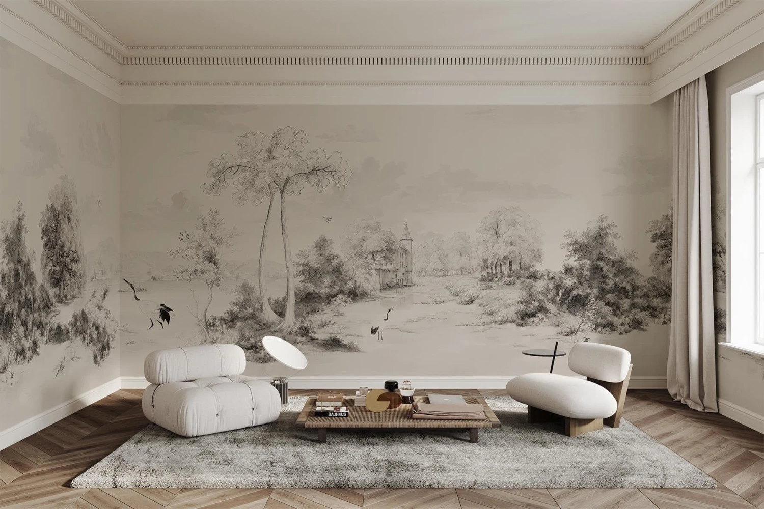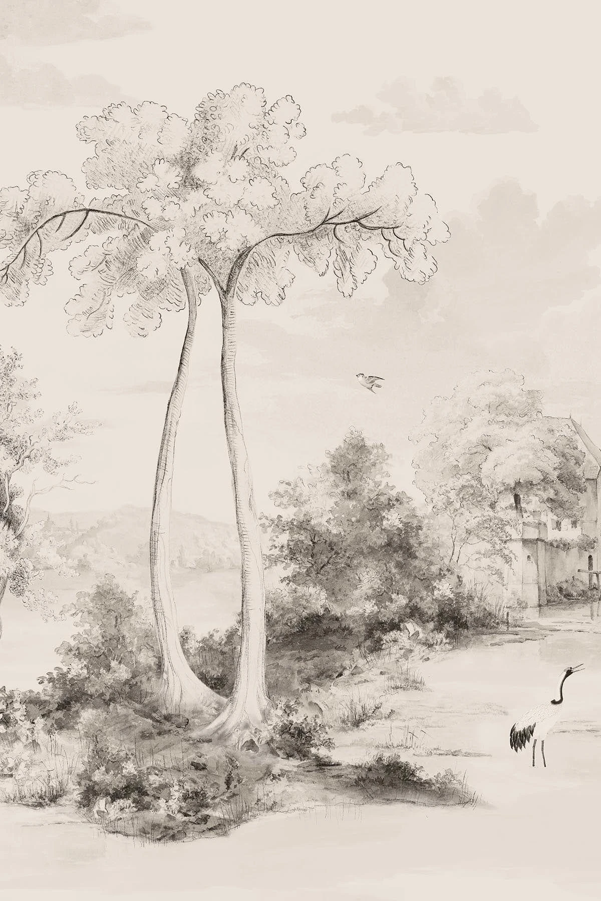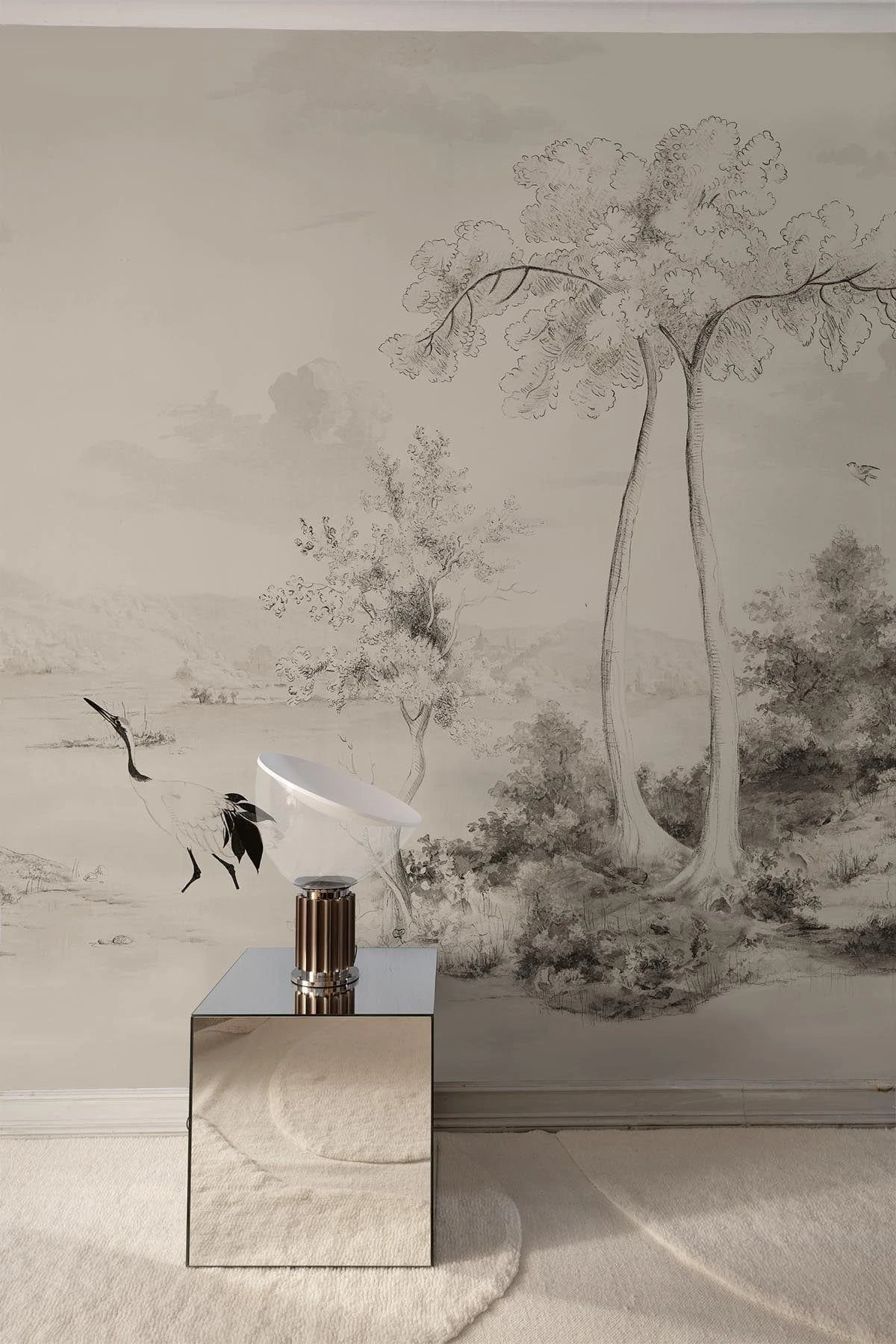 This fluid landscape captures the senses with its scale and perfect blue coloration. The landscape mural is made of hand drawn pencil strokes in charcoal which gives the design its fluidity and soft feel. Can you see the Crane by the water? This lovely wall mural comes in several soft colorways to enhance your home.