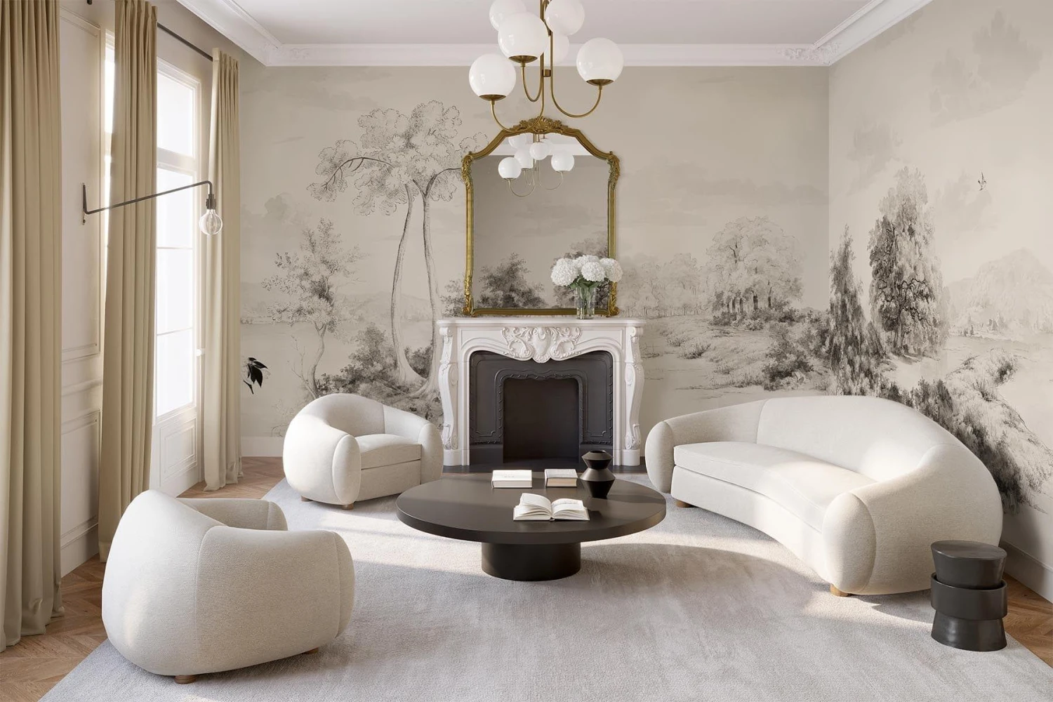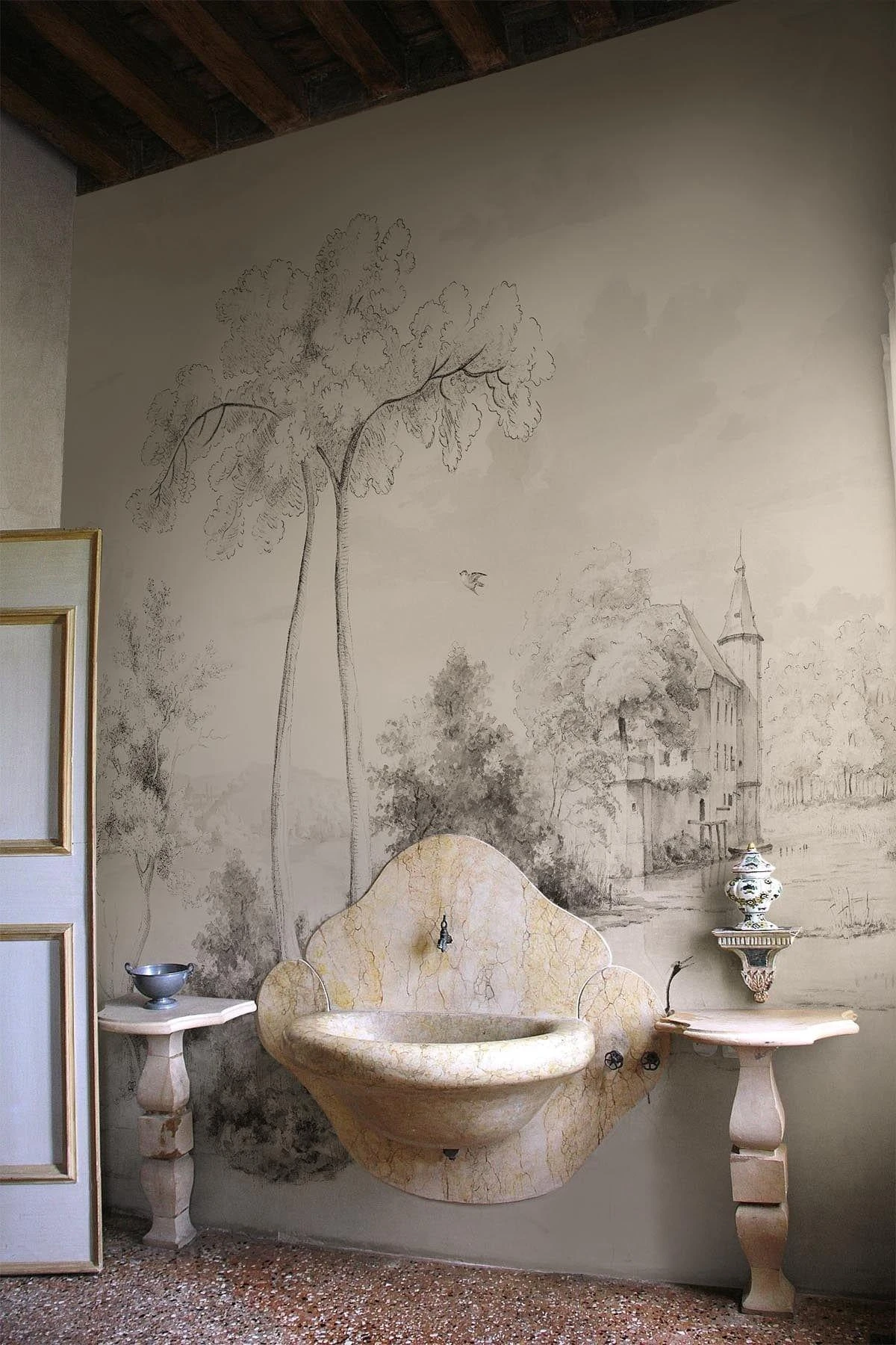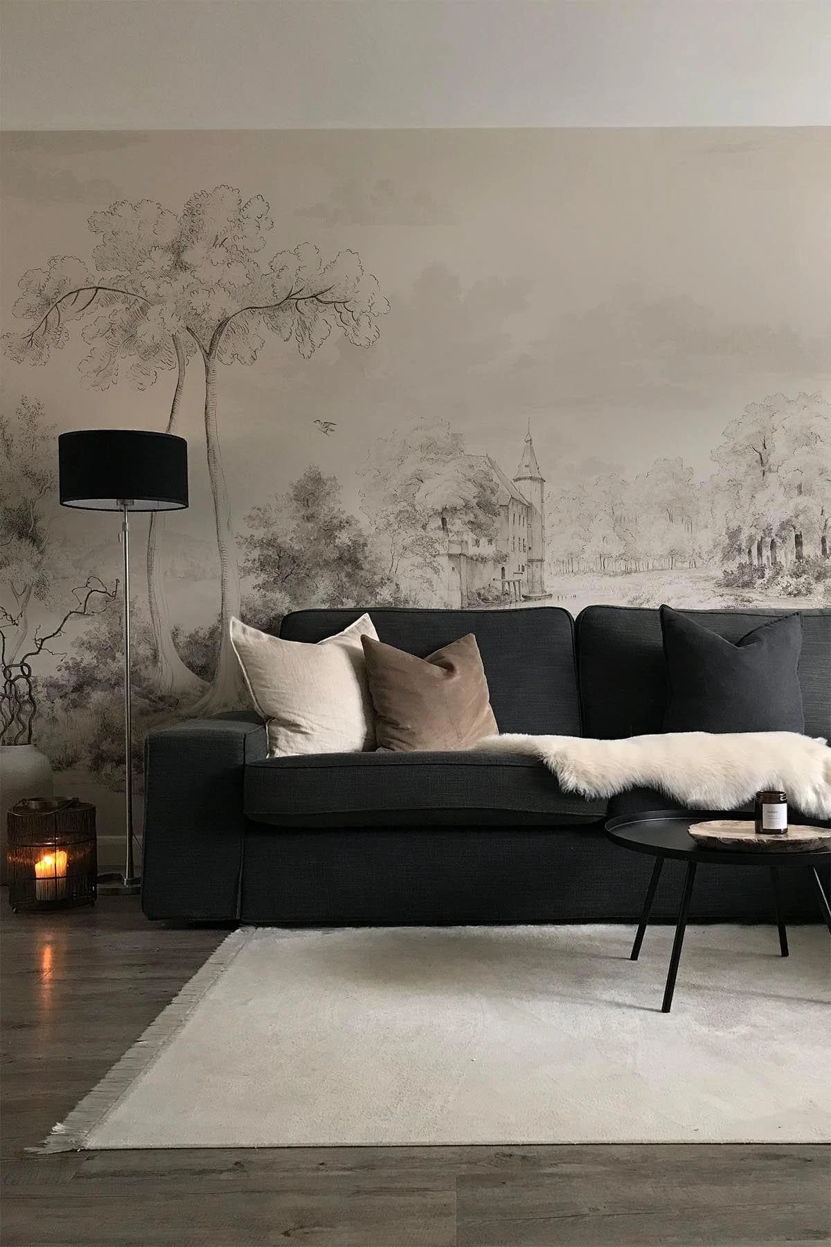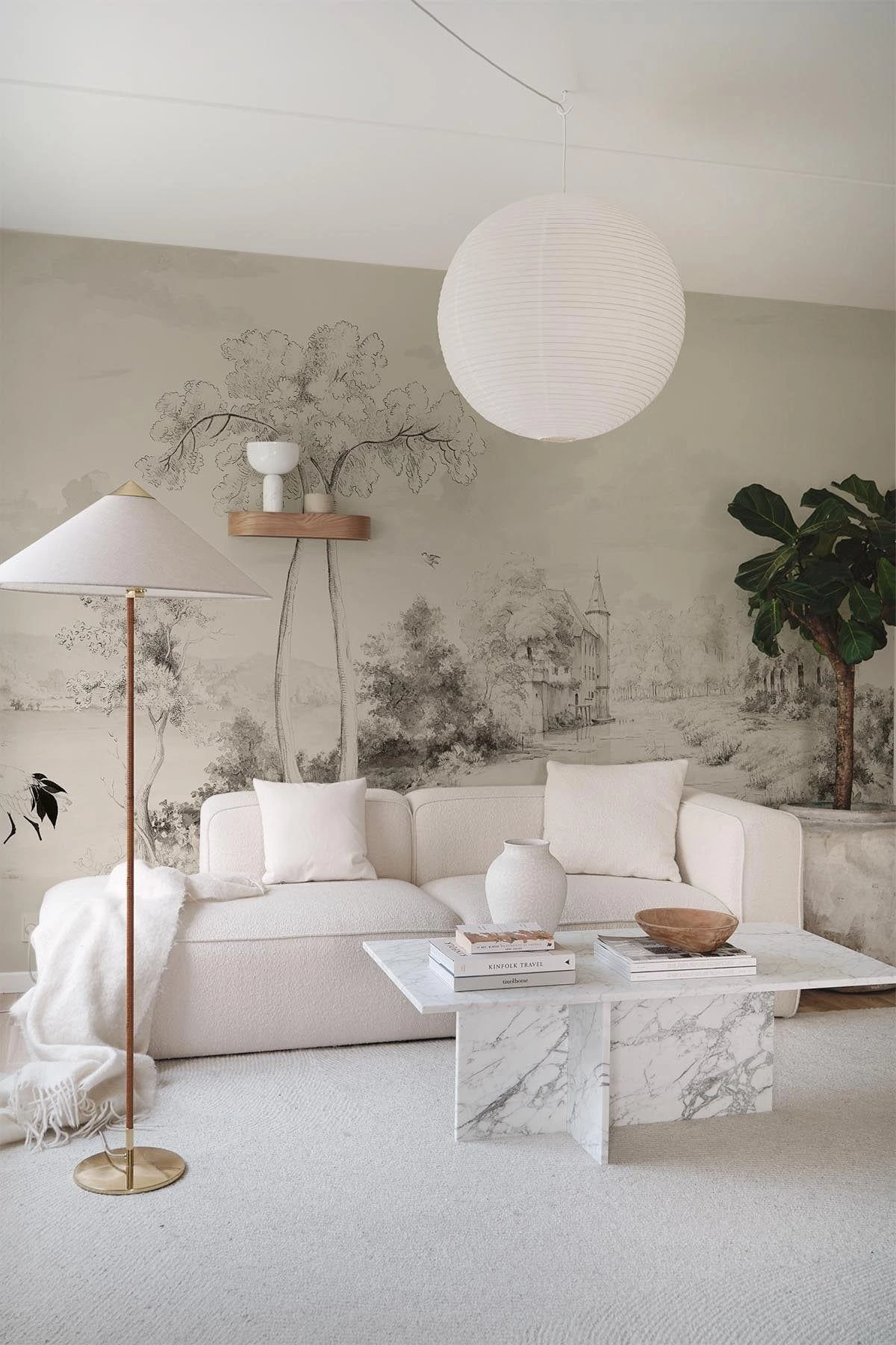 This fluid landscape captures the senses with its scale and perfect blue coloration. The landscape mural is made of hand drawn pencil strokes in charcoal which gives the design its fluidity and soft feel. Can you see the Crane by the water? This lovely wall mural comes in several soft colorways to enhance your home.