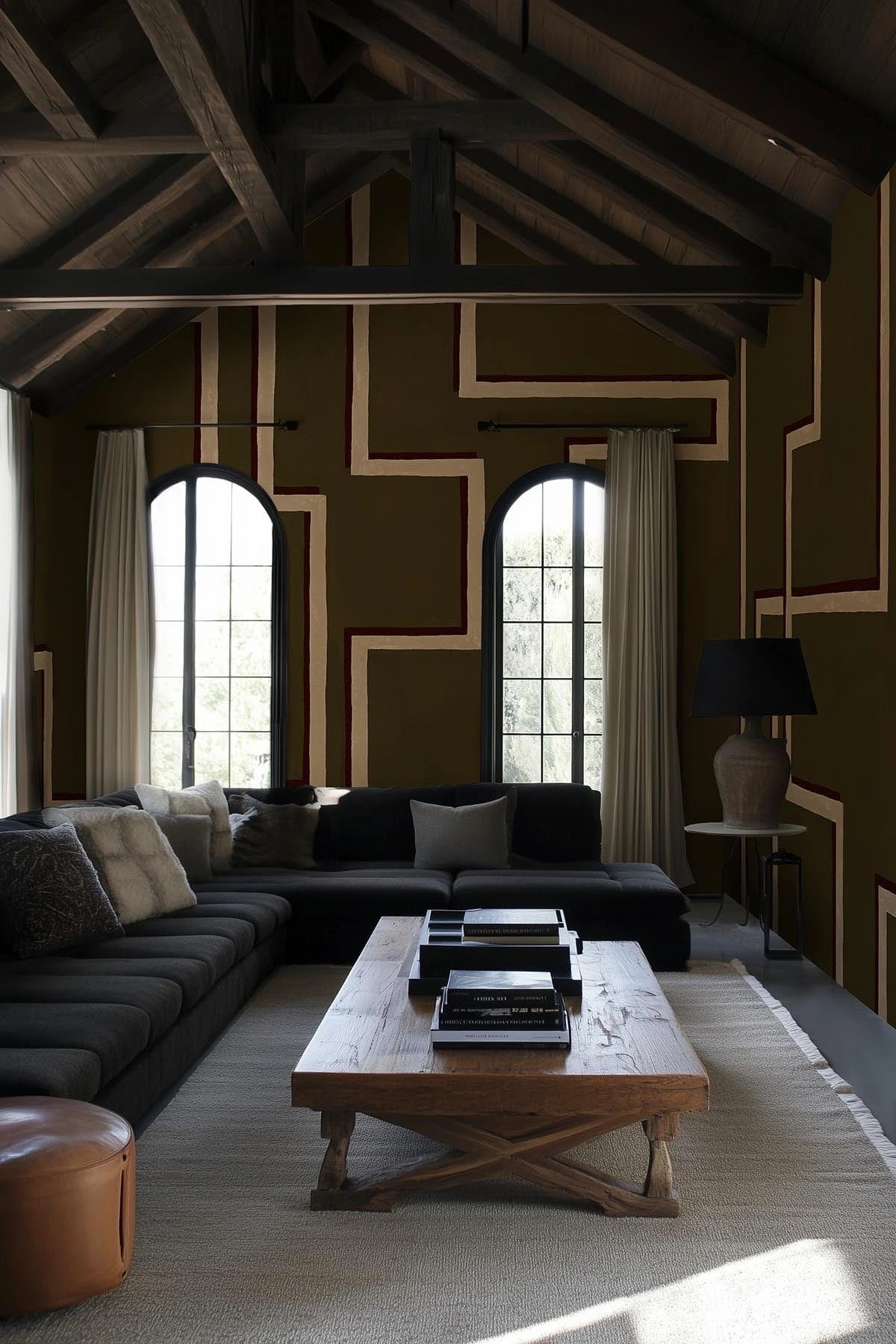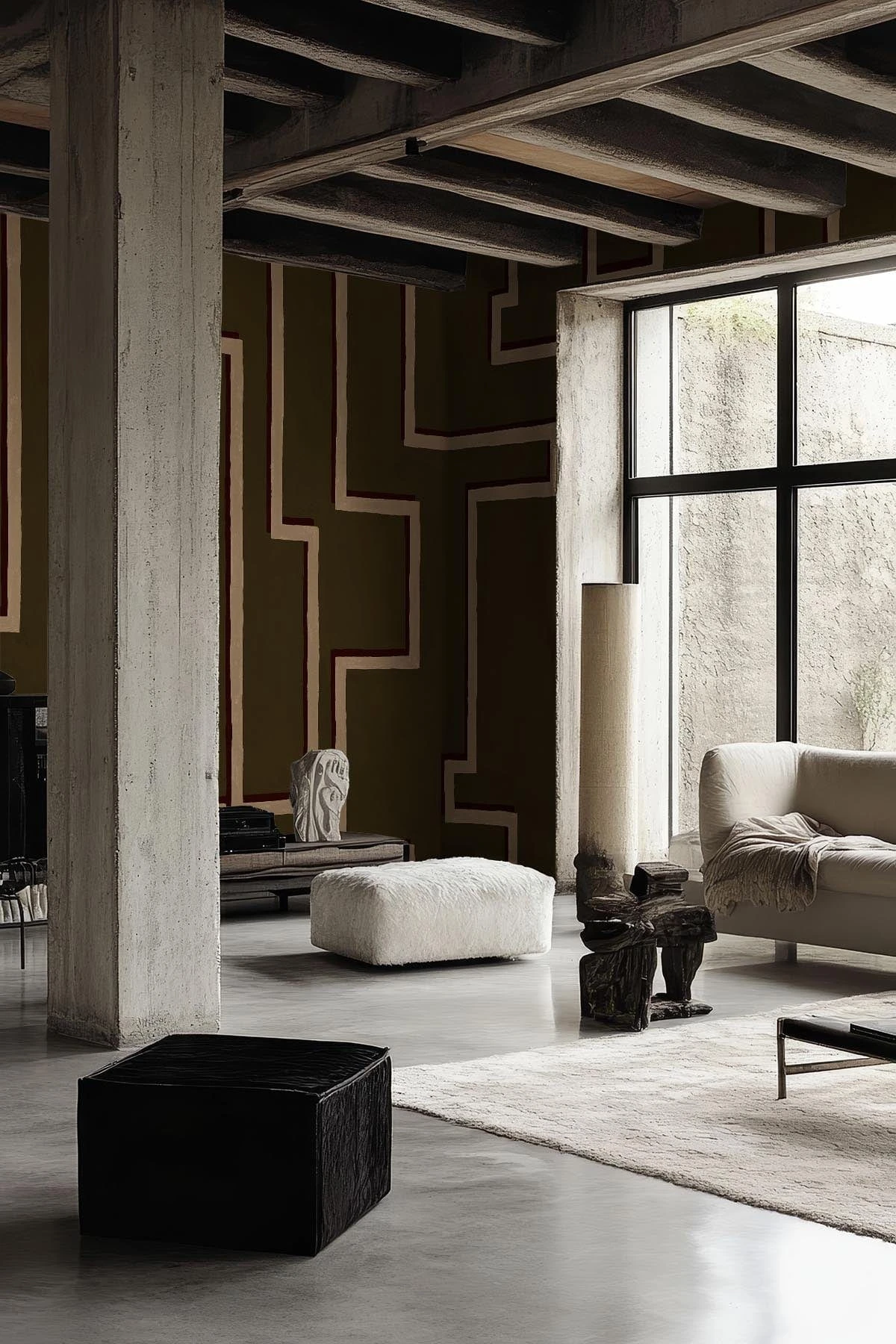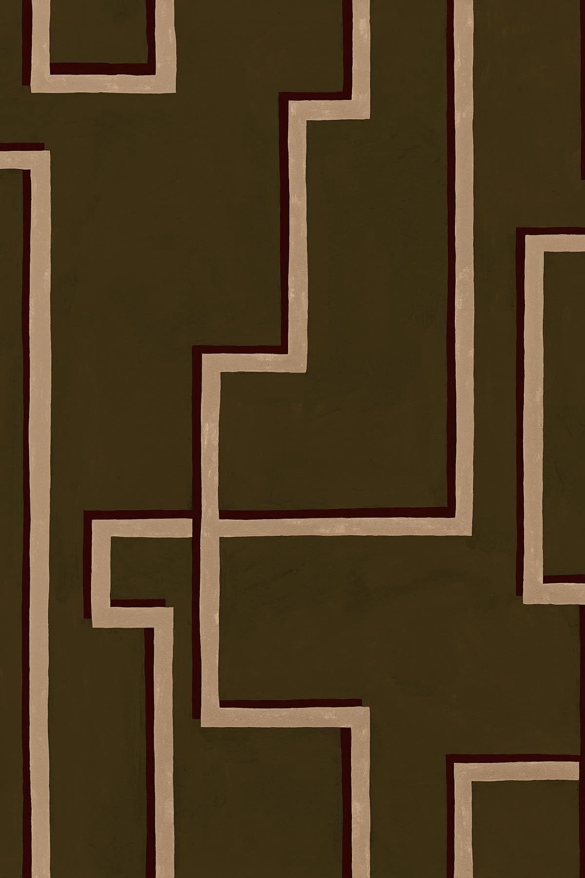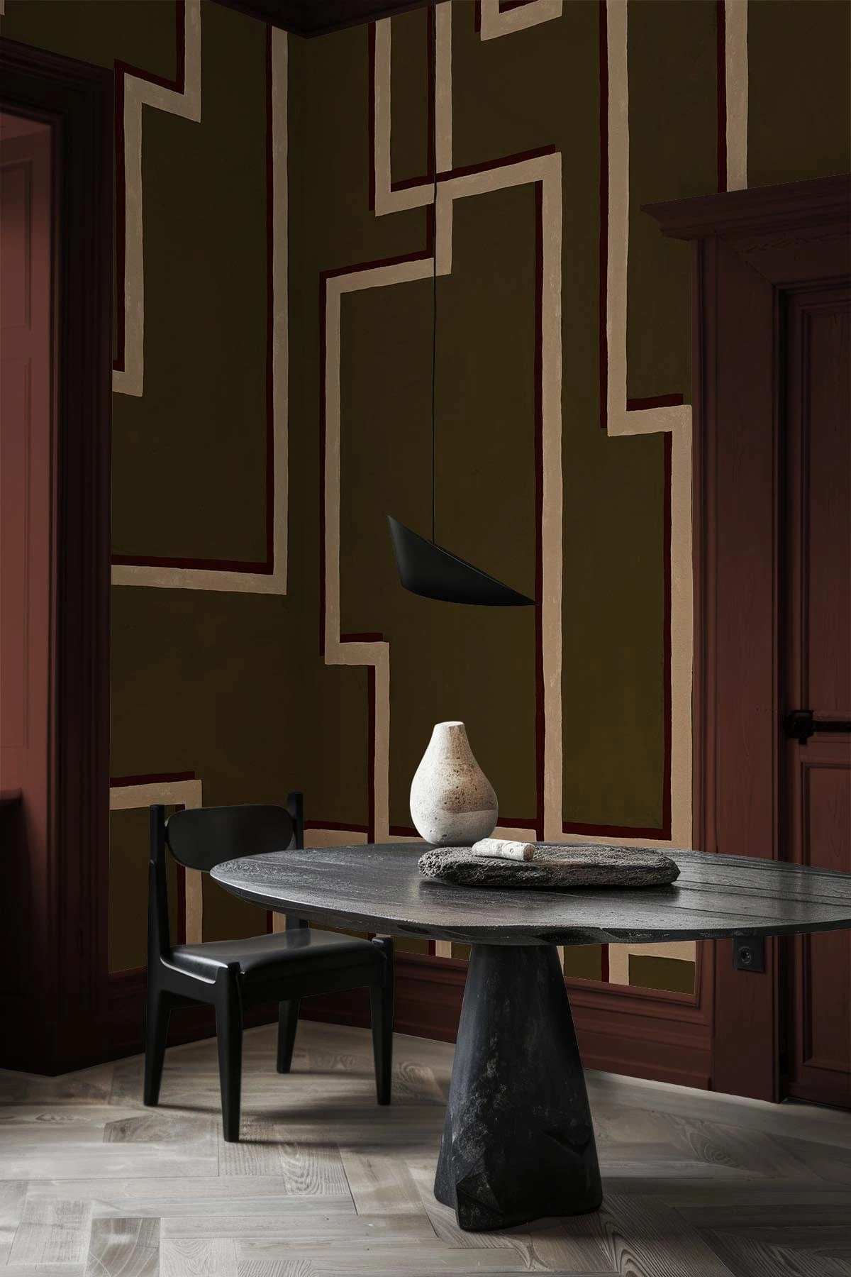 Bring an elegant edge to your space with the Shadow Lines wall mural in olive green. A design made up by hand-painted, irregular lines that rise with a rhythmic flow. This design blends structured precision with organic movement. Subtle shading adds depth, enhancing the Art Deco-inspired pattern with a modern twist. The rich olive green colors create a sophisticated and calming atmosphere, making this mural a timeless addition to any interior.
