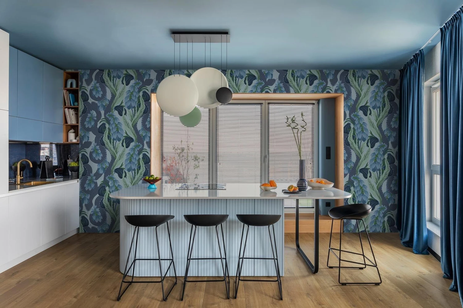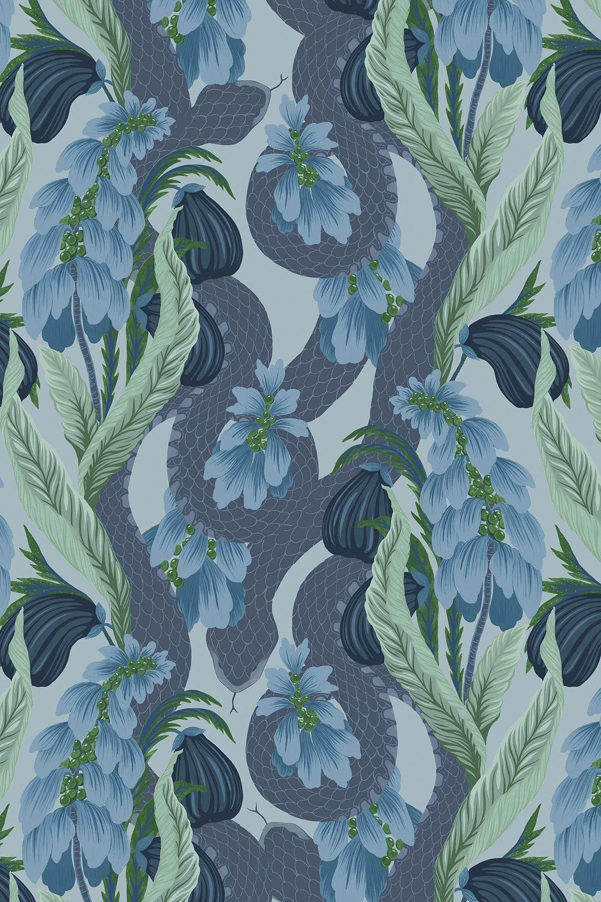 Here be snakes! A fantastical motif of forest beasts amongst stylised flowers, leaves and vegetables. The Snake Meadow wall mural in jewel-like Blue claws inspiration from the botanical wonderlands with lingering snakes in the background.