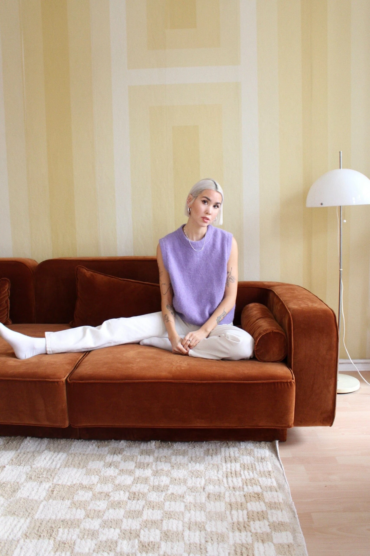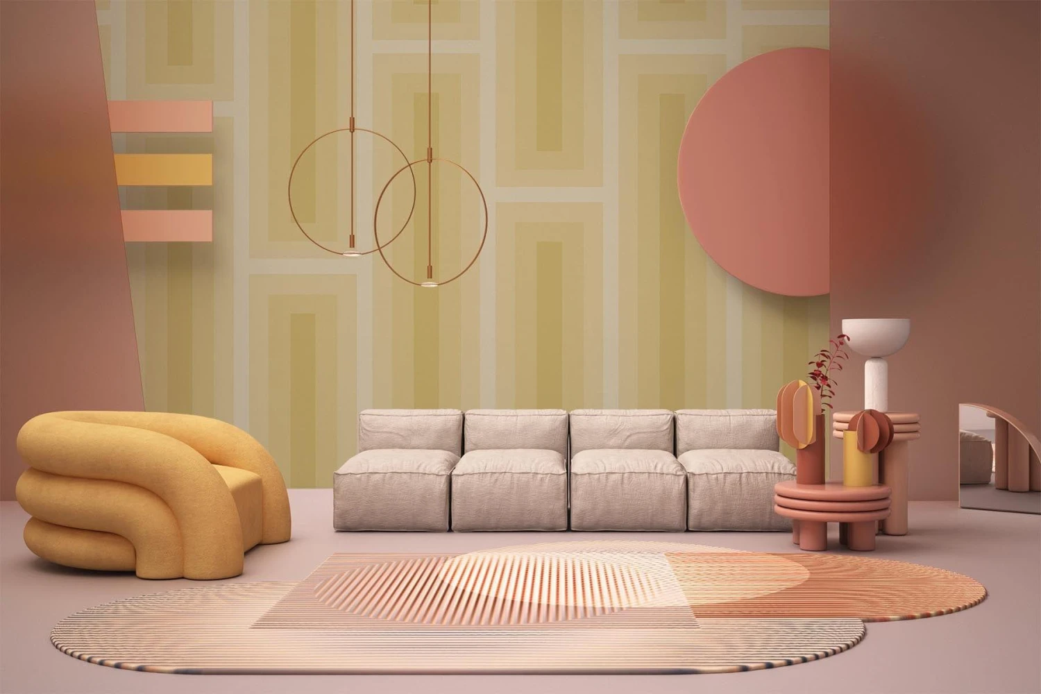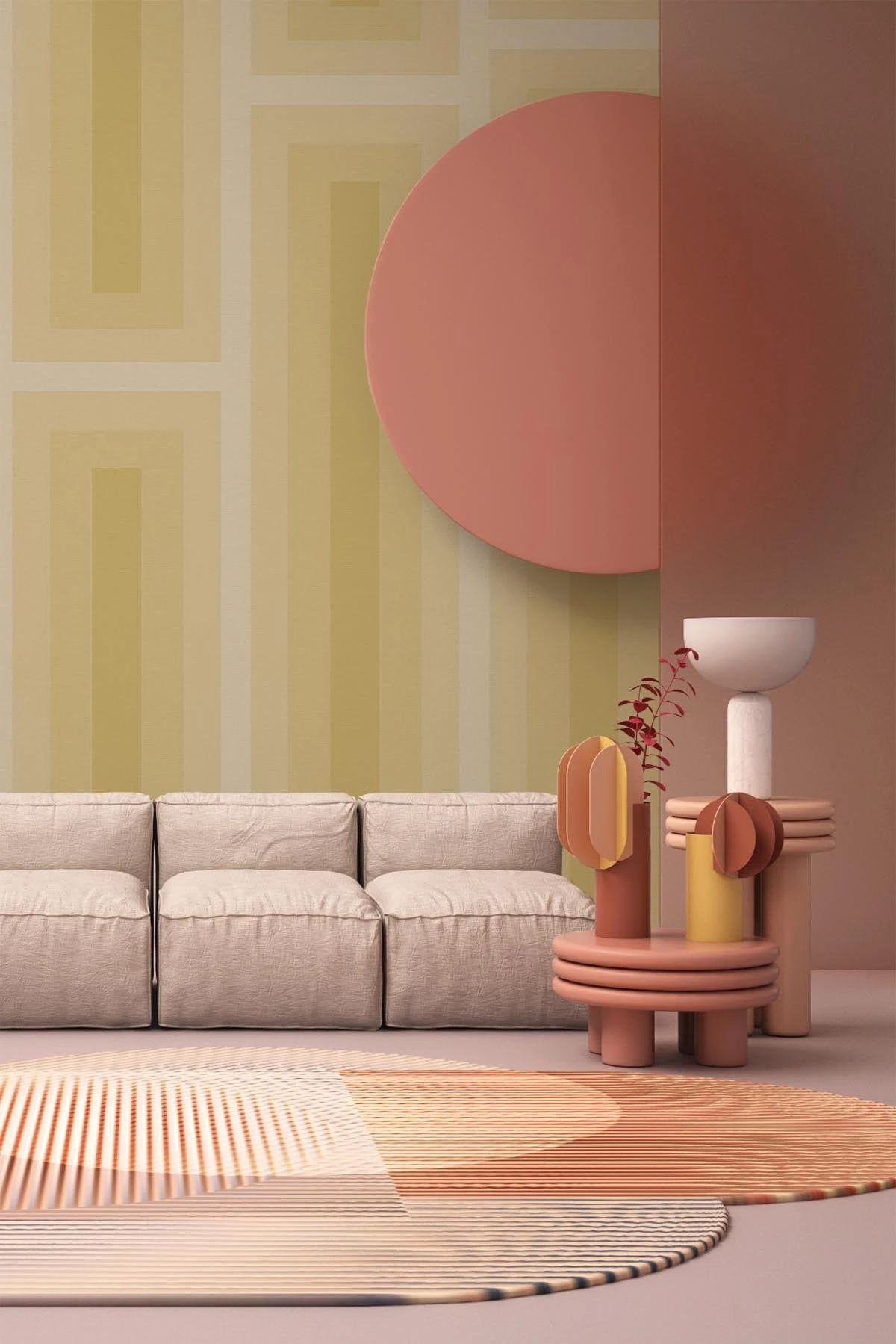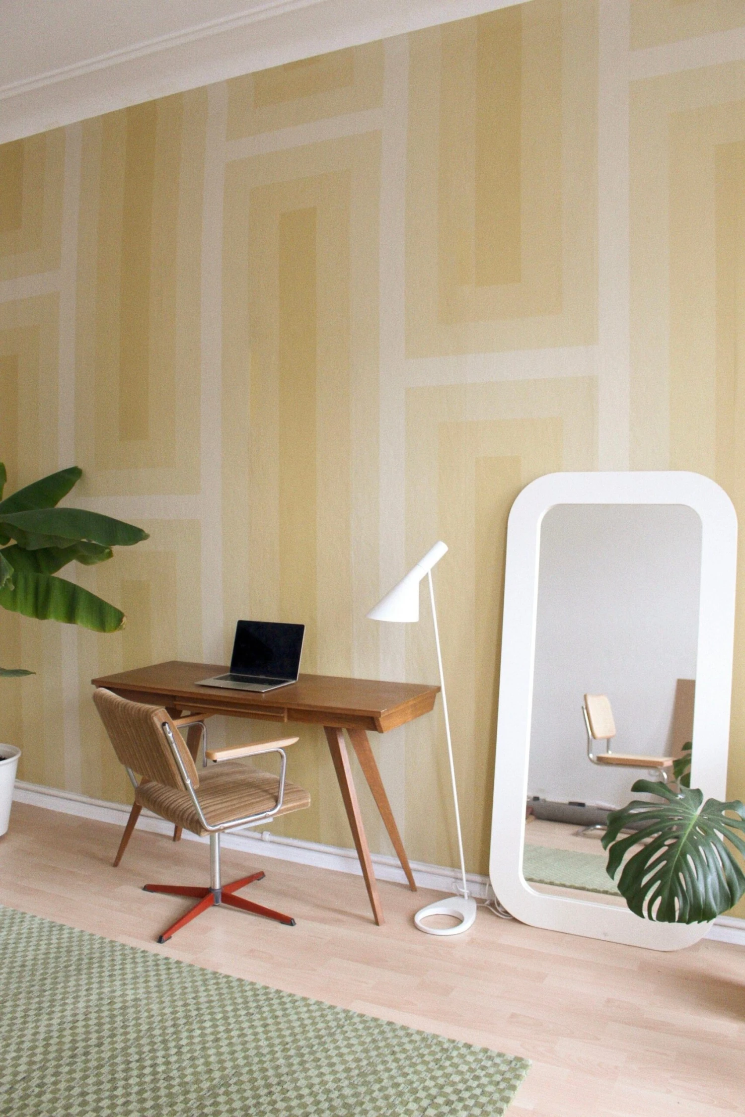 A large scale wall mural that plays with both the stripe and checked patterns. The faded colors and irregular placement gives both the design and interior more depth and personality.