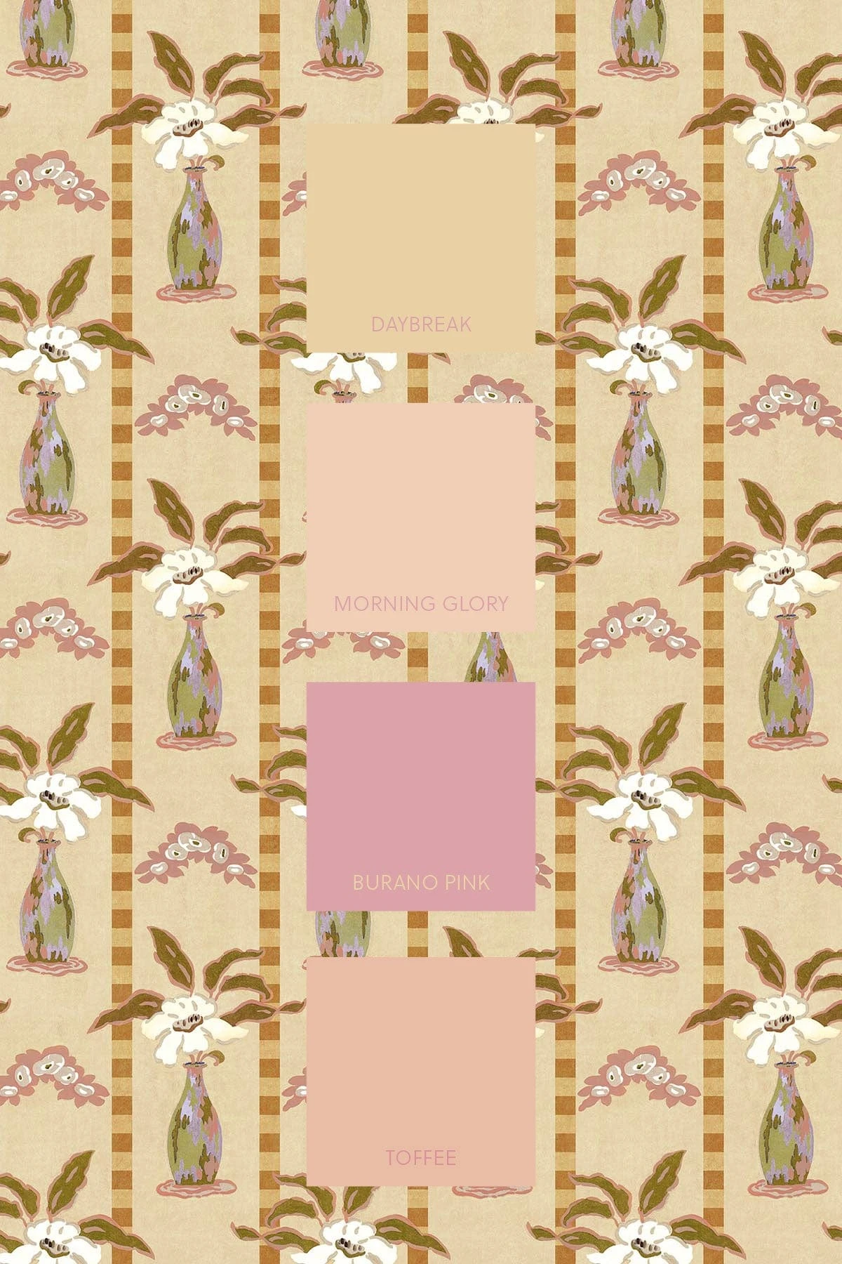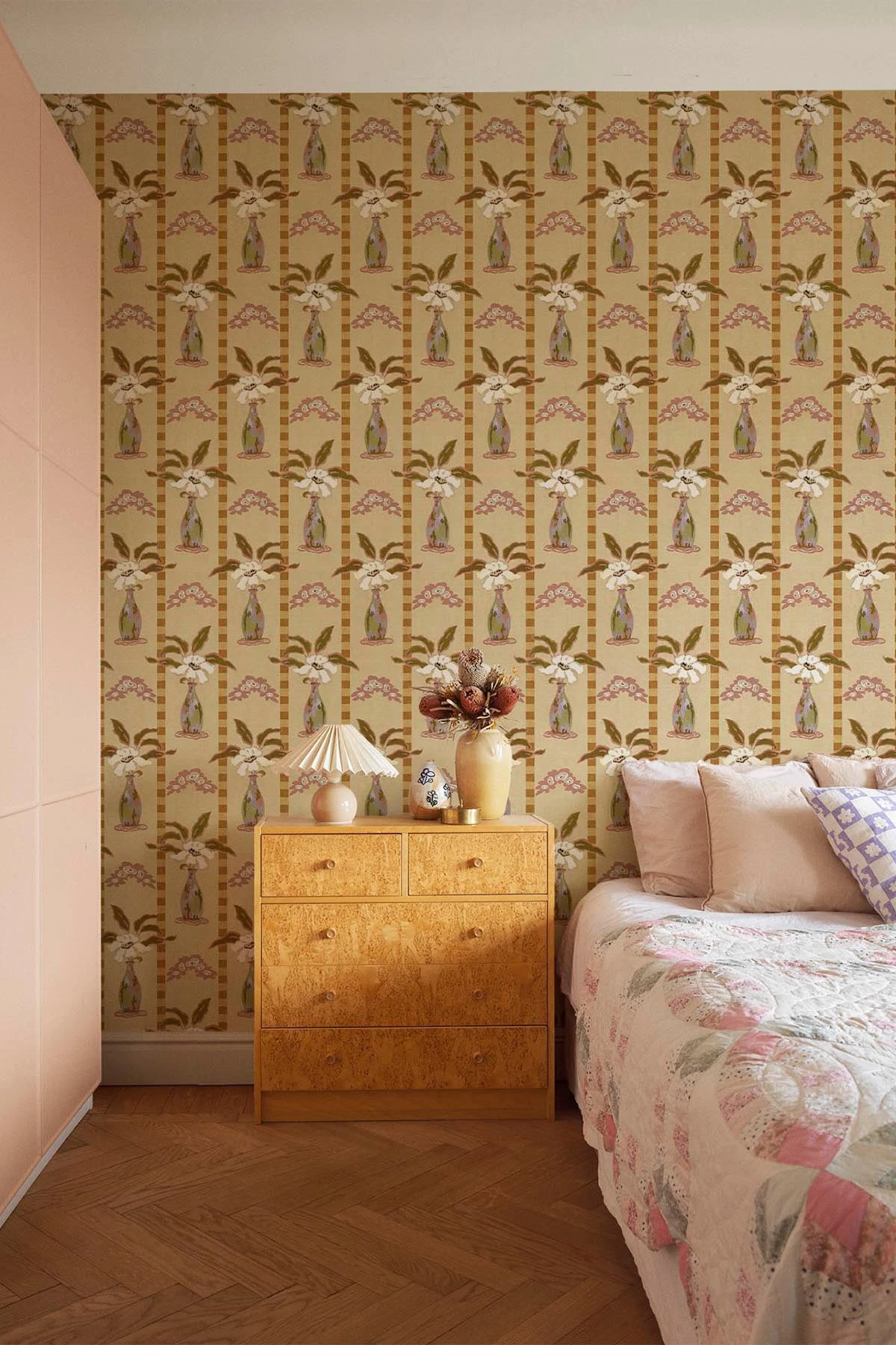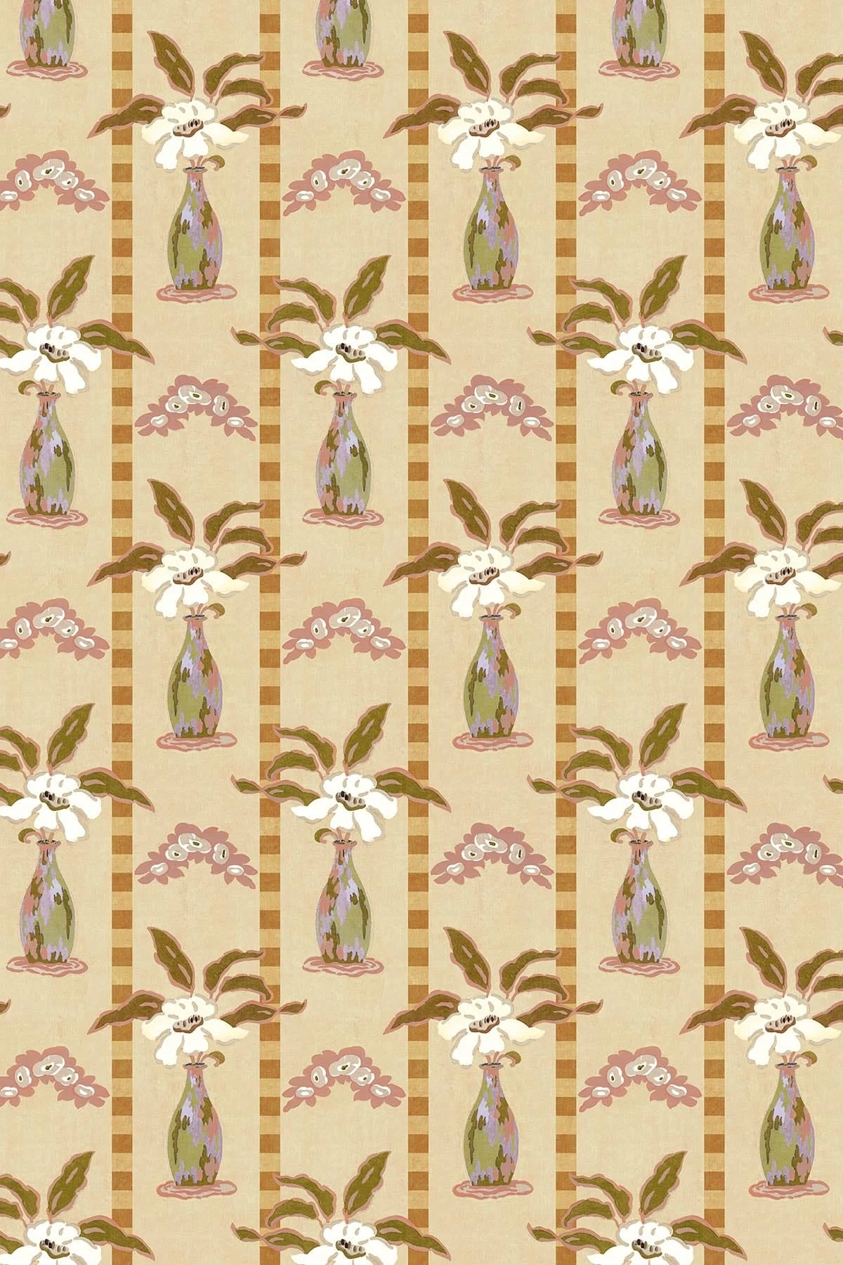 In illuminating tones of yellow mixed with softer shades, this wall mural is perfect for a room where serenity is key. With floral vases and checkered stripes, it presents a unique pattern inspired by arts and crafts alongside modernism. The blend of geometric and botanical designs creates a harmonizing balance.