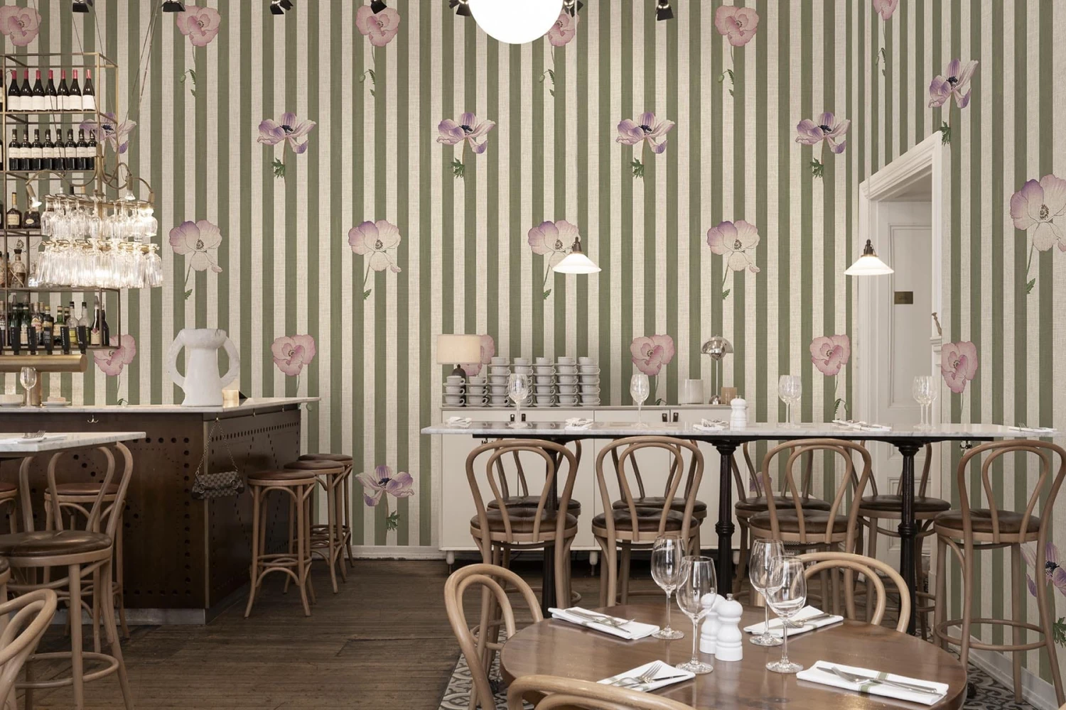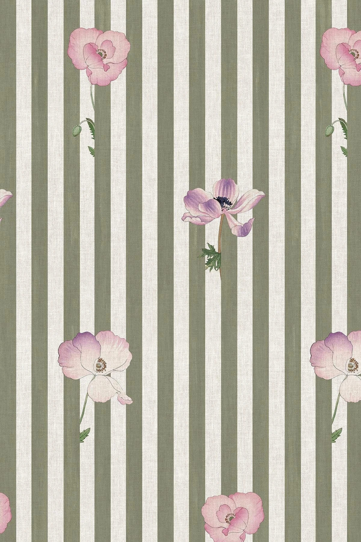 A fresh take on the classic stripe pattern, this wall mural transforms tradition with a maximalist approach. The bold stripes in green & off white are intertwined with lush, oversized blooms, bringing a lively and dramatic twist to any space.
