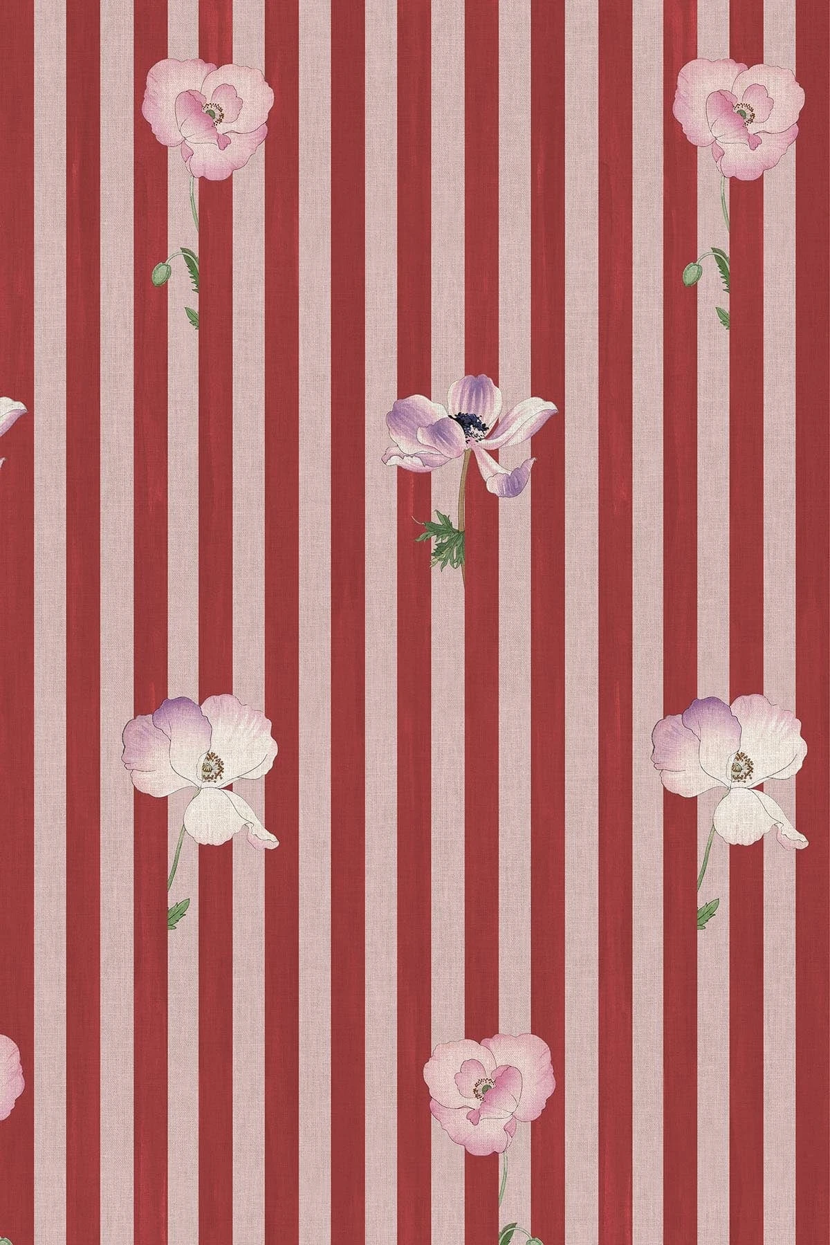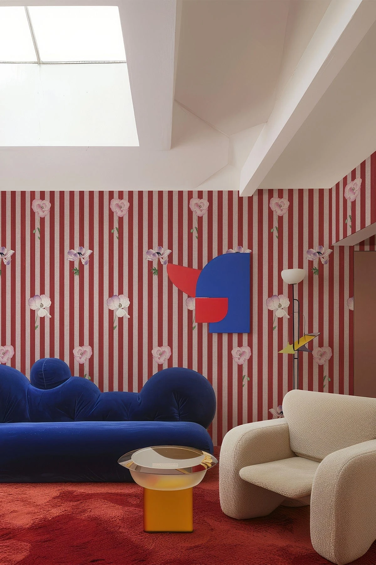 This dynamic wall mural blends the timeless elegance of traditional red & pink stripes with a modern, maximalist flair. The design bursts with life as oversized, vivid florals intertwine with bold, classic stripes, creating a captivating visual experience.