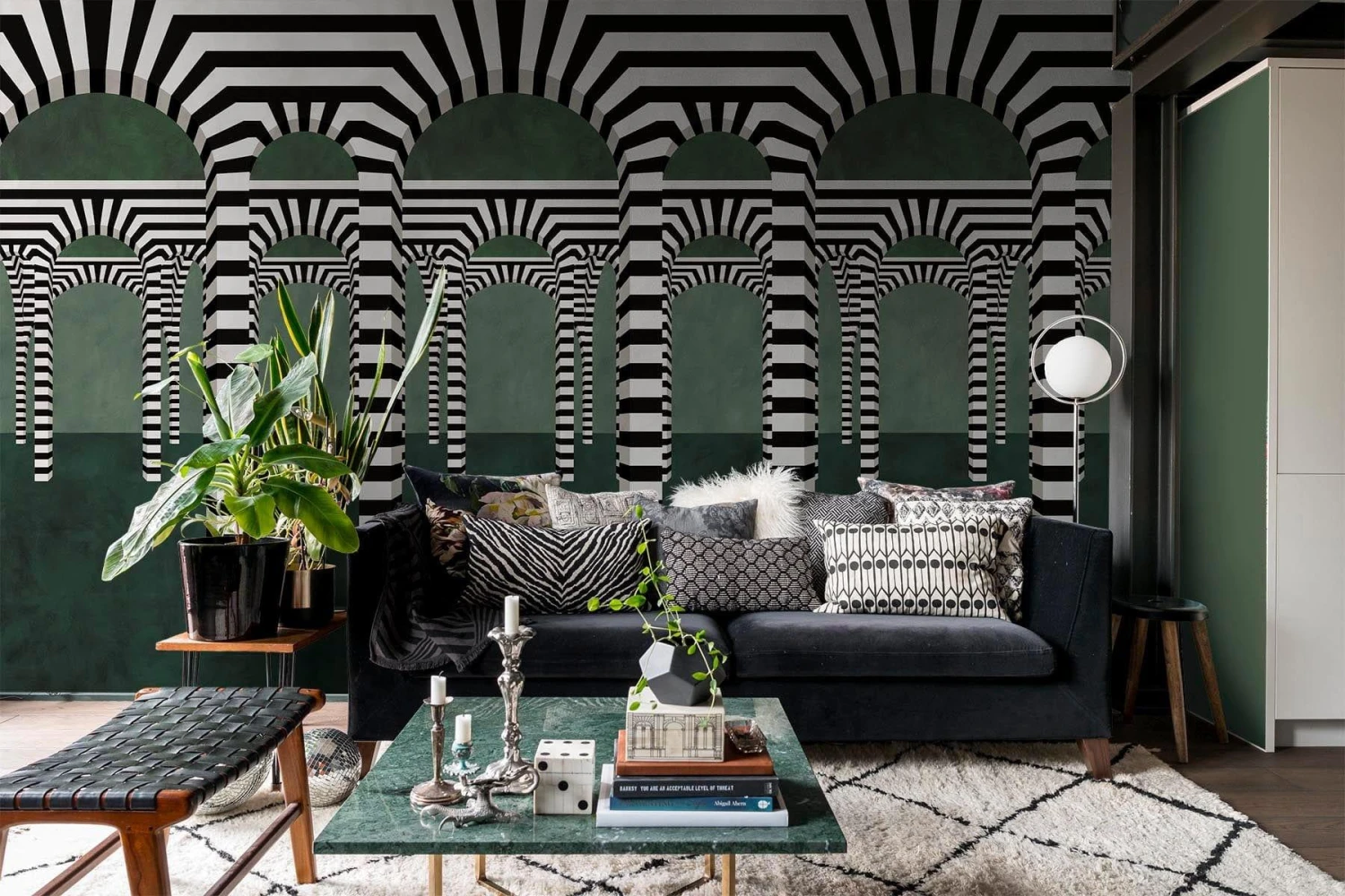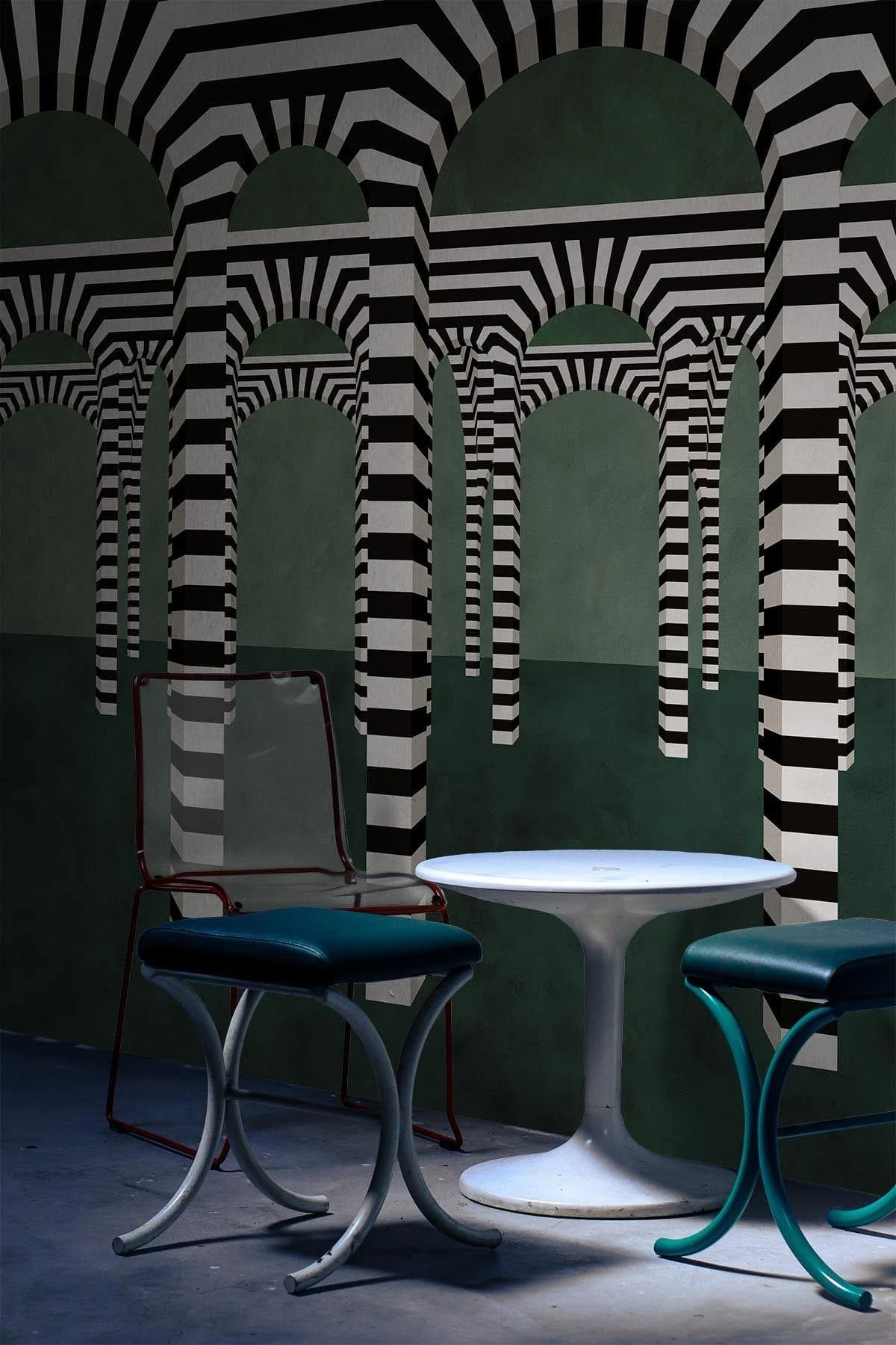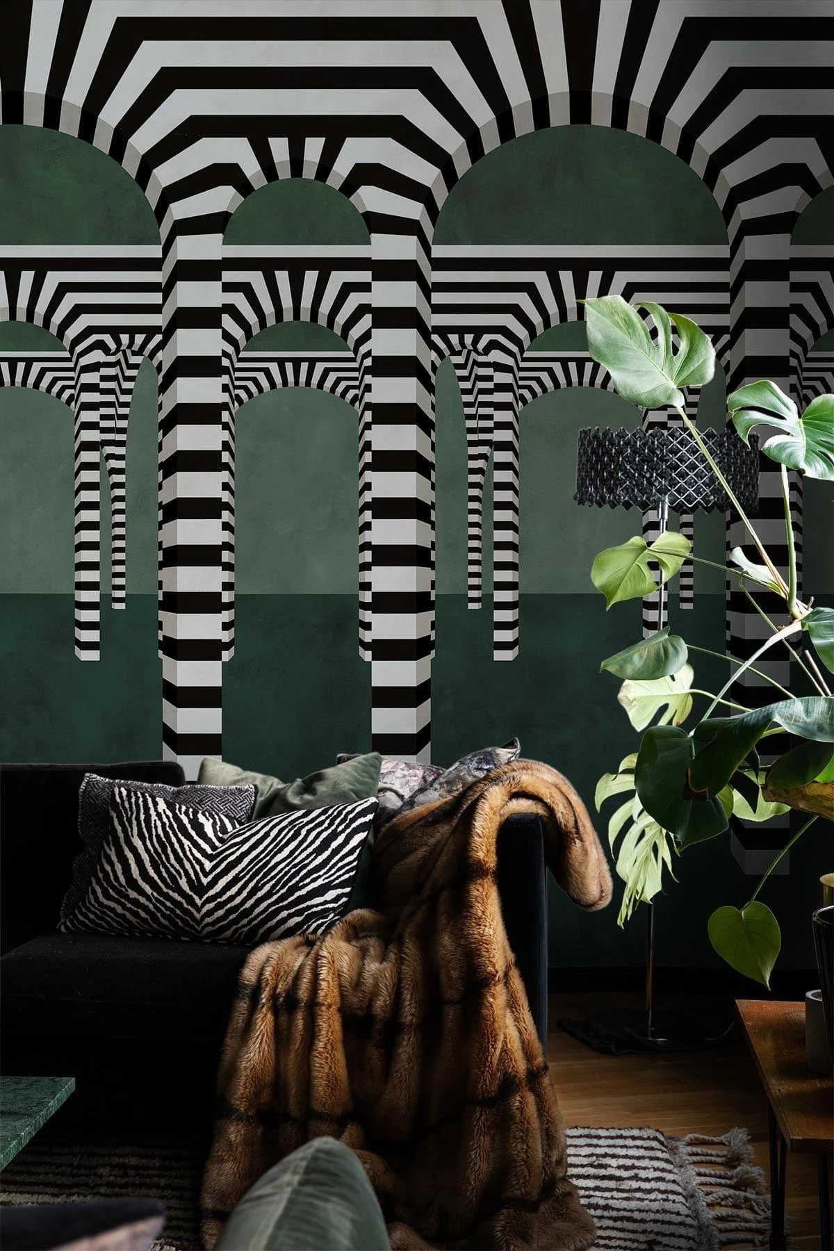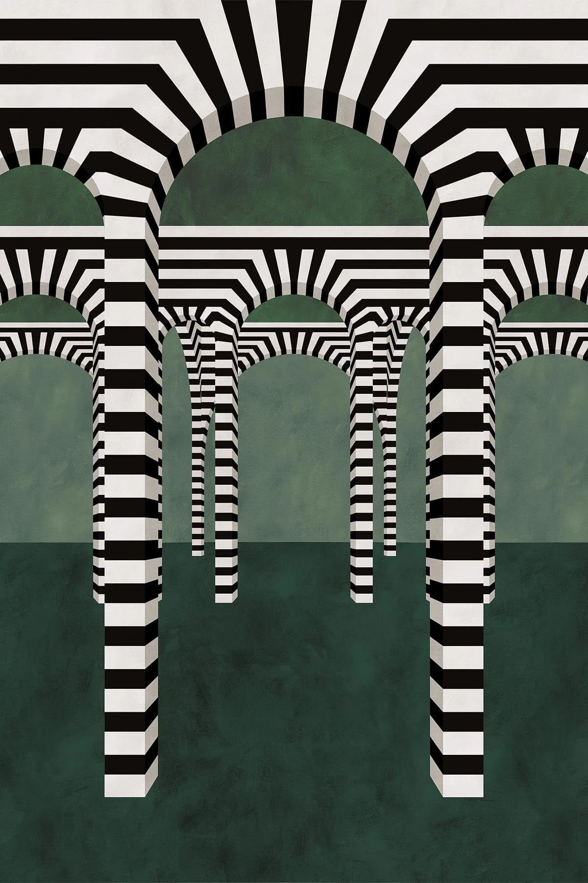 Unveil a world of serenity with our mesmerizing black and white striped archway mural, a true embodiment of elegance and depth. Amidst its intricate layers, hues of lush green unfold, creating a haven of tranquility that invites you to step into a harmonious realm of natural beauty.