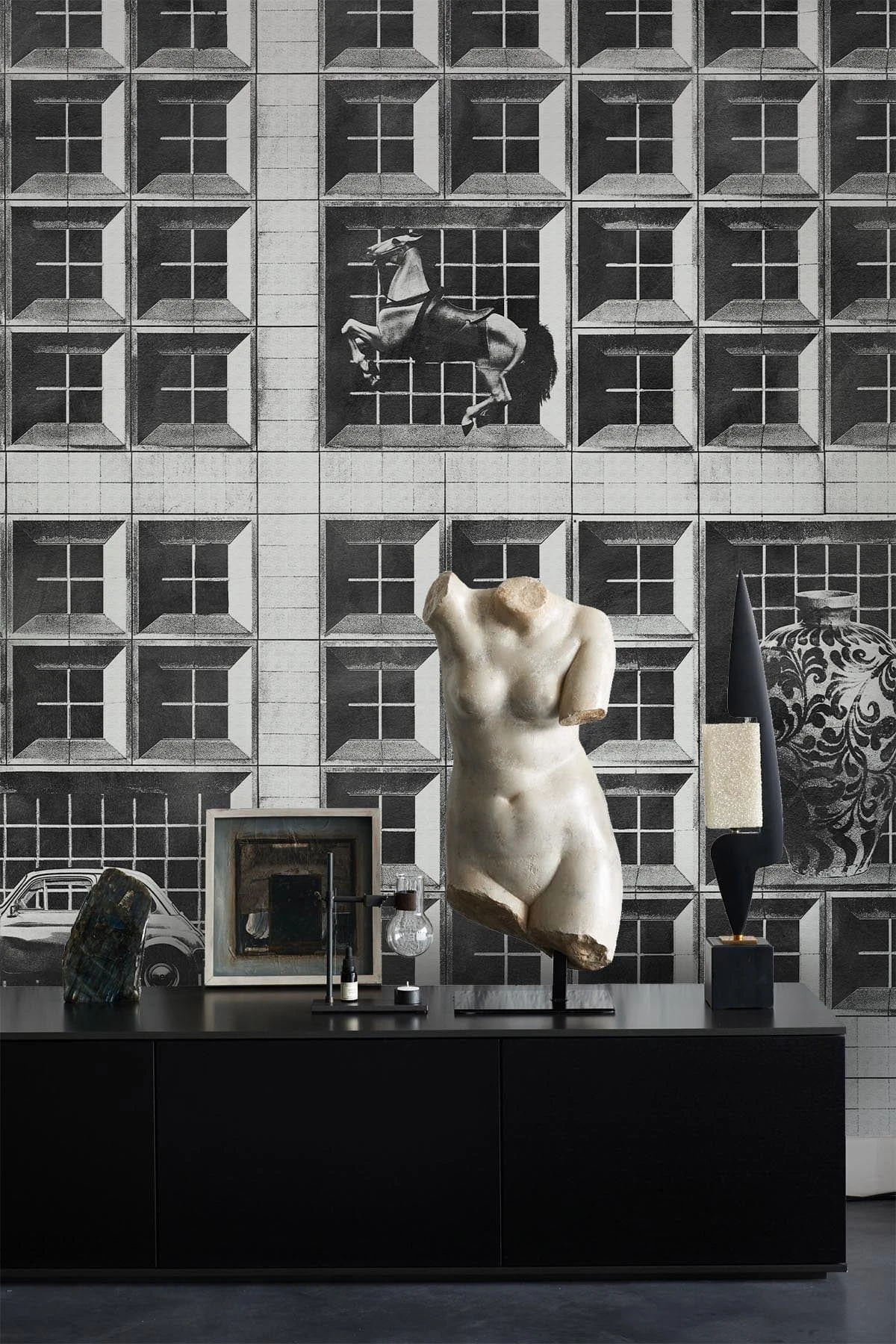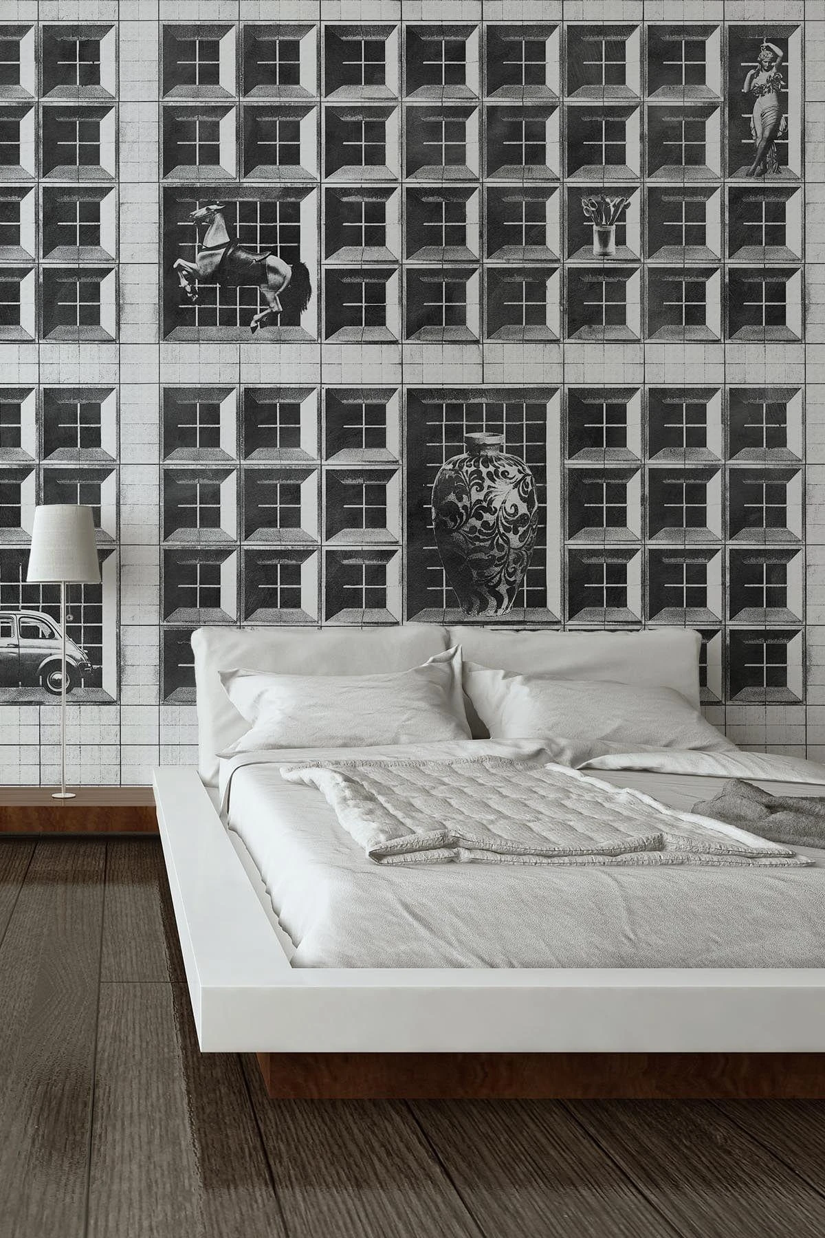Welcome to Surreal Window, a bold and unique design. A house facade covers the wall with geometric windows, creating an illusion of a curated exhibition. This design adds depth, a unique spatial narrative, and turns ordinary walls into conversation pieces, just like a surrealist work of art.