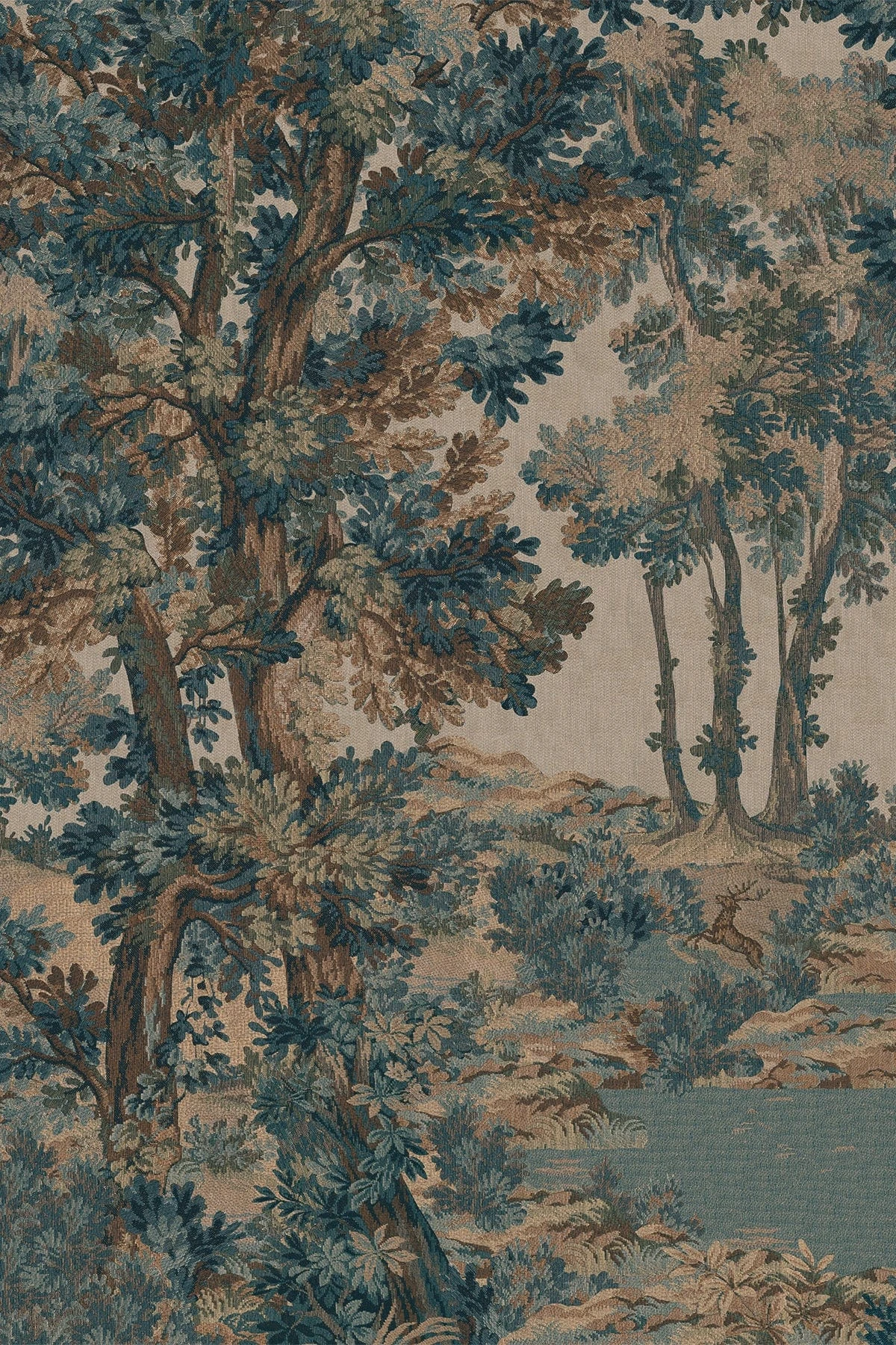 This antique tapestry wall mural in muted tones of teal, blue, and brown depicts a serene pastoral scene, harking back to the rich history of tapestry art. Tapestries have evolved from the ancient Egyptians and Incas, who used embroidered fabrics as shrouds, to the Greeks and Romans who adorned their temples with these intricate works of art.