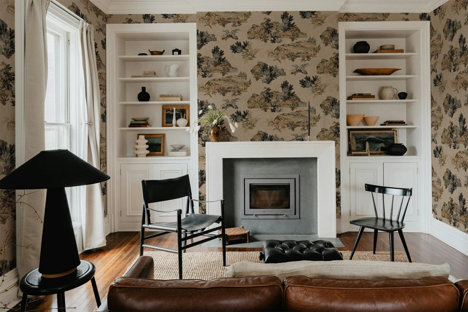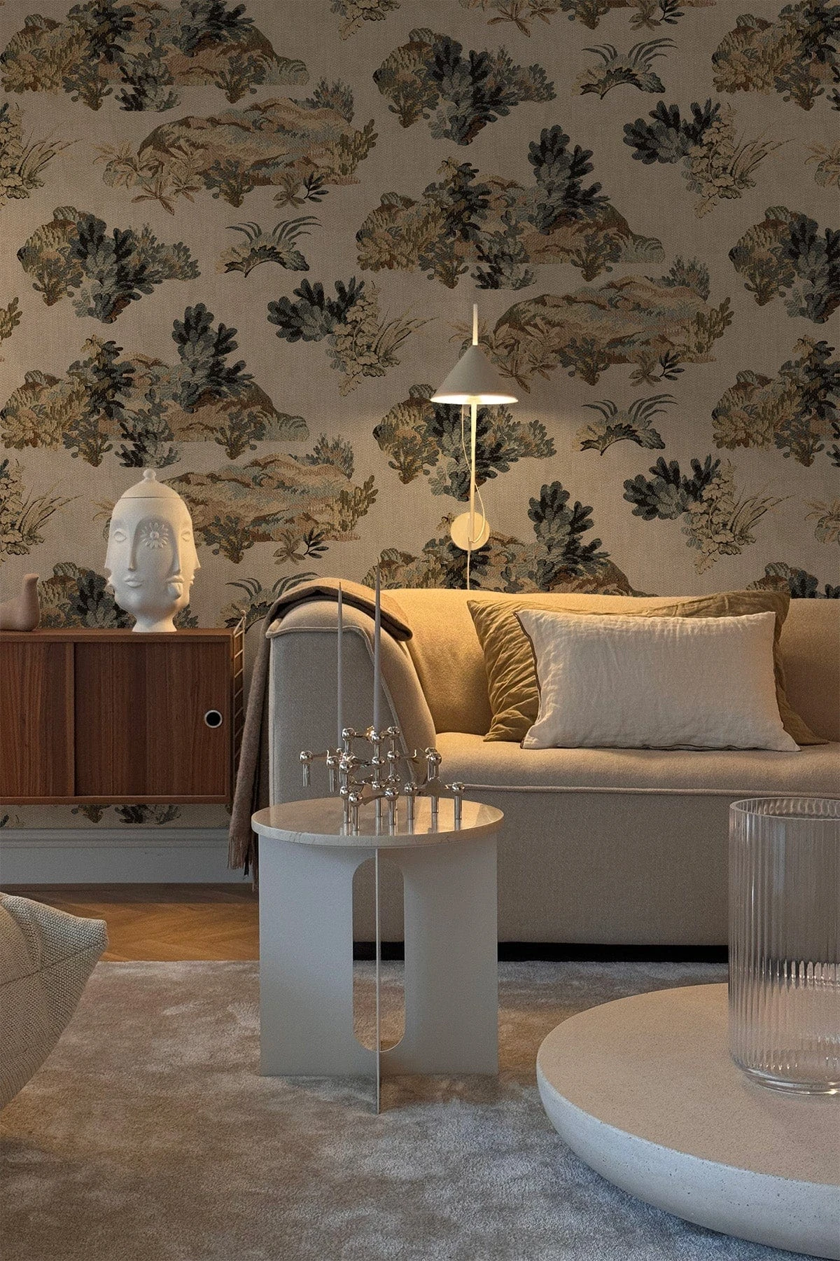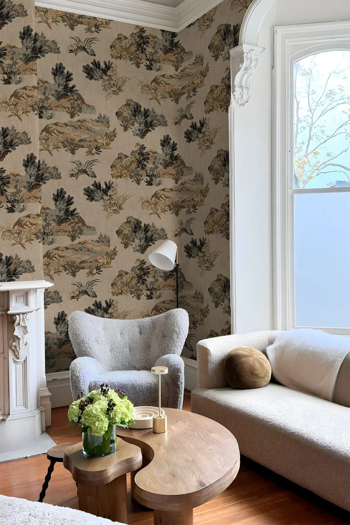 This elegant beige tapestry toile wall mural captures the timeless charm and cultural heritage of early 19th-century design. Featuring intricate pastoral scenes and lush foliage, its muted tones of beige, greens, and browns create a soothing and sophisticated backdrop.