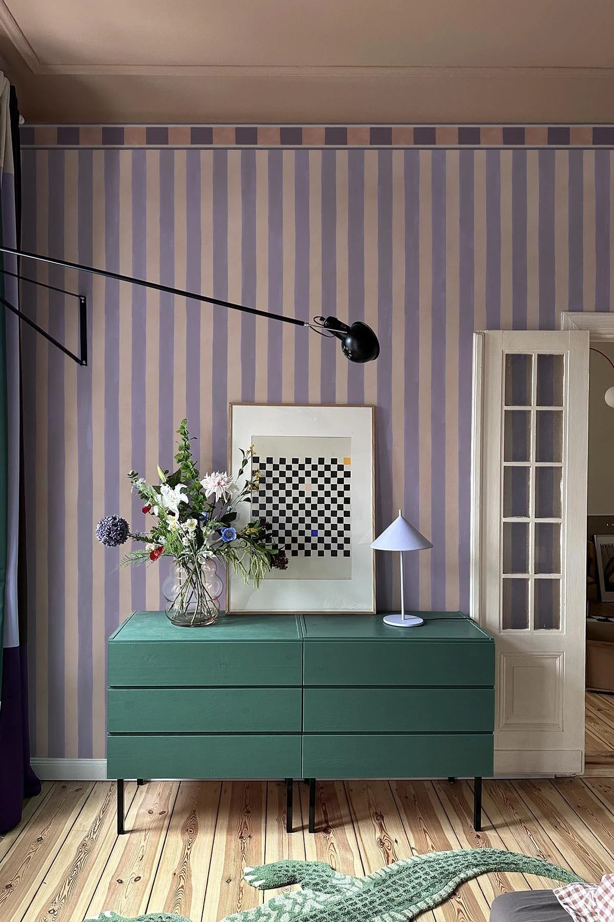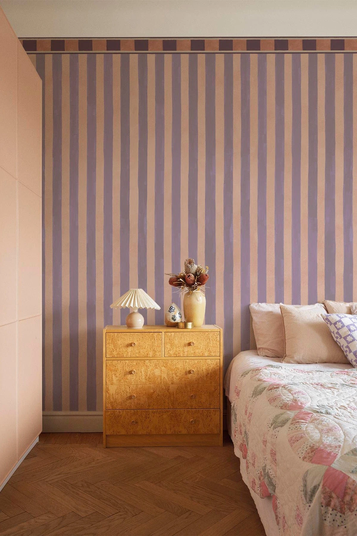 This colorful surprise in pink and lilac shades will add a decorative and memorable touch to every room. Featuring a traditionally striped pattern with a border, the wall mural design combines classic elements with a contemporary color palette