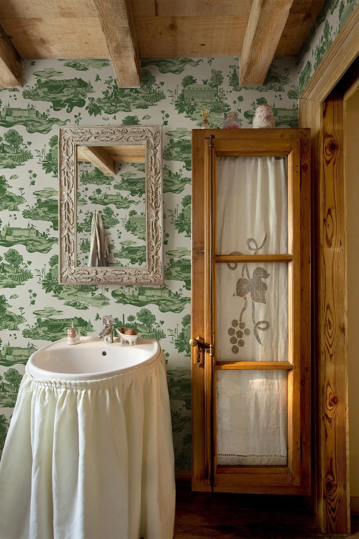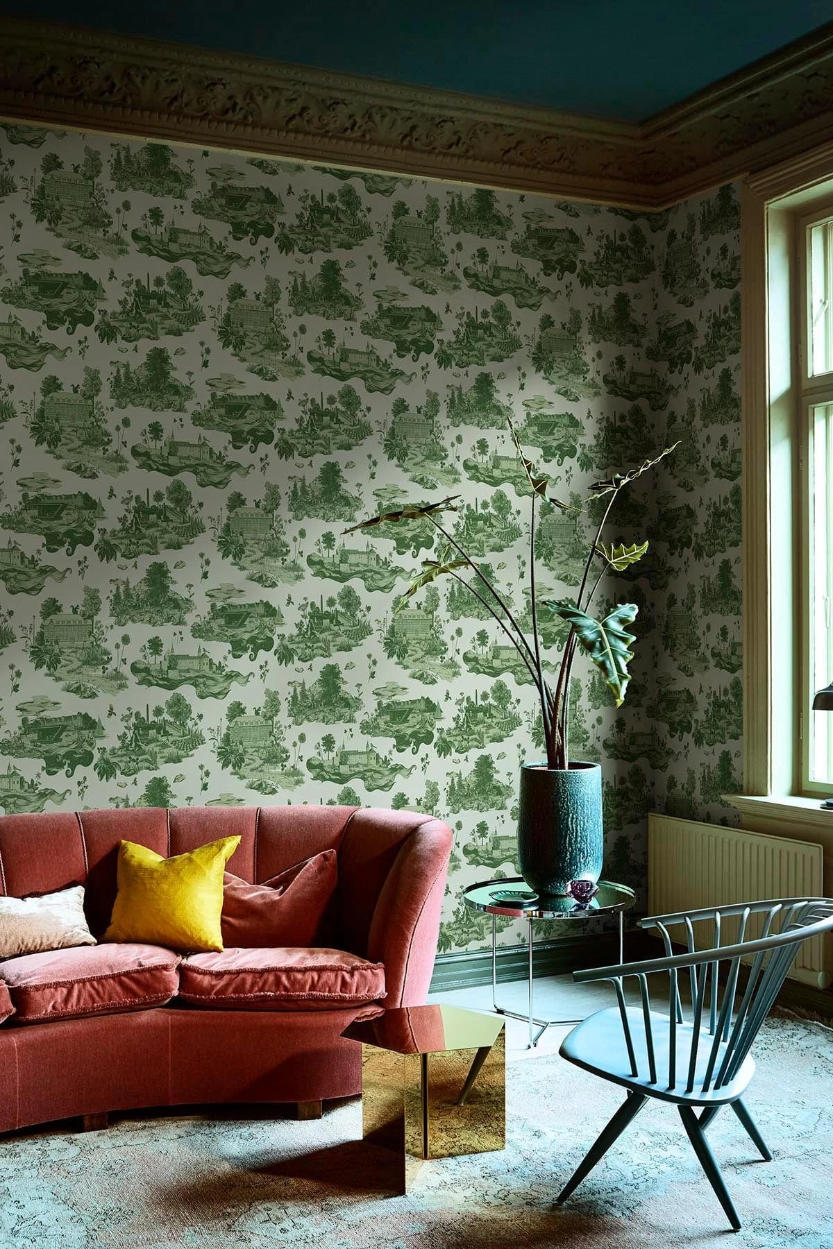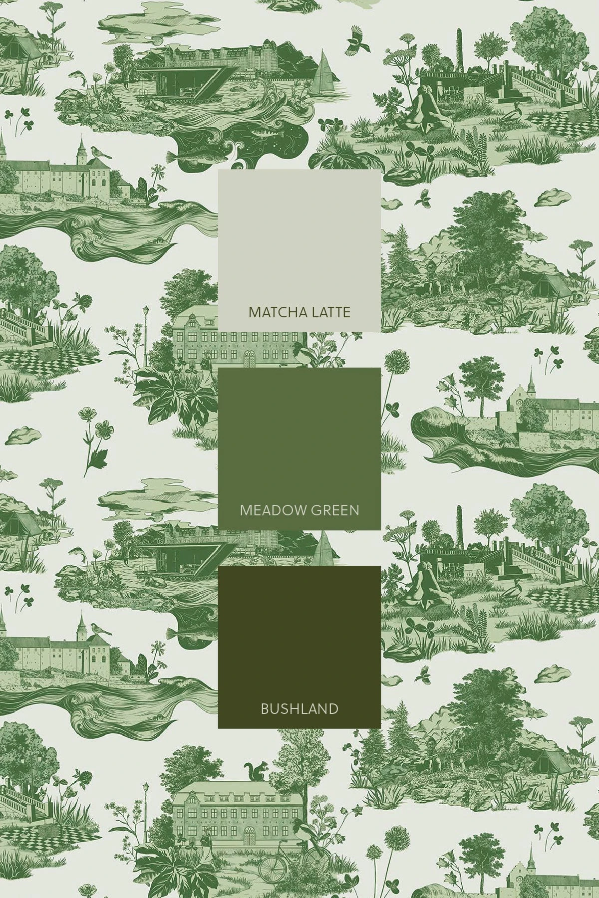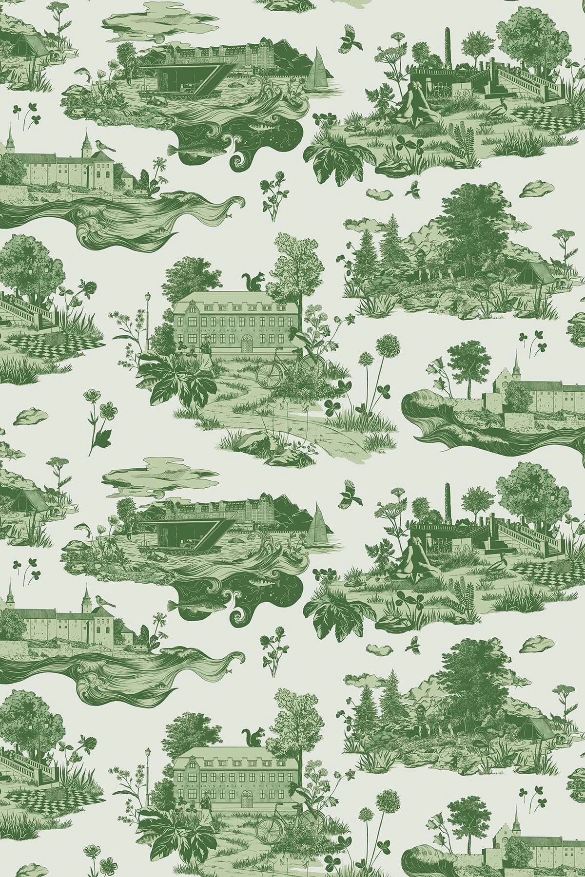 With modern twists combined with classic design, this toile wall mural is a unique piece of contemporary art. Drawing inspiration from the older part of Oslo, elements such as the KOI headquarters, Kvadraturen with a modernly dressed woman walking by can be discovered. This detailed wall mural in soft green shades will suit any wall in your home and bring a fresh pop of color.