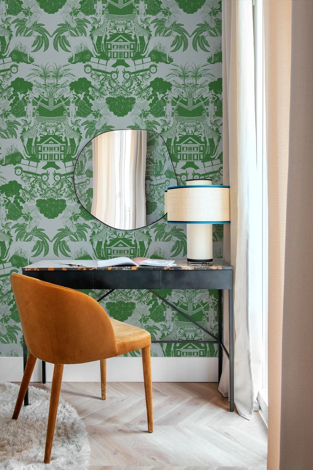 A stunning design full of unexpected details. The more you look the more you find, a true storytelling design that never goes out of style. Toile de Medallion suits both in a personal home as well as for a stunning hotel bedroom or restaurant. This eclectic blue and green colorway brings joy to any interior and gives the space that self confidence we all love to be surrounded by.