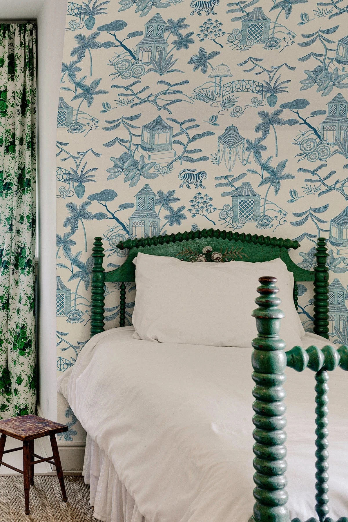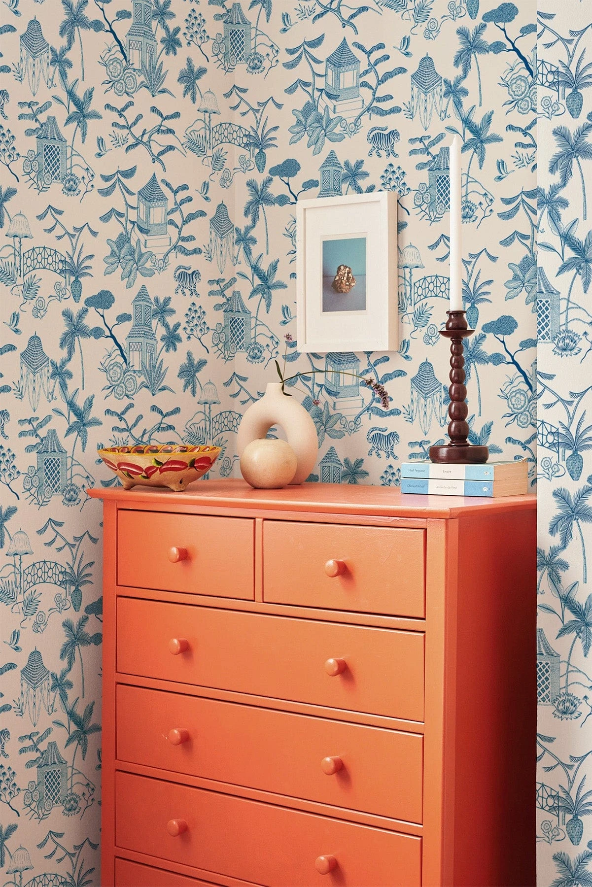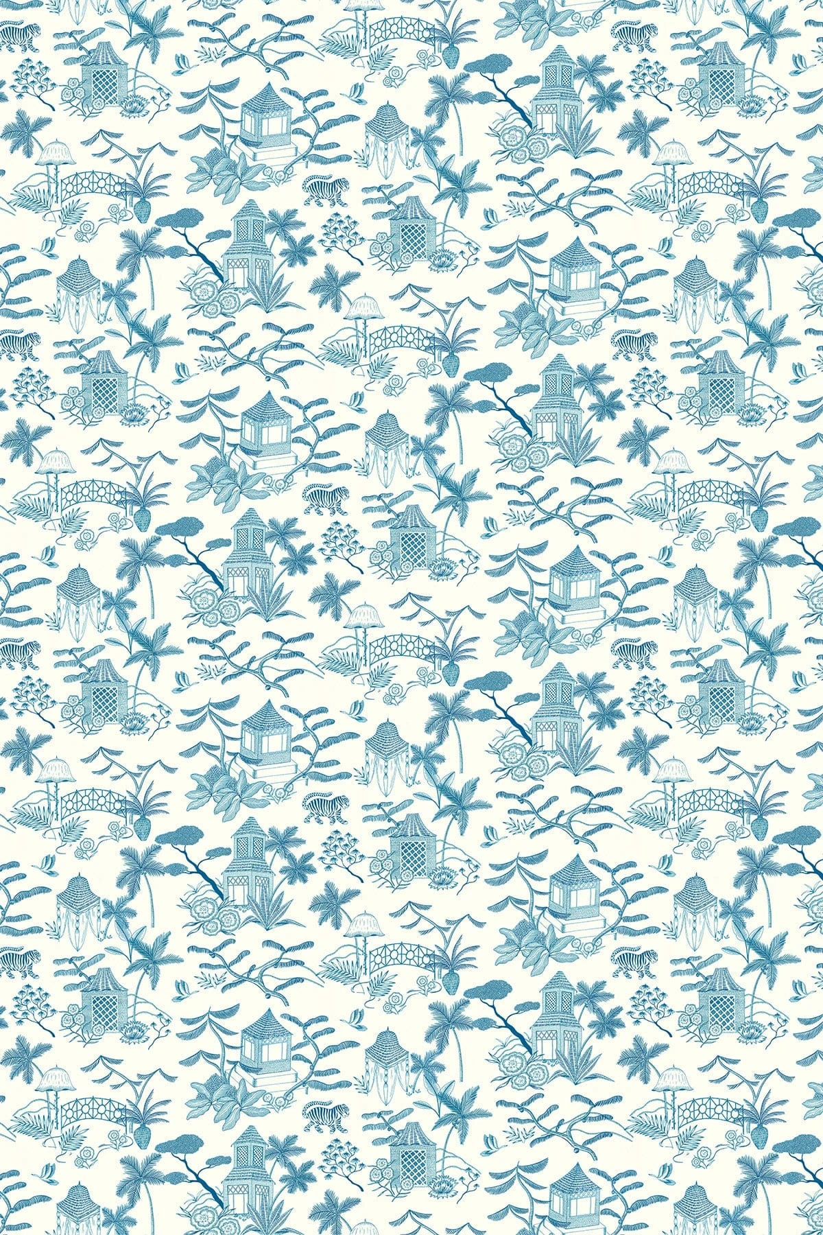 Against a clean white canvas, this toile wall mural captures tropical island scenes in delicate blue linework. Inspired by the centuries-old French toile tradition, the design combines fine artistry with modern precision, illustrating lush palms and island motifs. The subtle colorway adds calm sophistication, making it ideal for spaces seeking a blend of classic storytelling and contemporary style.