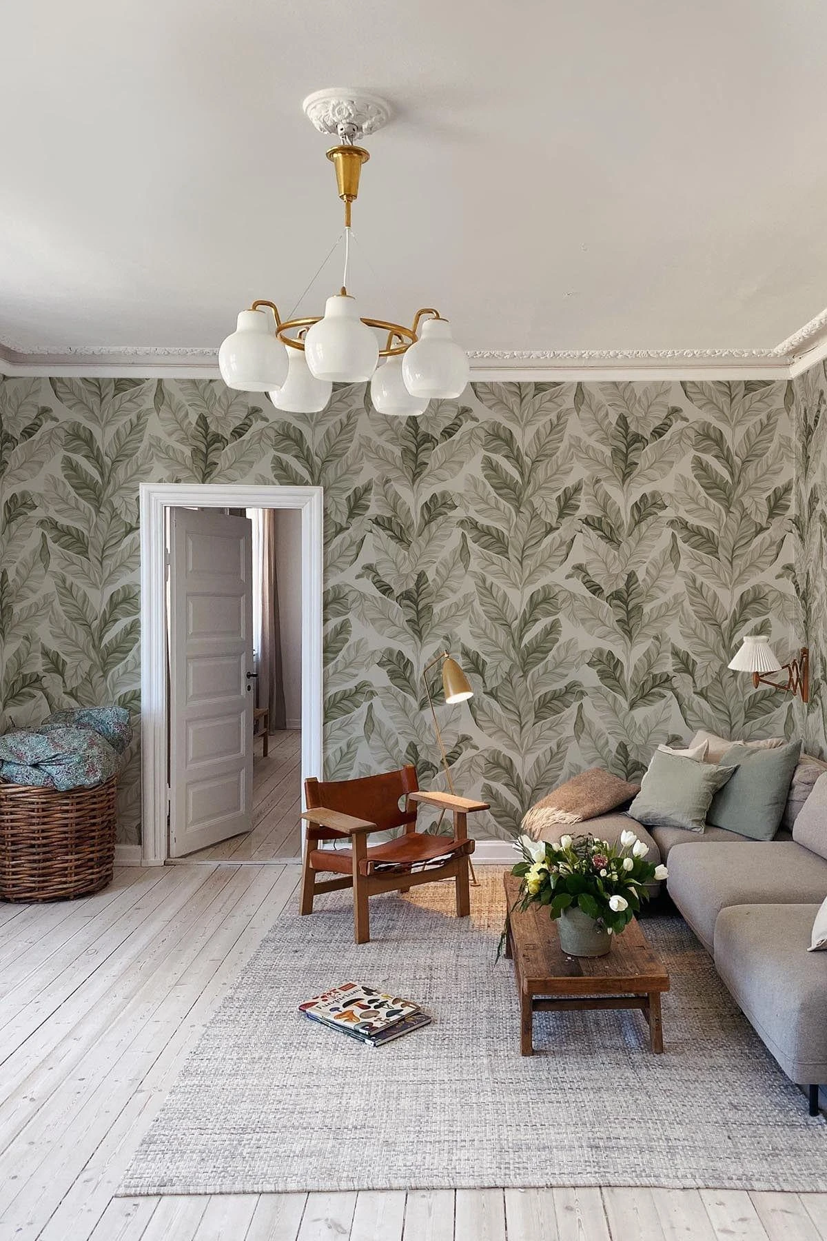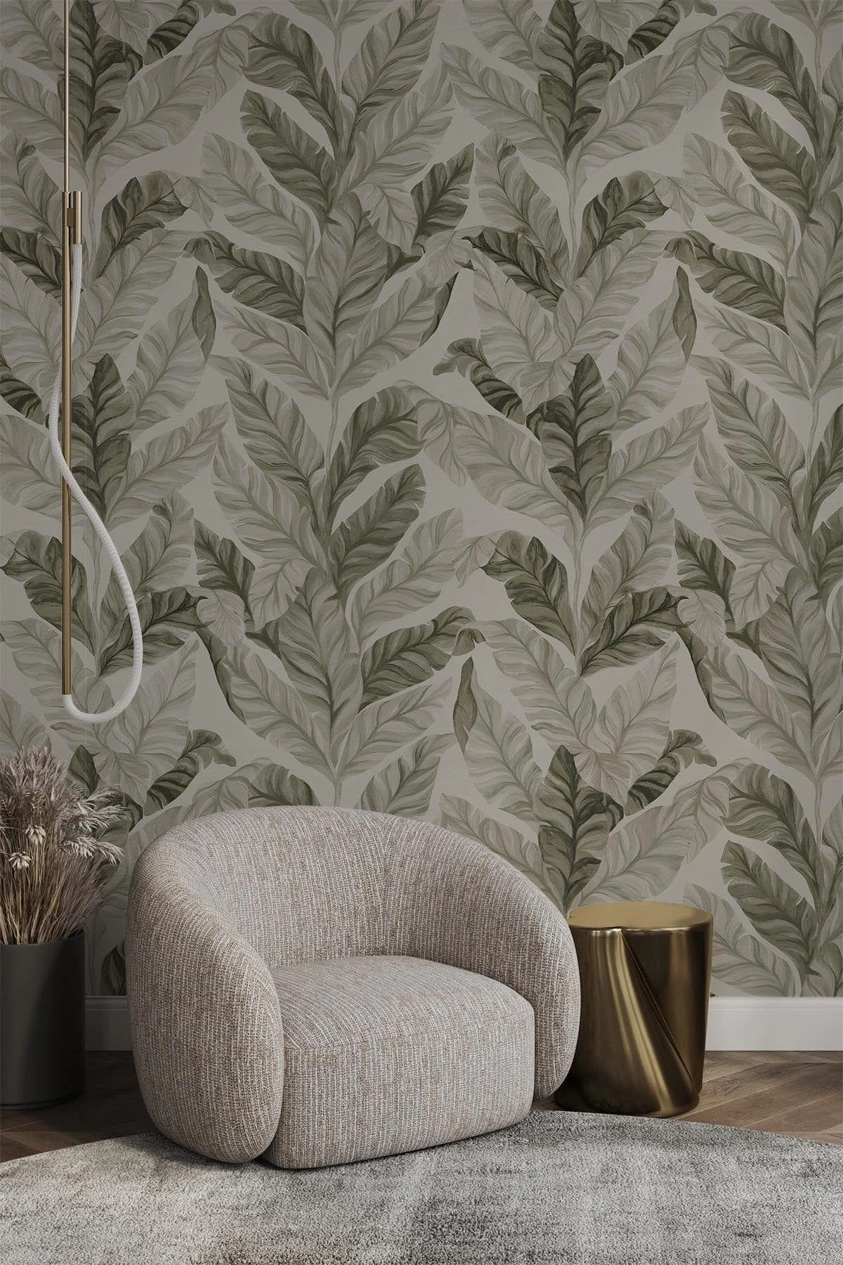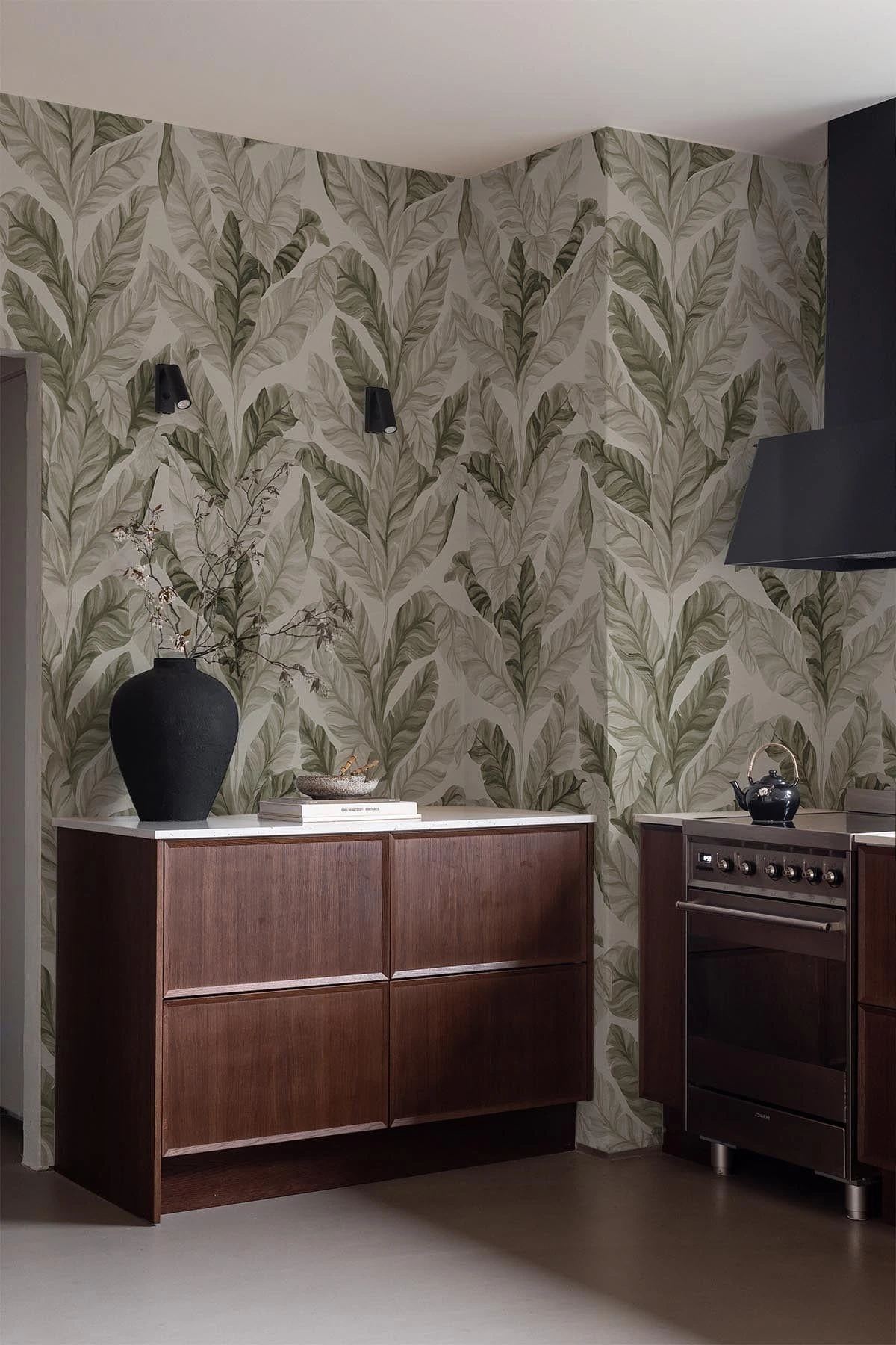 These large abstract banana leaves captured in a tropical soft green wall mural gives this design its natural beauty. A simple yet eye-catching big scaled floral wallpaper that captures your interest as soon as you step into the room. The natural characteristics of the exotic green leaves adds a natural feeling of surrounding yourself with the tropical forest and brings nature into your home.