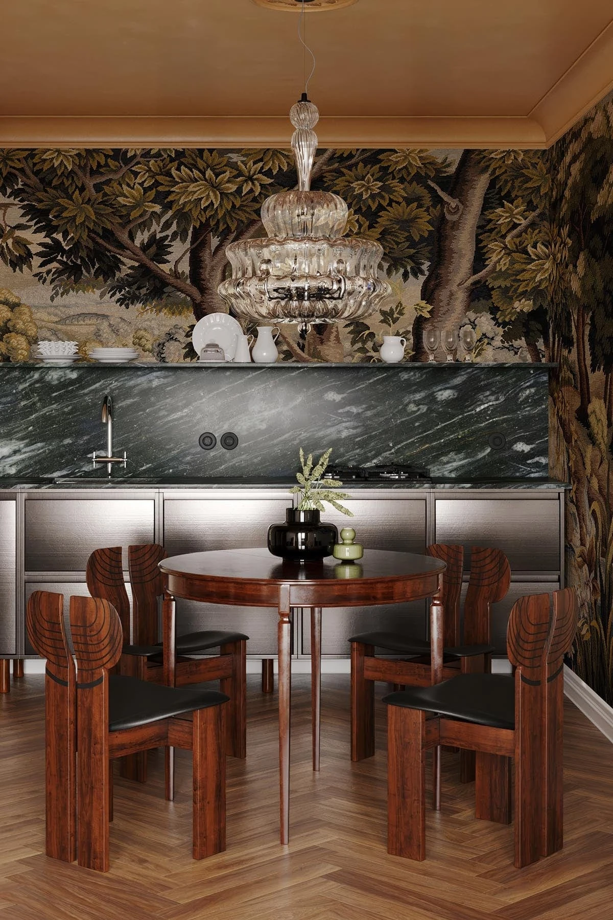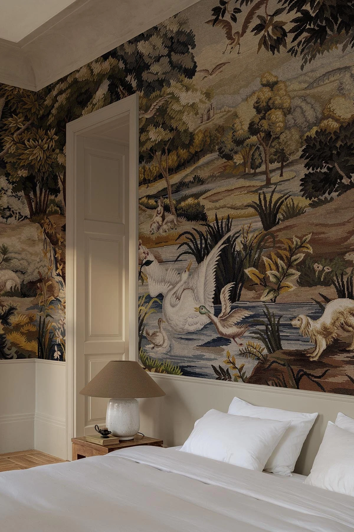 Classic and elegant, Verdant Tapestry in Green Multi echoes the beauty of historical textiles with a soft, natural palette of greens and beige tones. This colorway captures the essence of a traditional woodland tapestry—inviting, refined, and full of gentle charm. The scene of swans and ducks by the riverside offers a timeless narrative, while the neutral undertones make it a versatile statement piece for both modern and vintage-inspired interiors.
