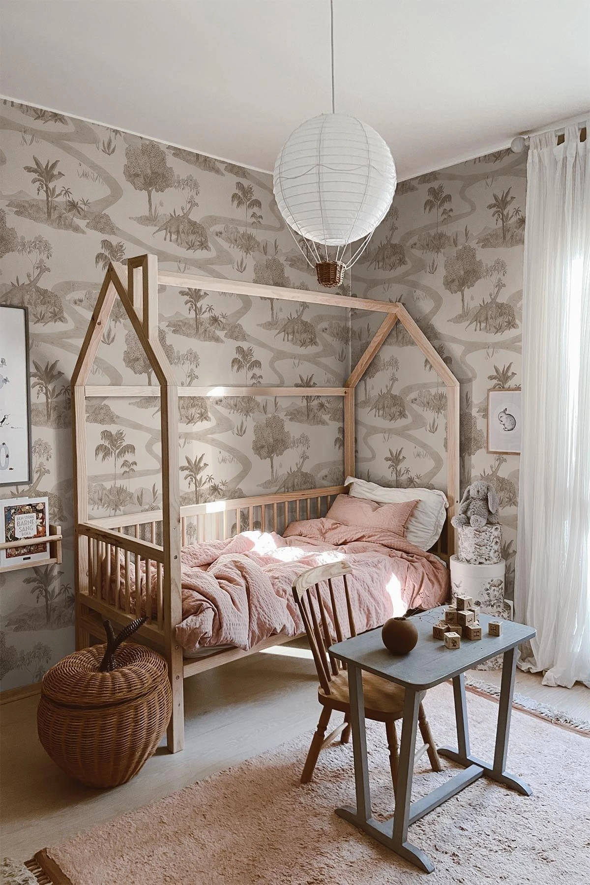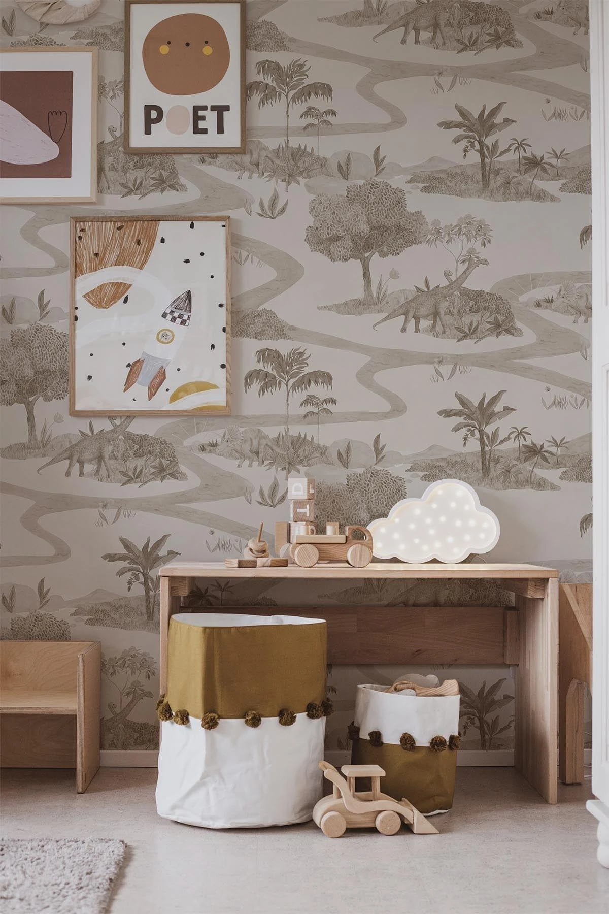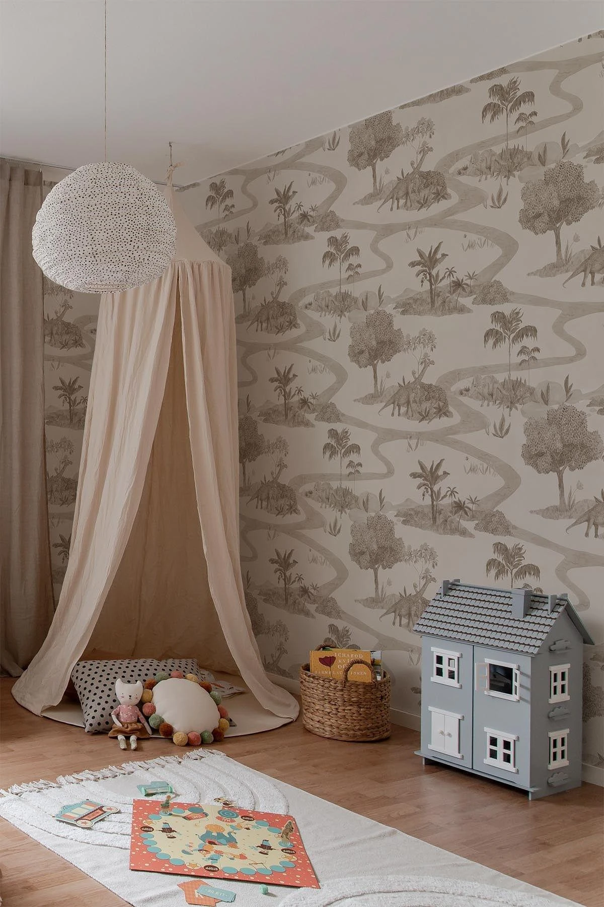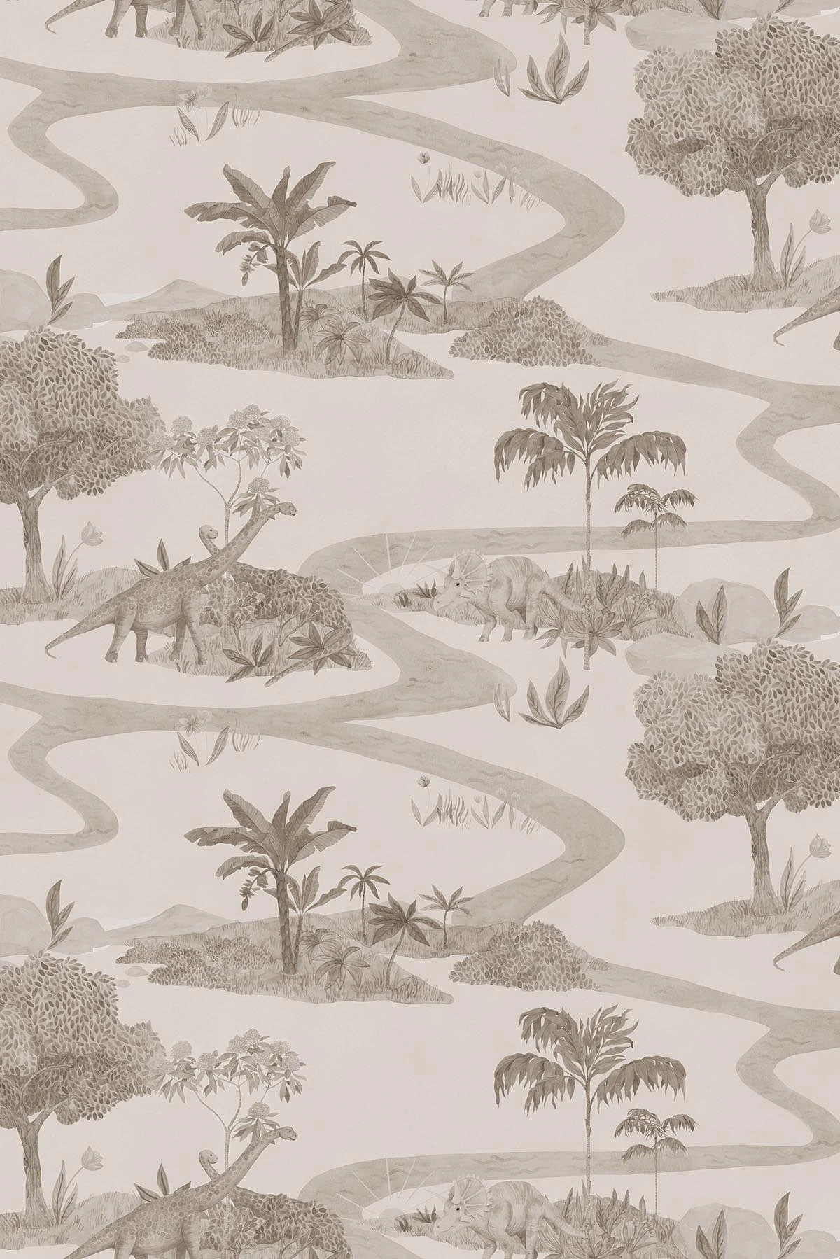 This Dinosaur wallpaper is a toile de jouy pattern that tells a story of a wonderful day in the dreamy park full of natural life. This hand painted romantic and complex pattern is full of blossoms, trees and exotic Brachiosaurus Dinos on their morning walk. A perfect wallpaper for your kids room to encourage play and spark the imagination.