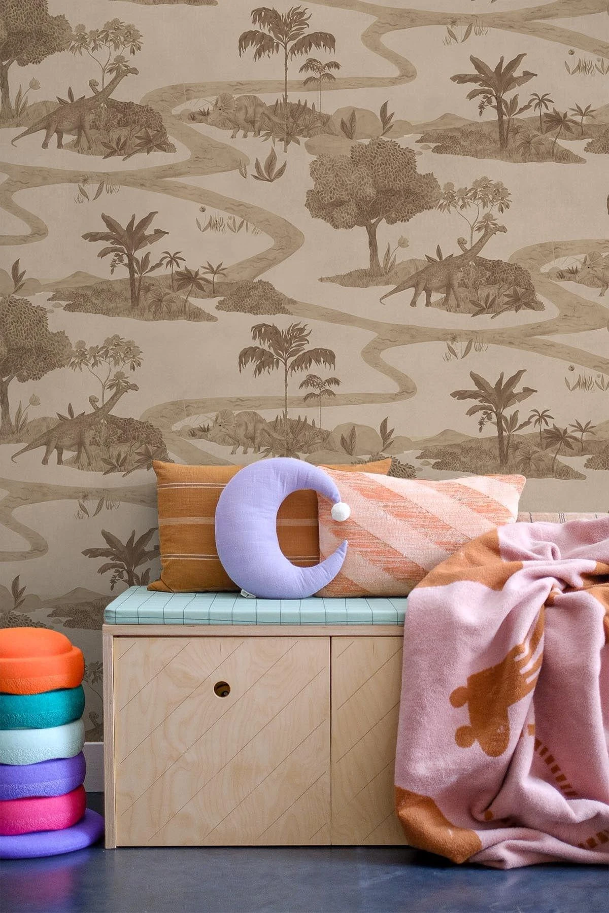 This Dinosaur wallpaper is a toile de jouy pattern that tells a story of a wonderful day in the dreamy park full of natural life. This hand painted romantic and complex pattern is full of blossoms, trees and exotic Brachiosaurus Dinos on their morning walk. A perfect wallpaper for your kids room to encourage play and spark the imagination.