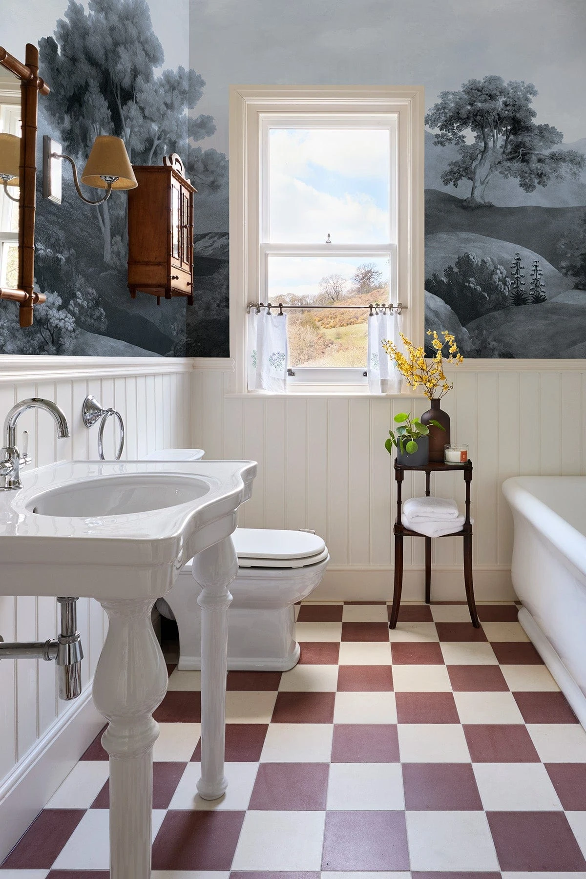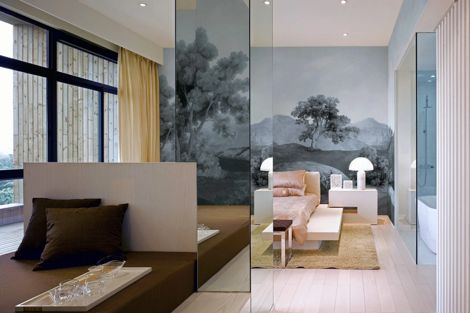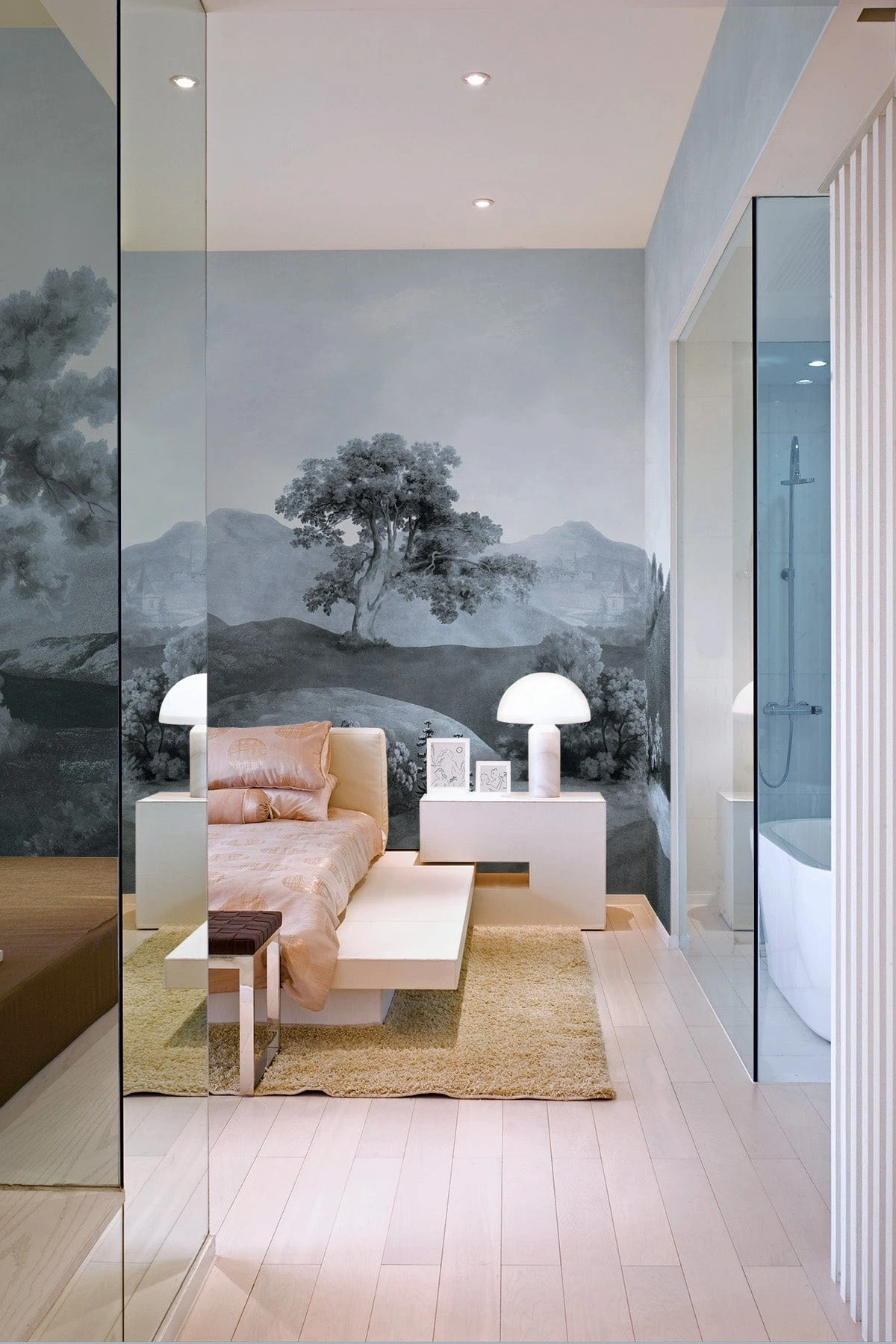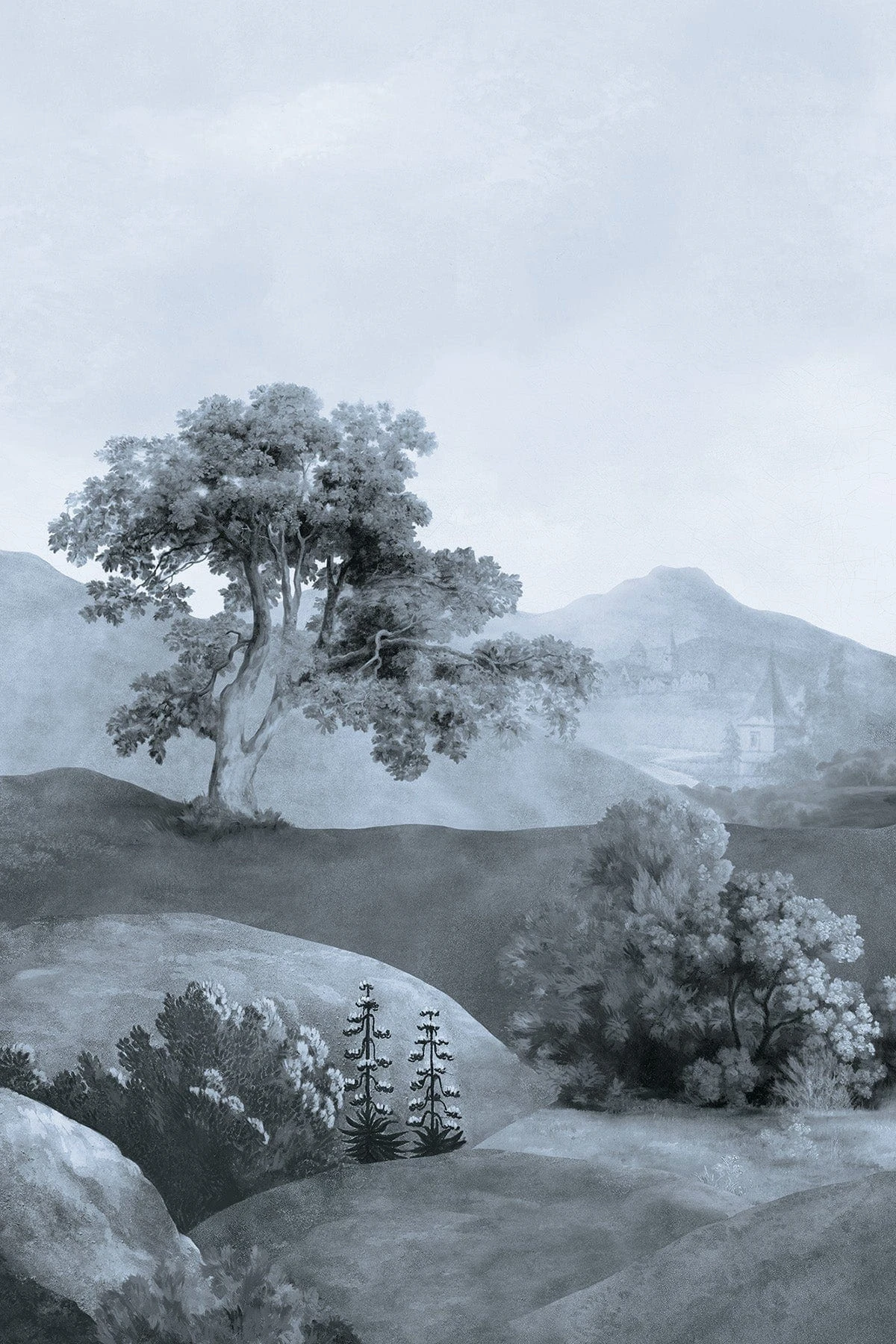 This mural feels like a memory, softened by time. The cool, washed blues evoke early mornings and open horizons, where nature unfolds slowly and beautifully. Every brushstroke echoes a timeless serenity, making this piece a perfect balance between classic landscape art and contemporary interior design.