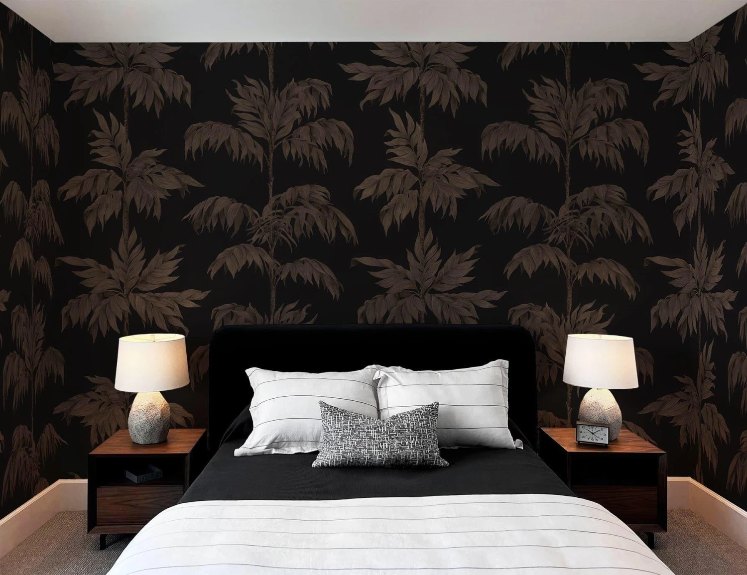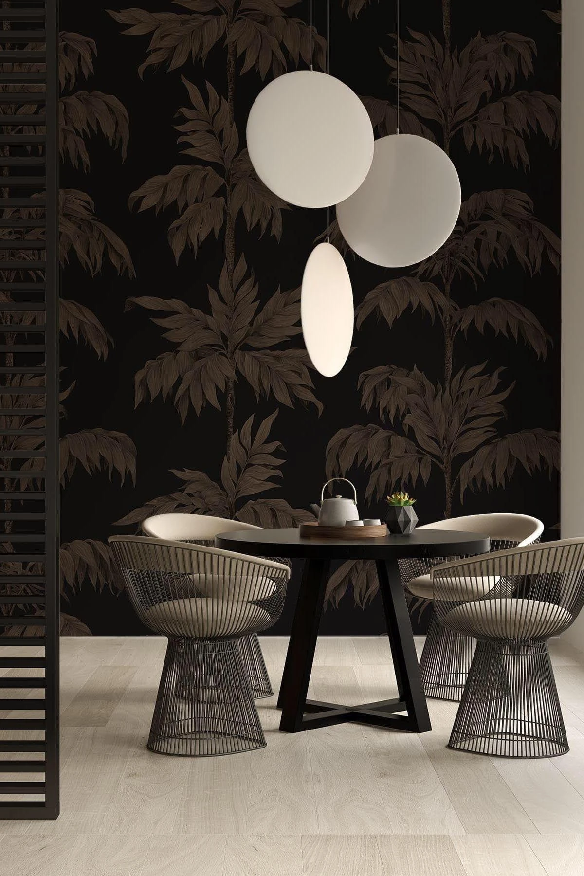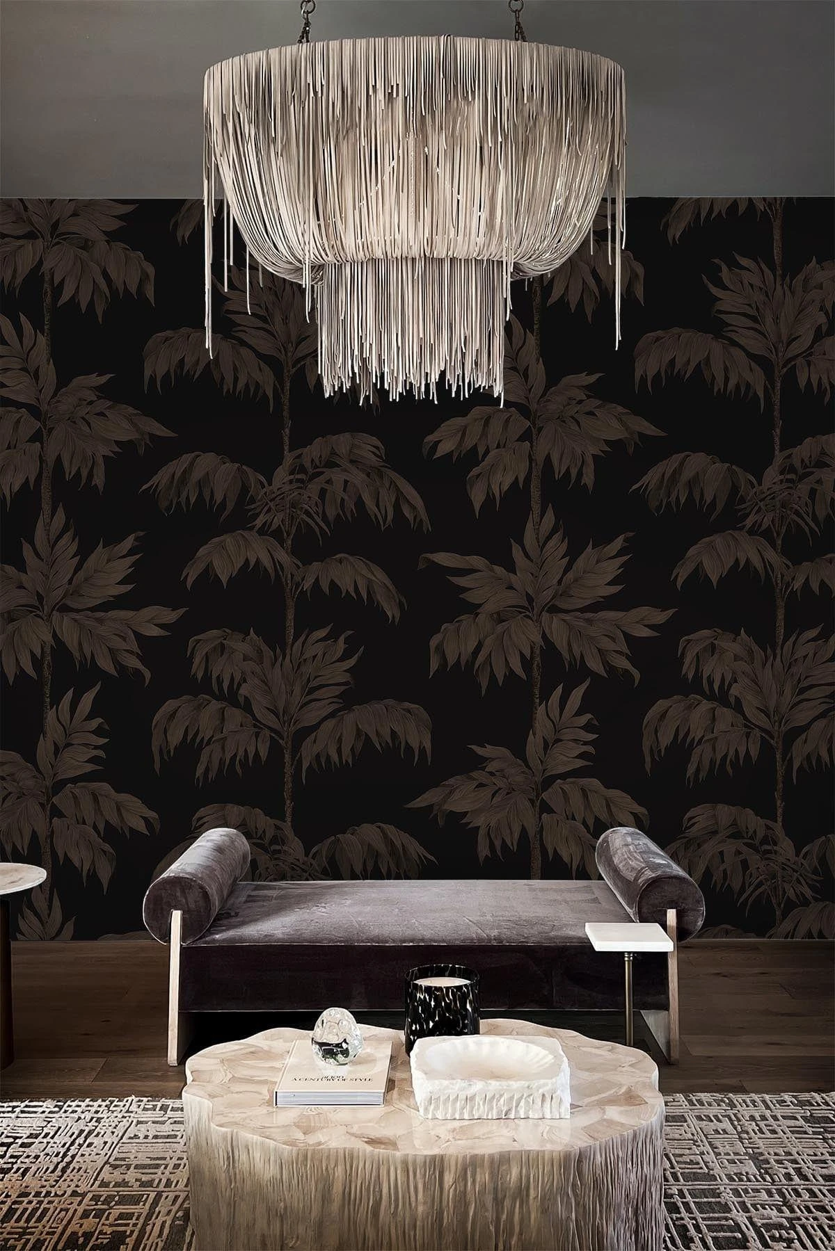 This vintage inspired wallpaper captures the essence of the structure of a palm tree with its natural characteristics. This dark luxury wallpaper is ideal for the dark home with black interior design or black aesthetics for your dark modern house interiors