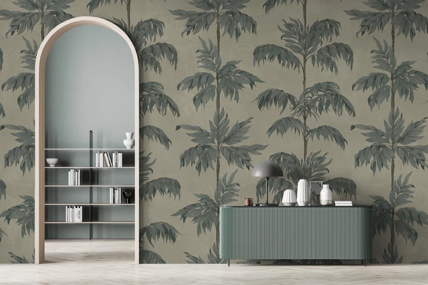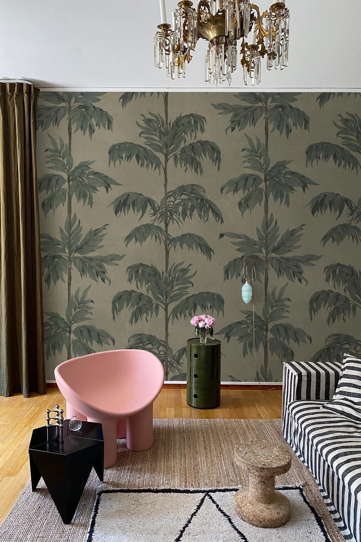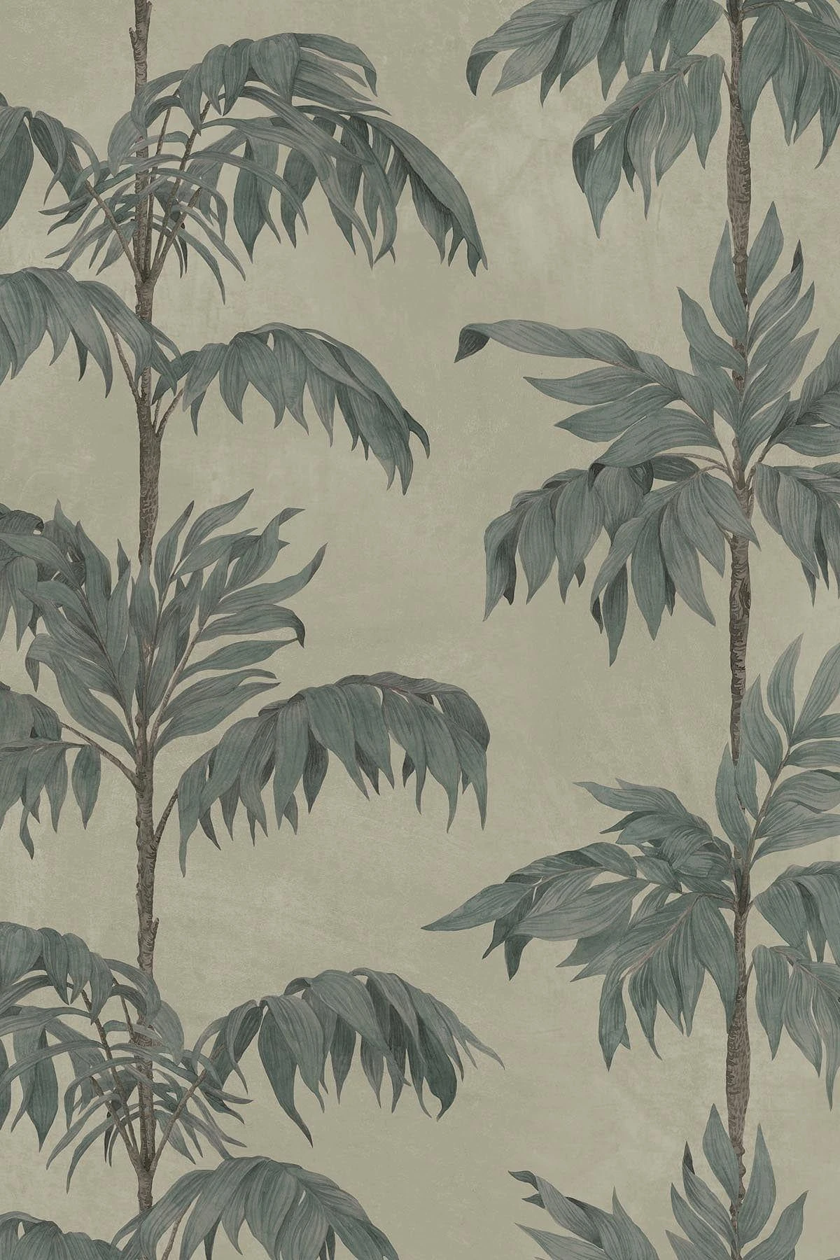 This vintage inspired wallpaper captures the essence of the structure of a palm tree with its natural characteristics. The detailing of the palm leaves gives a naturalistic appearance and makes you want to dream about a Tropical beach far away with its warm sandy beaches and the botanical leaves blowing in the wind.