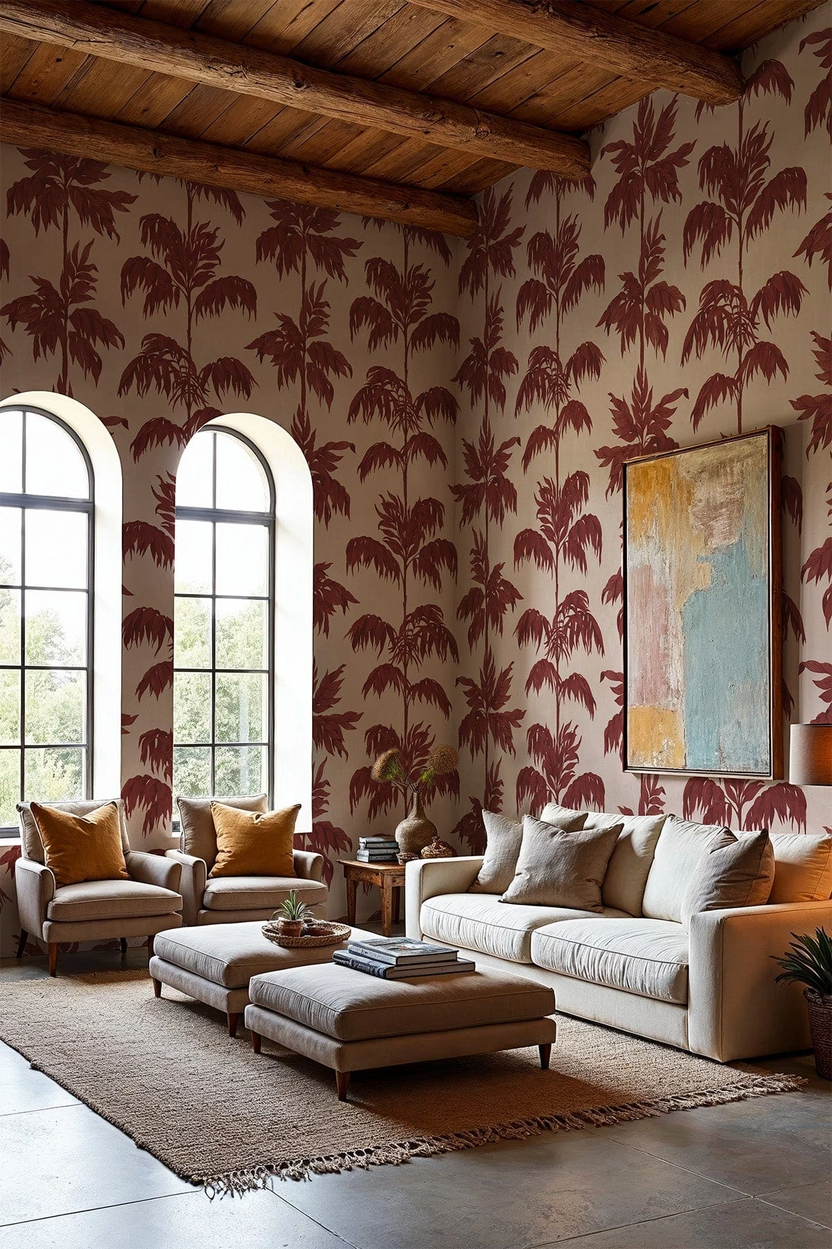Transform your space into a tropical retreat with our vibrant Vintage Palm Tree design. Featuring a soft pink background and delicate burgundy palms, this design evokes the essence of exotic elegance and a Caribbean vibe. The warm, playful tones bring to mind sunsets over serene waters, a place where every day feels like a vacation. The wallpaper’s sophisticated yet eclectic style creates the perfect balance of energy and tranquility in any room.