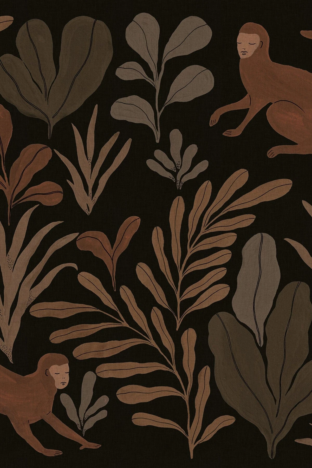 Our Wild Foliage wall mural in black – A captivating design features a lush jungle scene against a dramatic black backdrop. Rich earthy tones and vibrant greens bring the foliage to life, while playful monkeys add a whimsical touch to the mural. This wall mural is sure to infuse your living room with a sense of adventure and wonder.