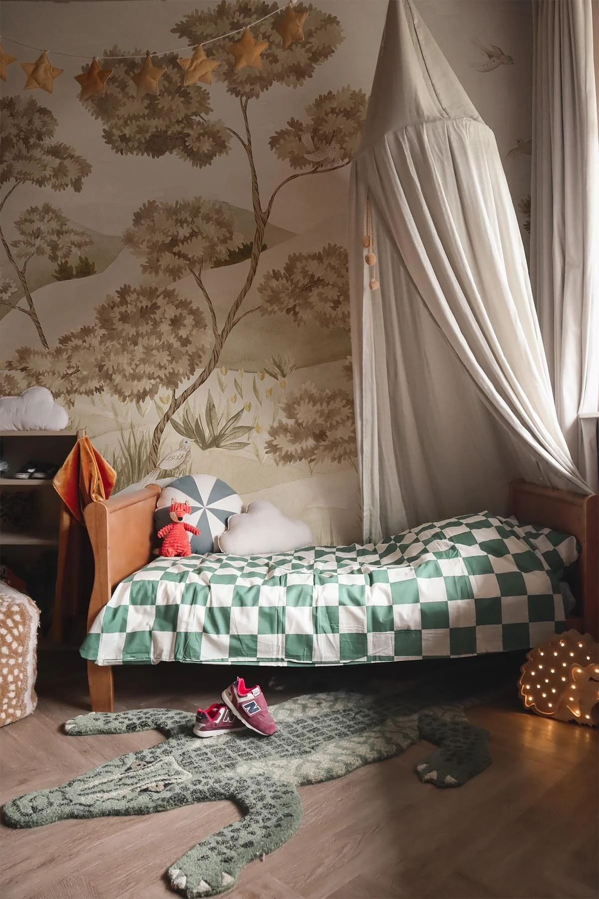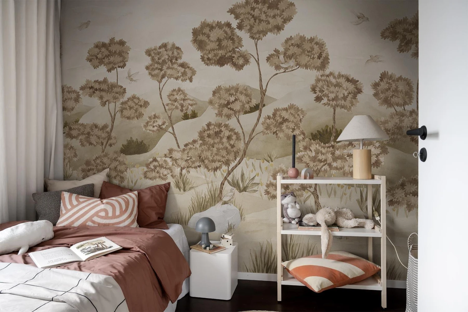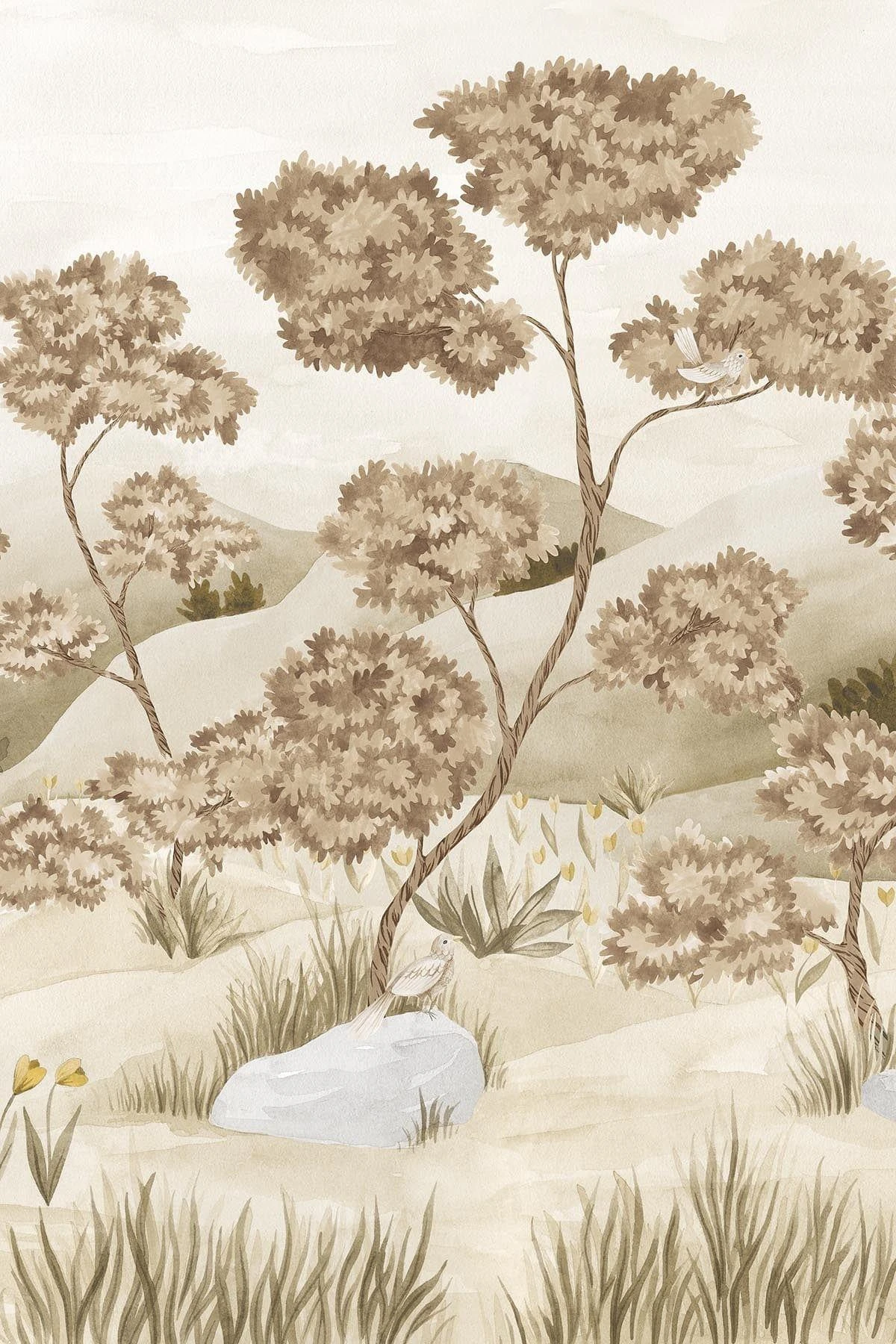 Infuse your home with enchantment through our playful Woodland Birds kids wall mural. A fanciful version of our recent Woodland Forest design. Find yourself in the serene landscape of a forest, brought to life with charming hand-painted embellishments in the form of birds, rolling hills, and delicate flowers. The tranquil, verdant green tones will infuse any child’s room with a feeling of peace and delight.