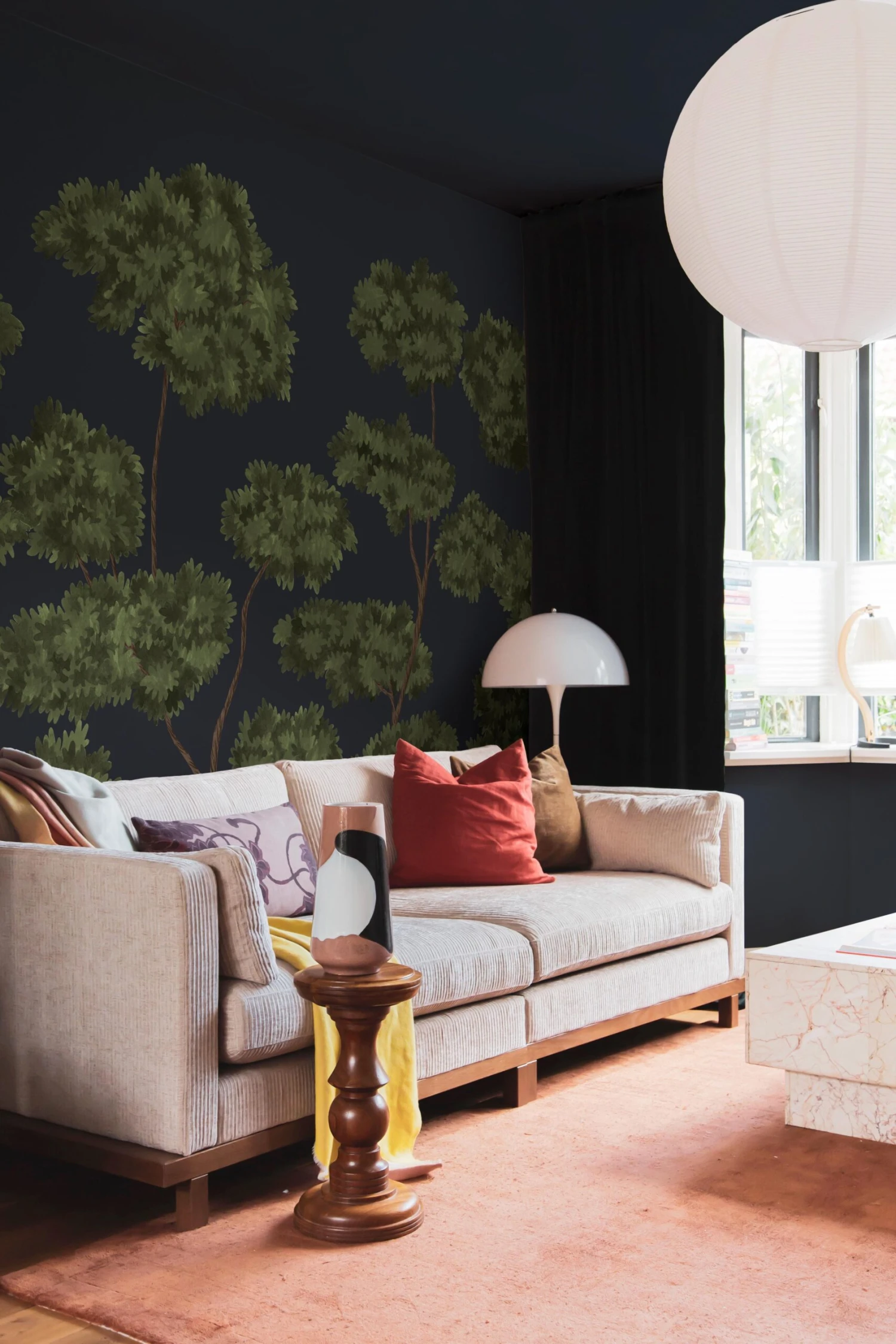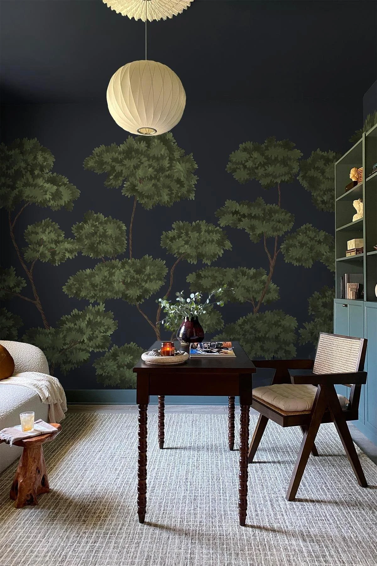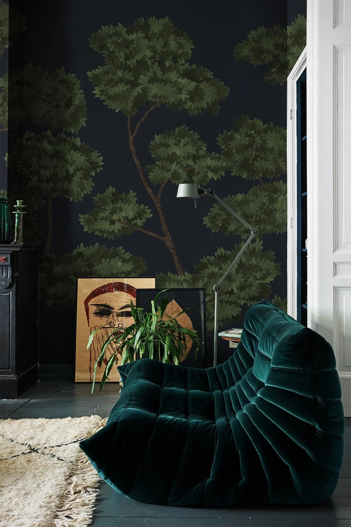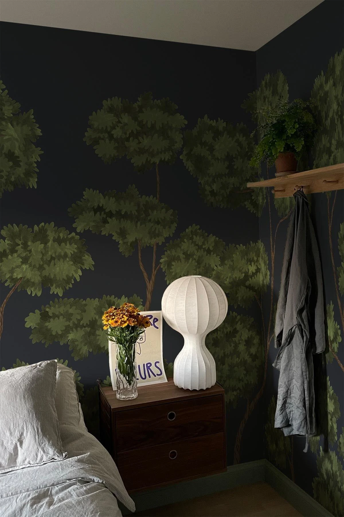 Our Woodland Forest is a simple yet stunning eclectic design, this moody green color also brings nature into the home in the process. Hand painted trees with inspiration from historic tapestries and wallpaper. Rich in depth and details with a variety of tonal colors. Inspired by the historic way of capturing vegetation it features the tree´s in a design reminiscent of iconic Forest designs.